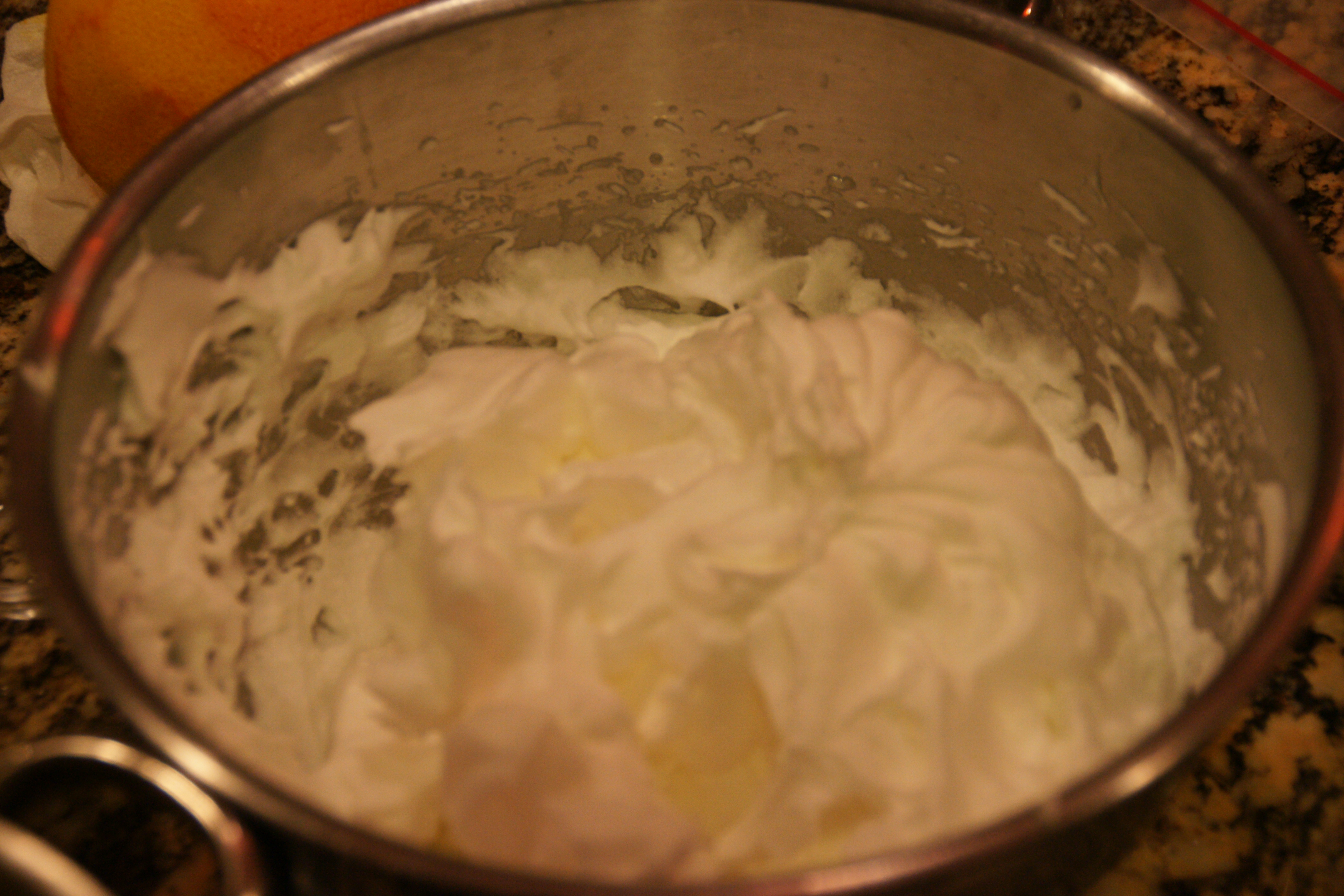 For this version, I turned directly to the Julia Child’s recipe in Mastering the Art of French Cooking; I’ve modified the recipe slightly, e.g., just orange zest instead of sugar cubes– do they even produce sugar cubes these days? A soufflé, whether sweet or savory, is a two-part process. First you make the base; flour and milk are thickened together, then enriched with egg yolks, butter and flavorings. Then you beat egg whites with a little sugar until they’re stiff, and add them quickly to the base. It’s important to remember to first add just a little bit of the egg whites to lighten the base before adding the rest of the whites.