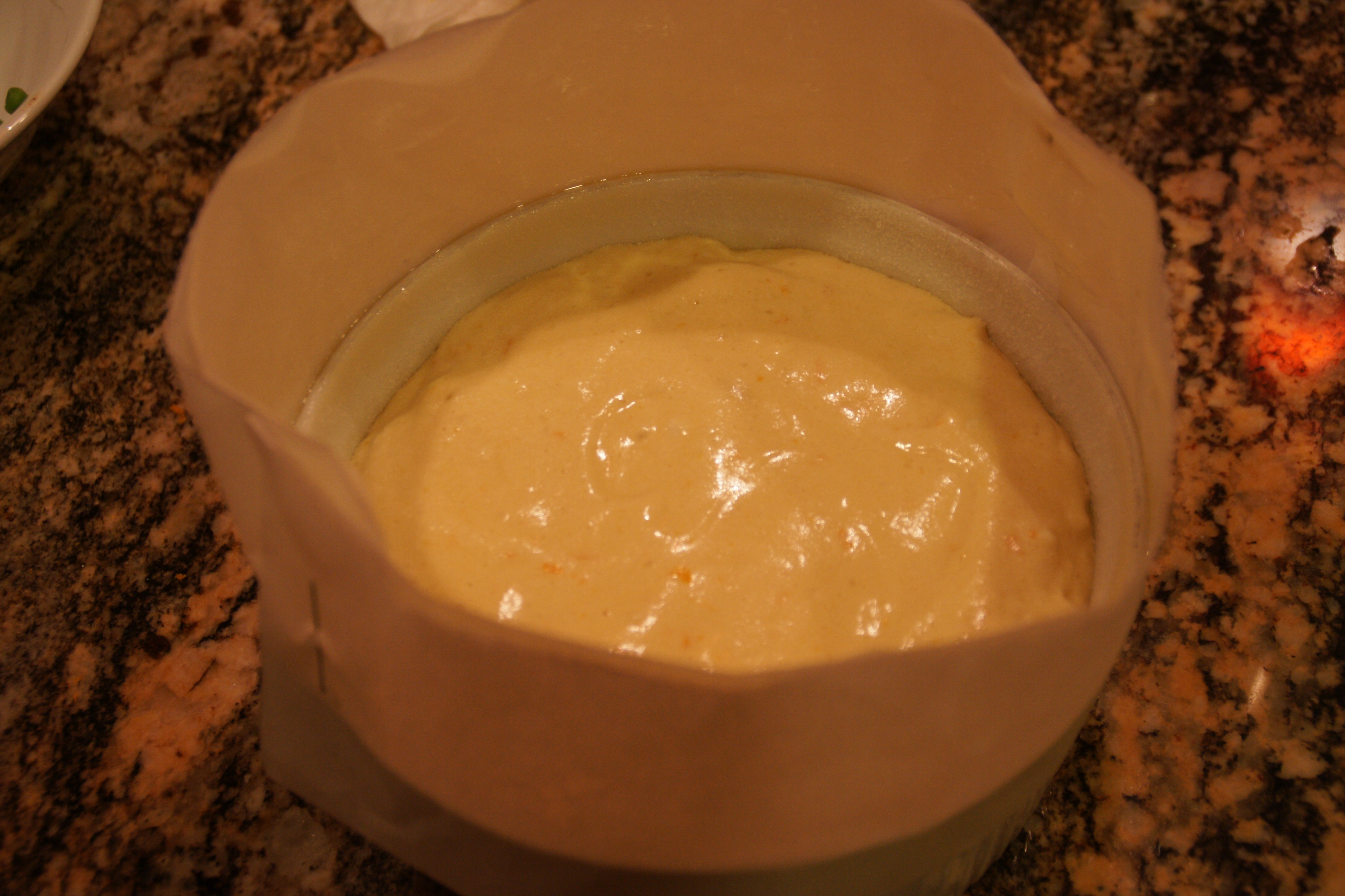 Make sure there is at least 1 1/2 inches between the surface of the souffle mixture and the rim of the dish (if there’s not enough room, the souffle will spill over the rim while baking– yuck). As you can see, I didn’t have enough headroom, so I had to make a collar out of parchment paper. All I did was take a couple of straight pins (don’t tape as the oven is FOUR HUNDRED degrees) to attach the pieces of parchment together to make a long strip, then sprayed one side with cooking spray (which would be the “inside” of the collar). I used another set of pins to connect the ends. (By the way, you can get to this step and wait up to an hour before baking–BUT remember to cover the souffle with a pot).