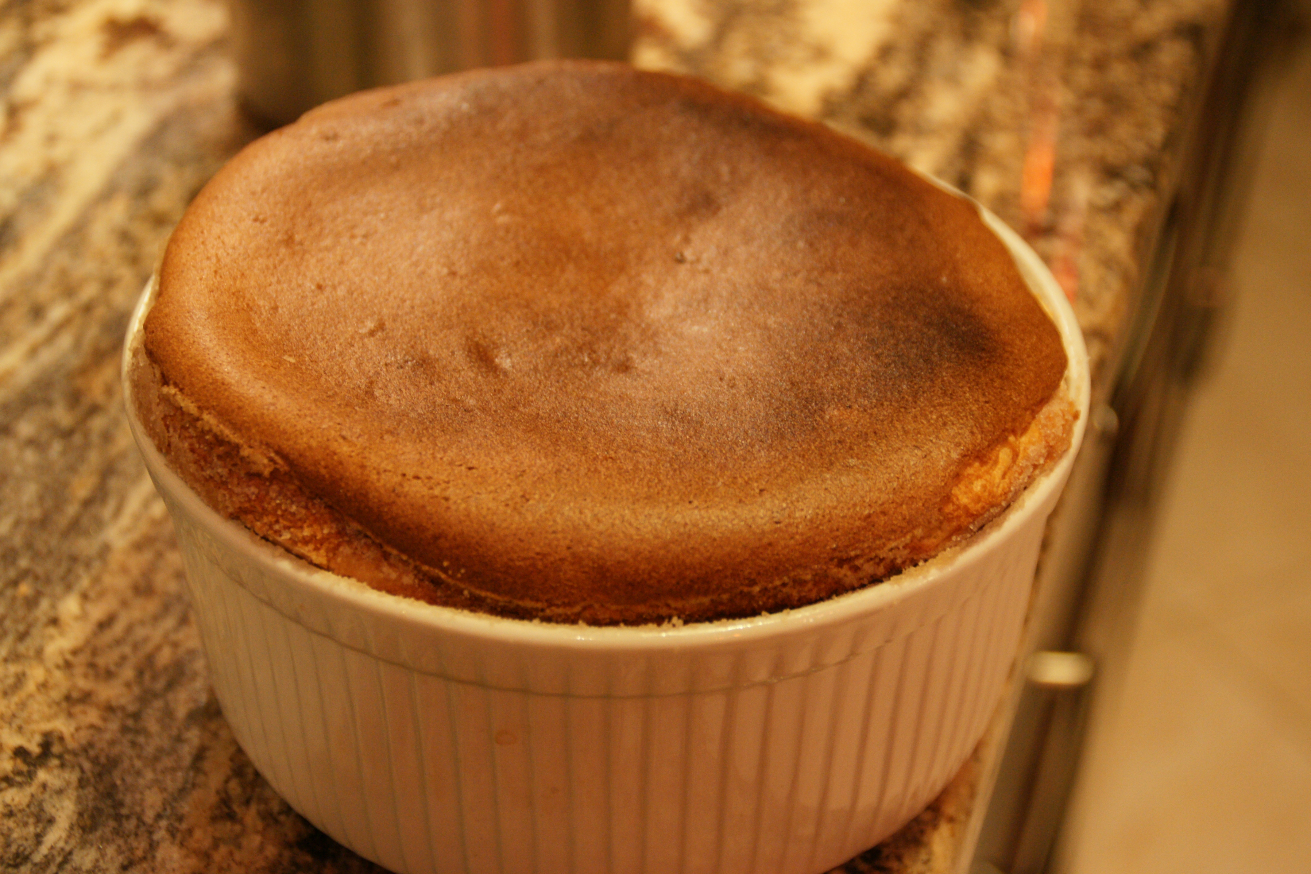 Bake in the preheated oven for 30 to 35 minutes. Test to see if the souffle is done by inserting a thin knife into the center of the souffle; if it comes out clean, the souffle is done. Serve immediately if you want the presentation effect. (Clearly I did not).