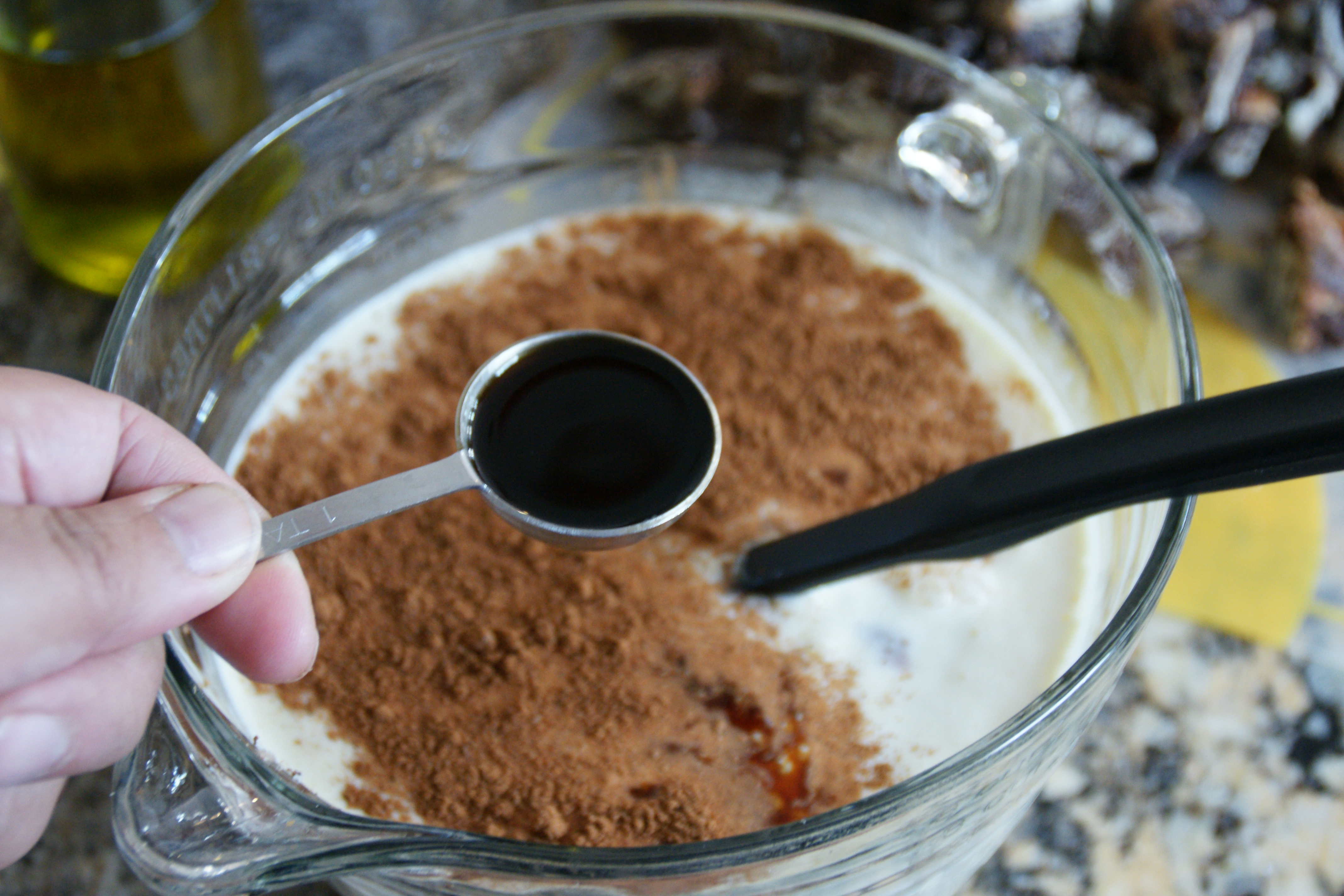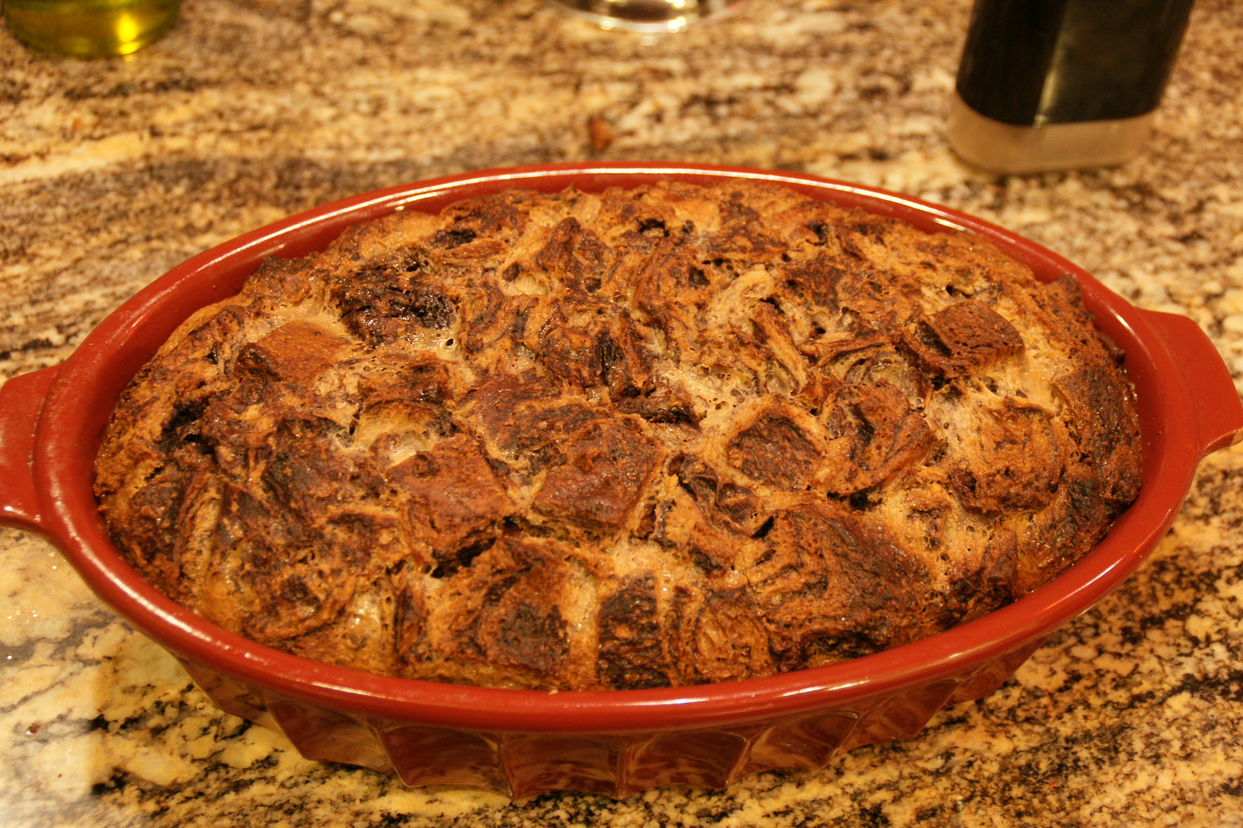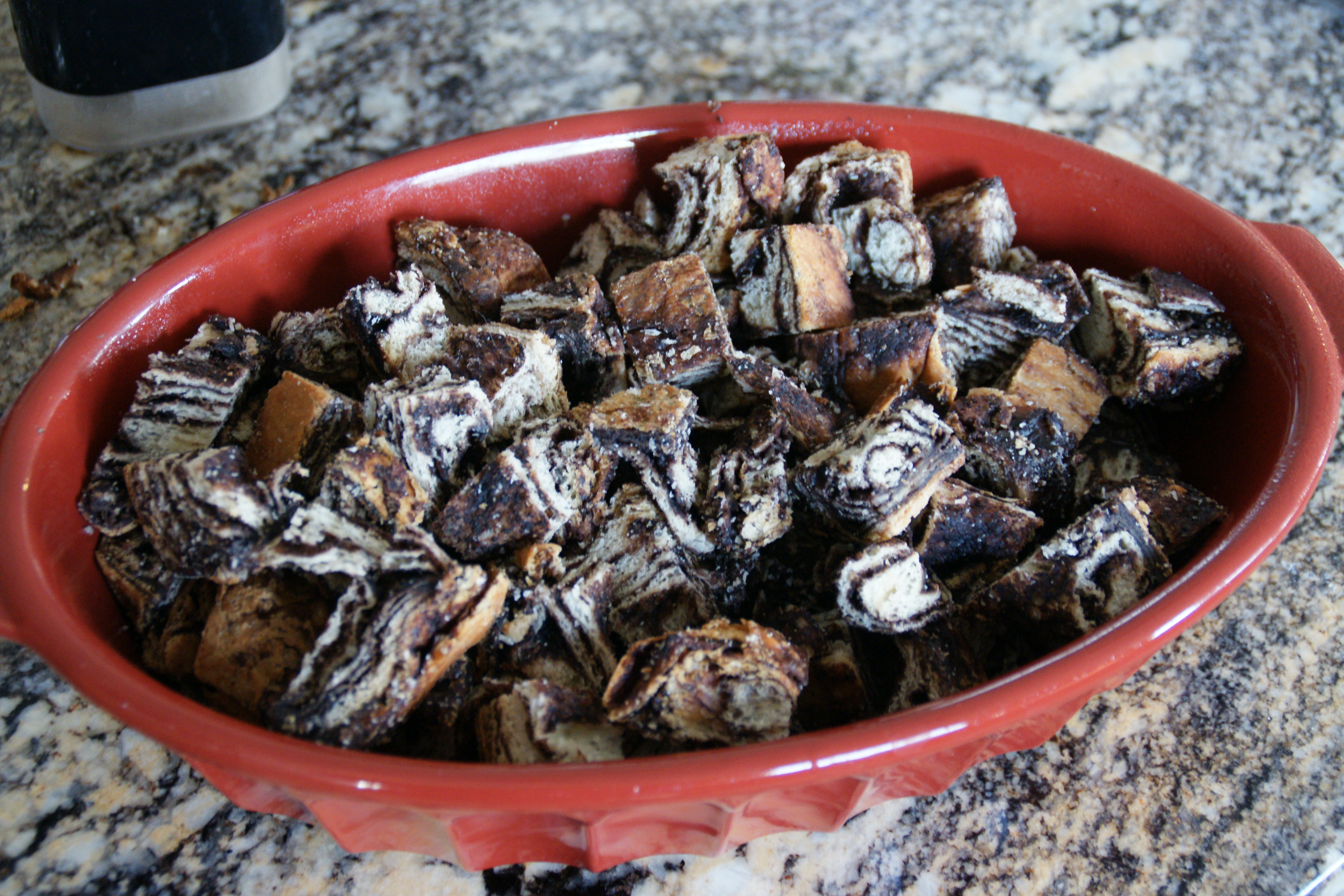 I decided it would be a perfect candidate for bread pudding. Think about that– layers of chocolate and bread, soaked in a custard and baked til fluffy and creamy with a chocolate brown crust. I usually make my bread pudding from a one pound loaf of French bread or challah, so I knew how much eggs and milk to use; I reduced the amount of sugar I used and just for fun, used dark brown instead of regular white granulated sugar. The pudding bakes low and slow for over an hour until a knife slipped into the center comes out clean.