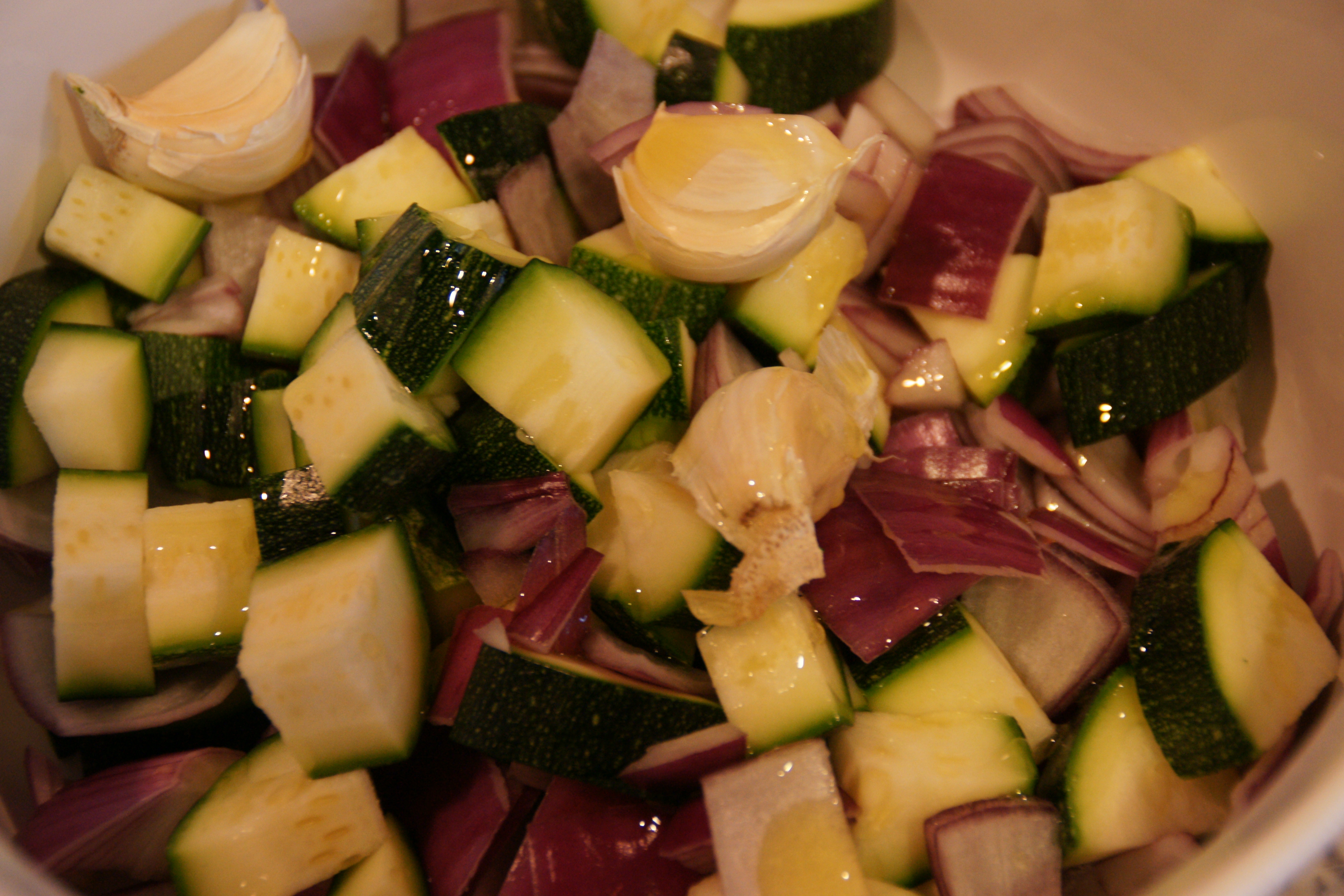 In a large casserole, toss the onion, unpeeled garlic cloves and zucchini with olive oil. Bake for 20 – 25 minutes. Remove the dish from the oven.