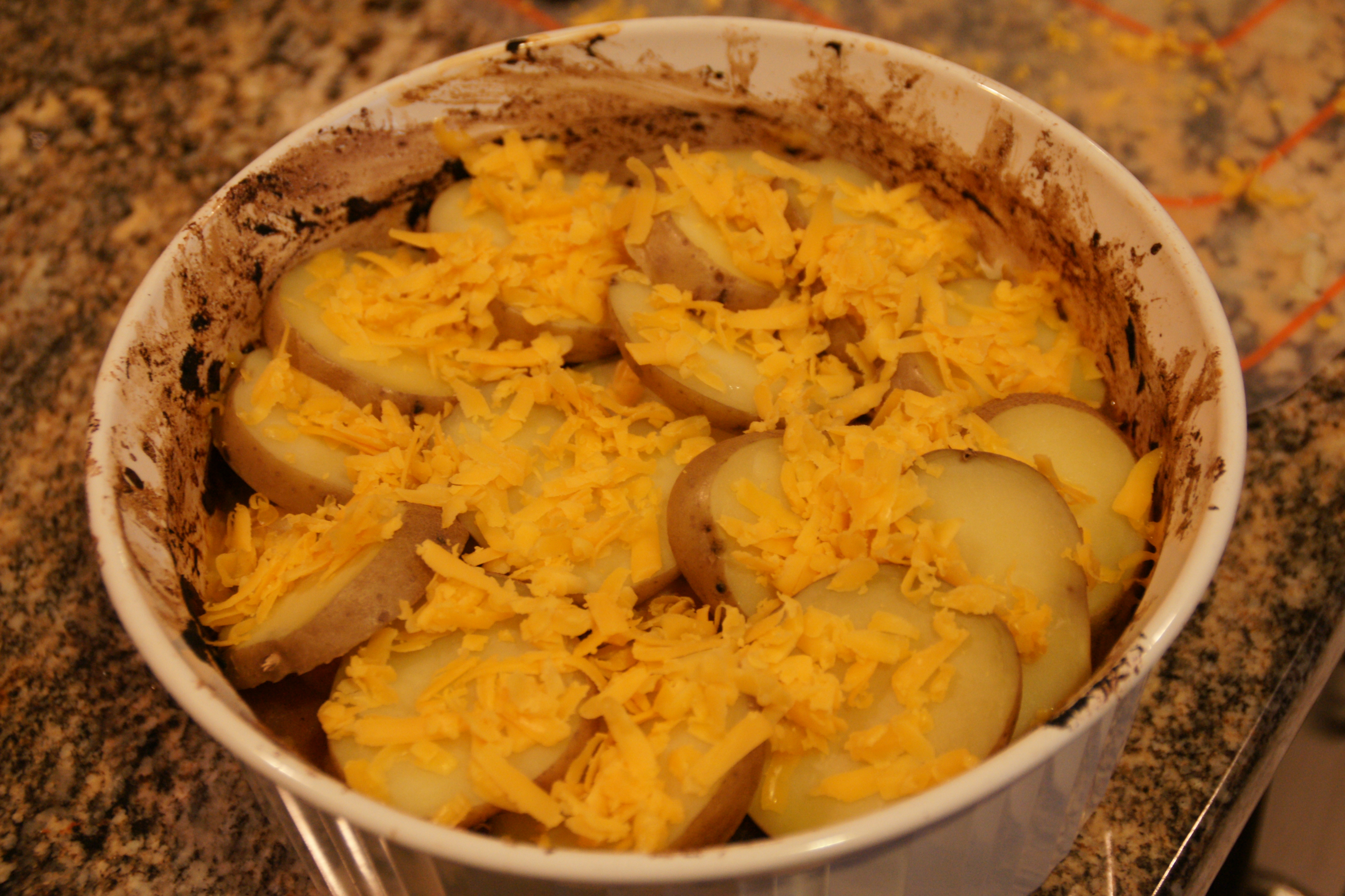 Return the casserole to the oven and bake for 15 to 20 minutes til fish is done (it should flake easily with a fork). Take the dish out of the oven and layer the sliced potatoes across the top. Sprinkle with cheese and