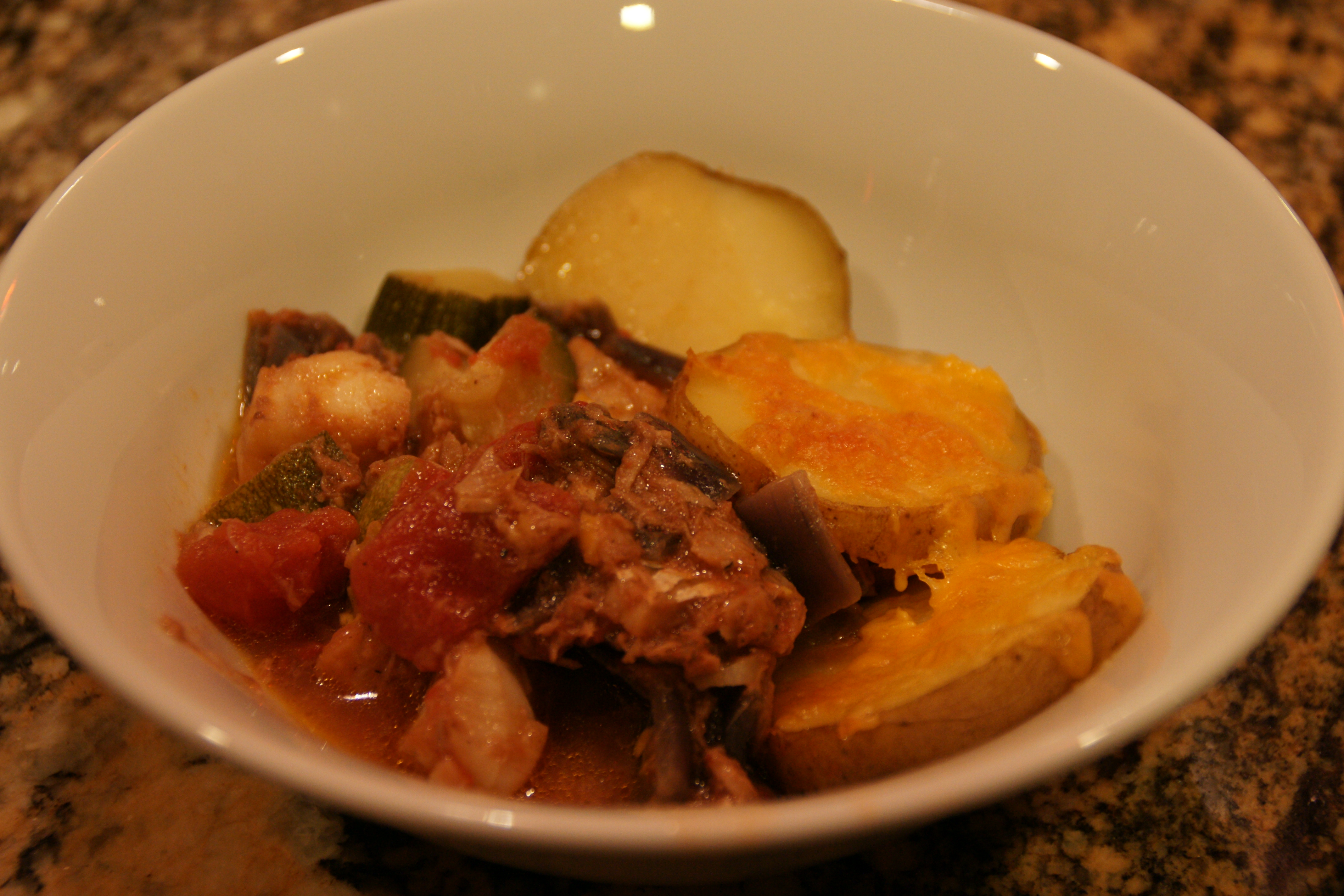 I’ve been recently following a food blogger in the UK– well I assume she’s from the UK from her cooking directions and ingredient names– and decided to make one of her recipes. It’s called a Mediterranean Fish Hot Pot. I was intrigued by the title because I equate “hot pot” with Asian-style fondue where you cook thin slices of meat in a simmering broth, but this was a fish stew made with vegetables, reminding me of Provençal bouillabaisse or San Francisco cioppino. Always the English major, I decided to google the definition to see if perhaps “hot pot” was unique to the UK, and I found it was:
