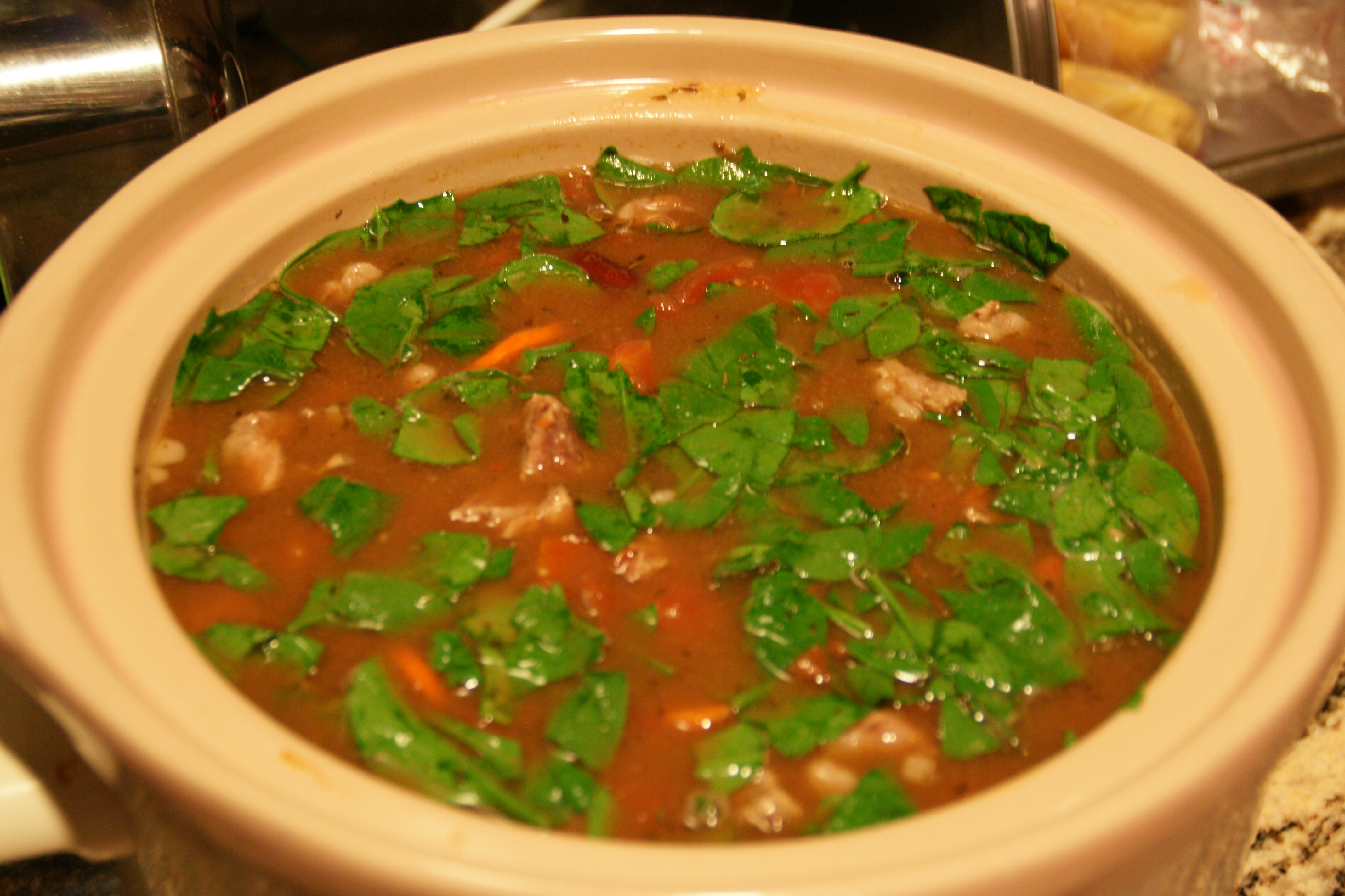 You can find the original minestrone recipe here; the only changes I made were to use beef broth in a carton (Pacific, my go-to brand), baby spinach instead of summer squash, and to add some additional herbs– bay leaf, and thyme.