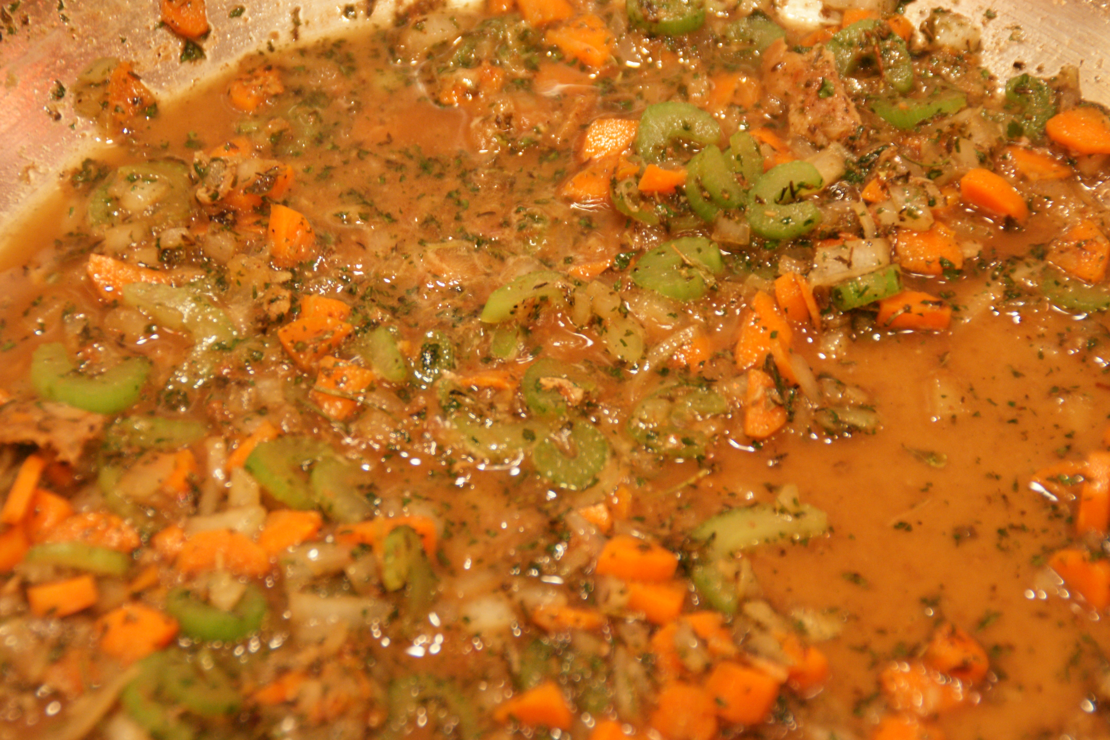 In the same sauté pan, add the celery, carrots and onion. Cook until softened and slightly brown. Add the wine and herbs to deglaze the pan.