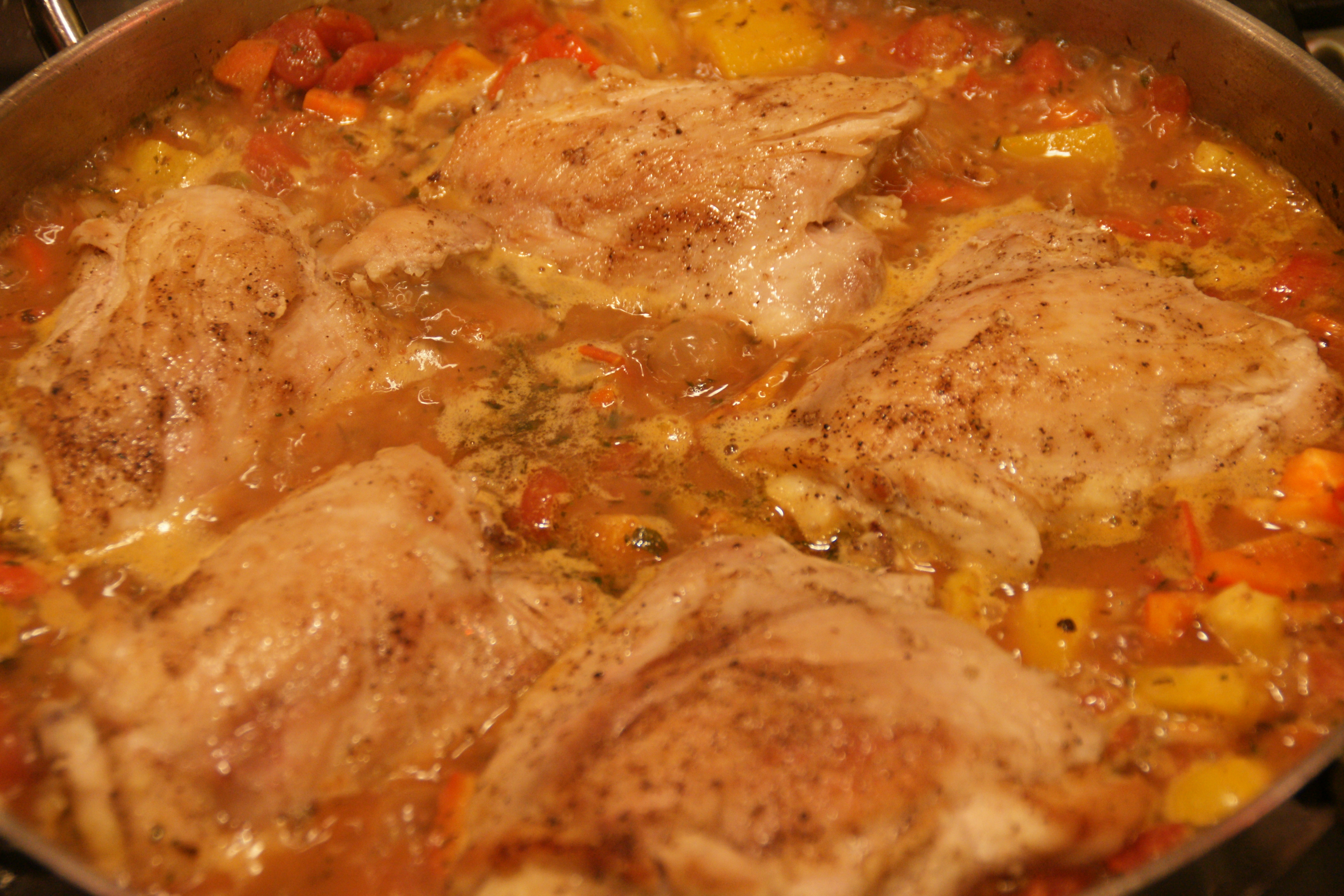 Going back through my freezer, I found a pack of bone-in chicken thighs; I also had a big pack of sweet peppers that I was pretty sure wouldn’t make it to Friday, despite my best attempts to pack them into lunches. It was time for another kitchen experiment! I could have made chicken cacciatore, but I lacked any instant polenta and wasn’t in the mood for stirring cornmeal for 45 minutes. Roman-style chicken was also out since we ate the last of the bacon over the weekend.