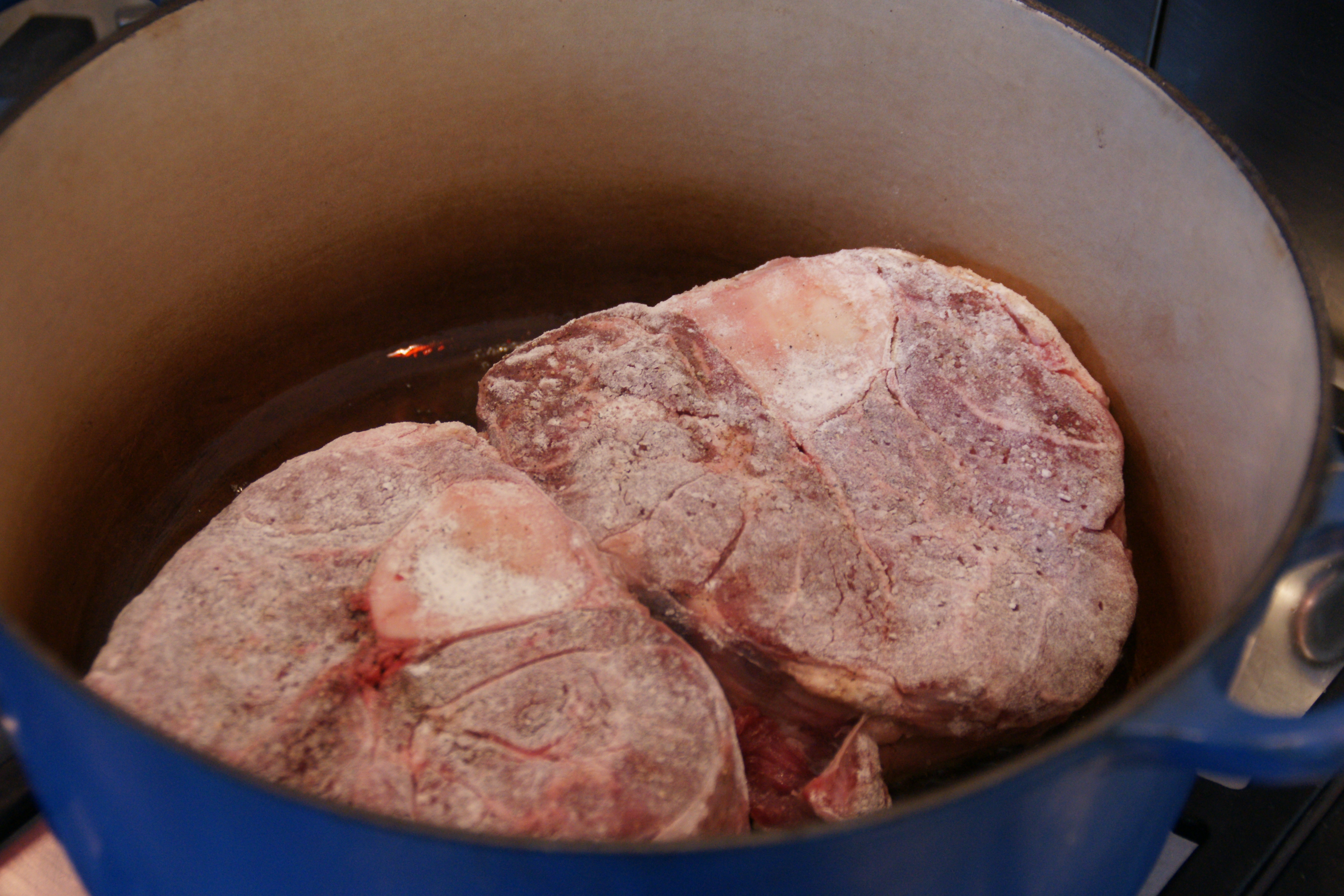 Heat some oil in a heavy Dutch oven (our standard is Le Creuset); when the oil begins to smoke, add the shanks,