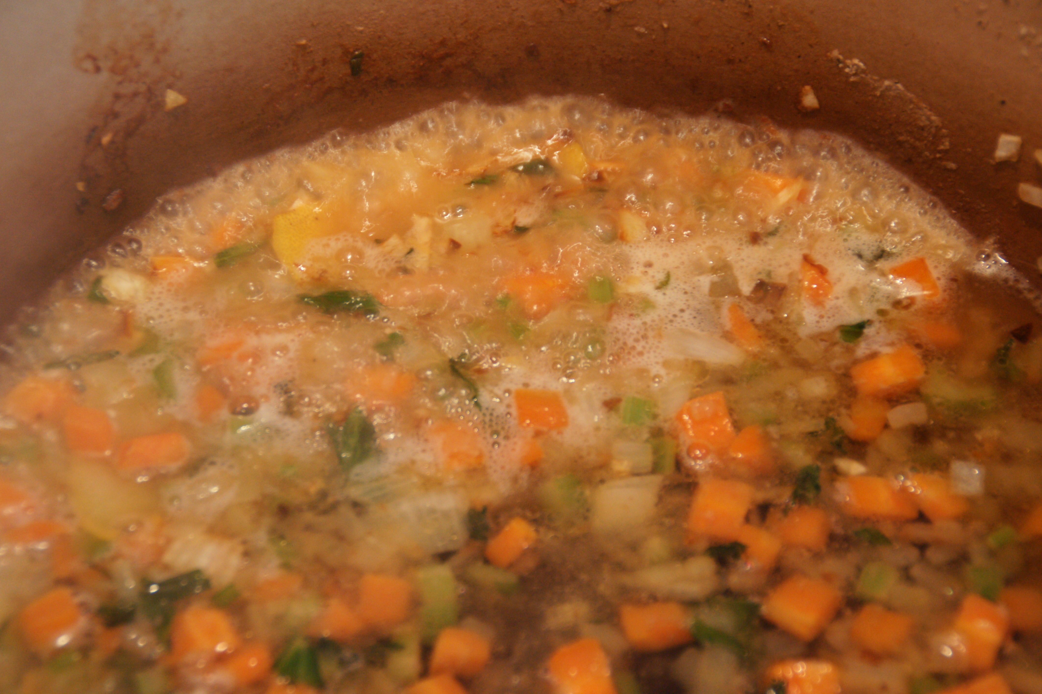 Add the vegetables and saute until softened. (Kurt browns his a bit).