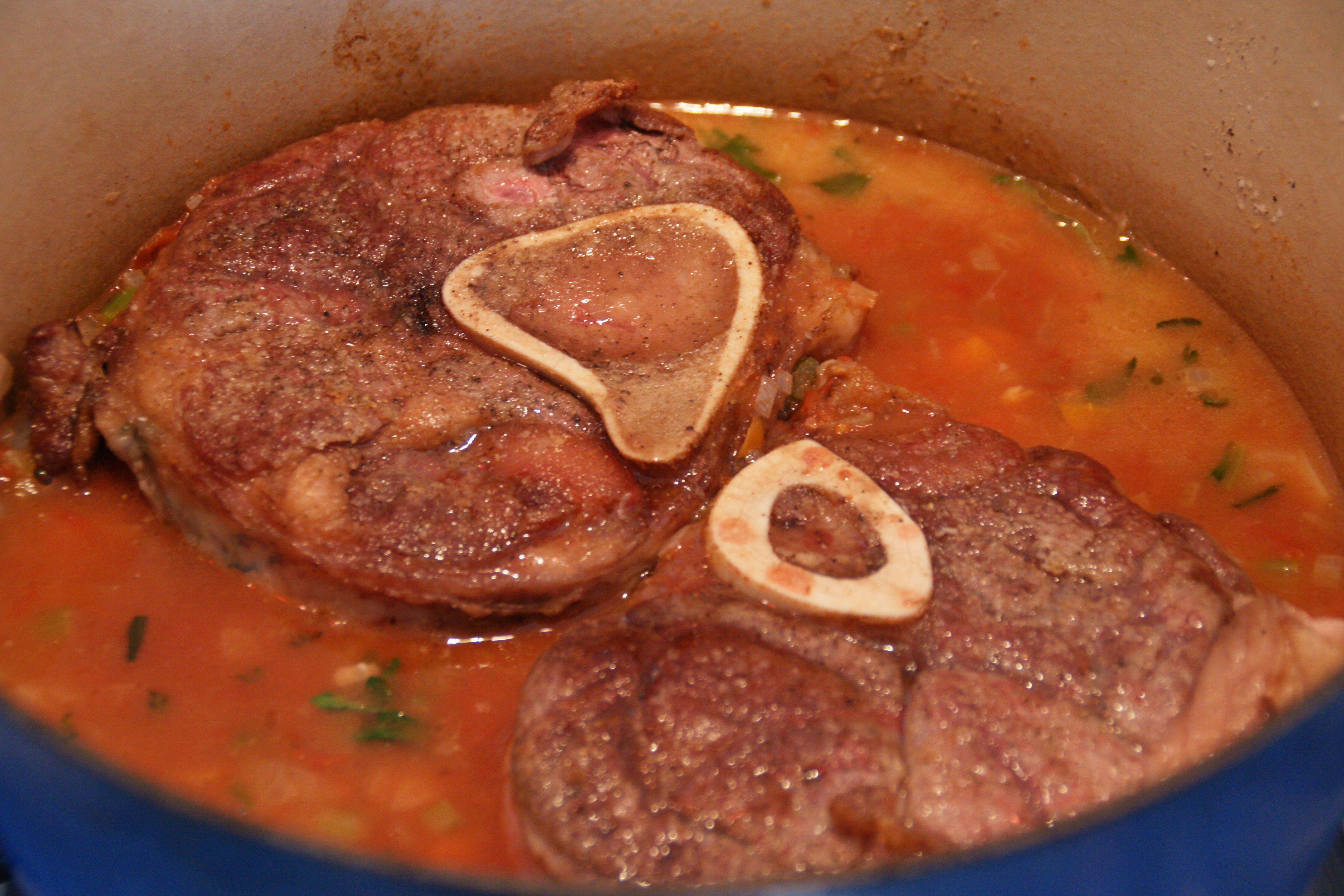 We veer slightly from Marcella’s technique where you prepare the vegetables and braising liquid in the main pot and brown the flour-dredged shanks in a separate pan. We both brown the shanks in oil in the main pot, pour off the oil and then add the butter to saute the vegetables. Call us lazy, but we say we’re efficient!