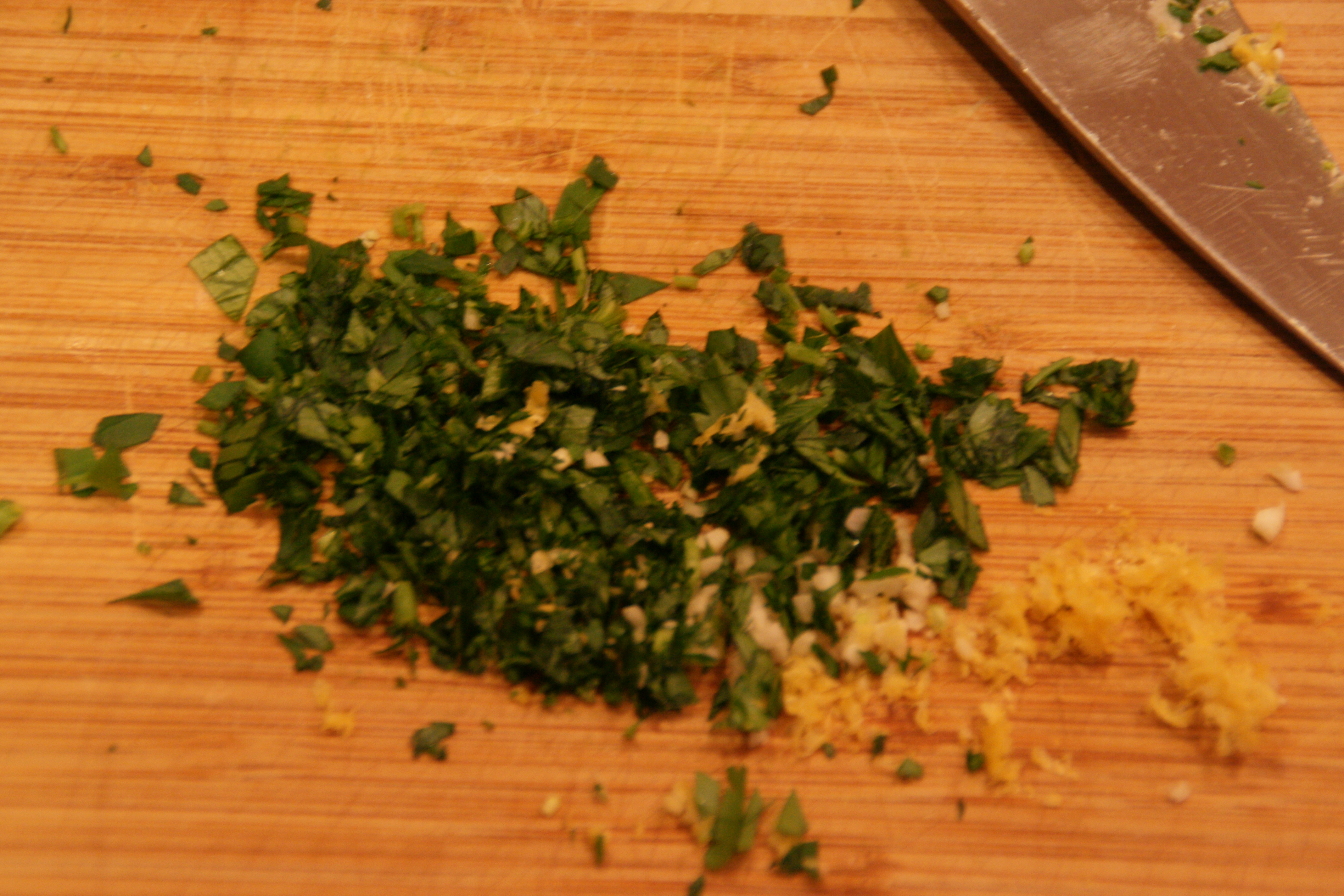 Mix together the parsley, lemon zest and garlic for the gremolata and,