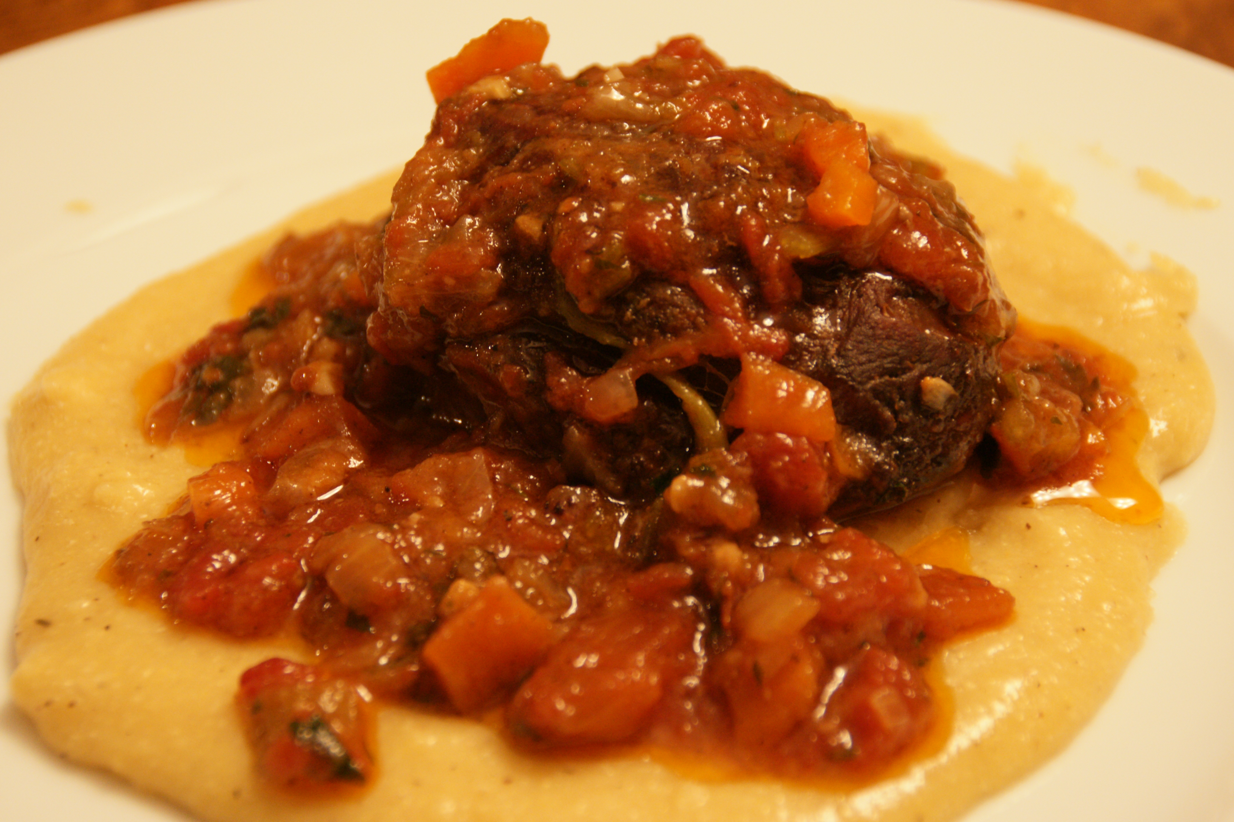I dug deep into that basement freezer of ours and pulled out a pack of beef shanks from a local farm, and figured it had been a while since I made osso buco. While these beef shanks are considerably larger than veal, they braise just as well. Cornmeal, chicken stock, bay leaf, thyme and a few grindings of pepper would transform into soft, creamy polenta– the perfect accompaniment!