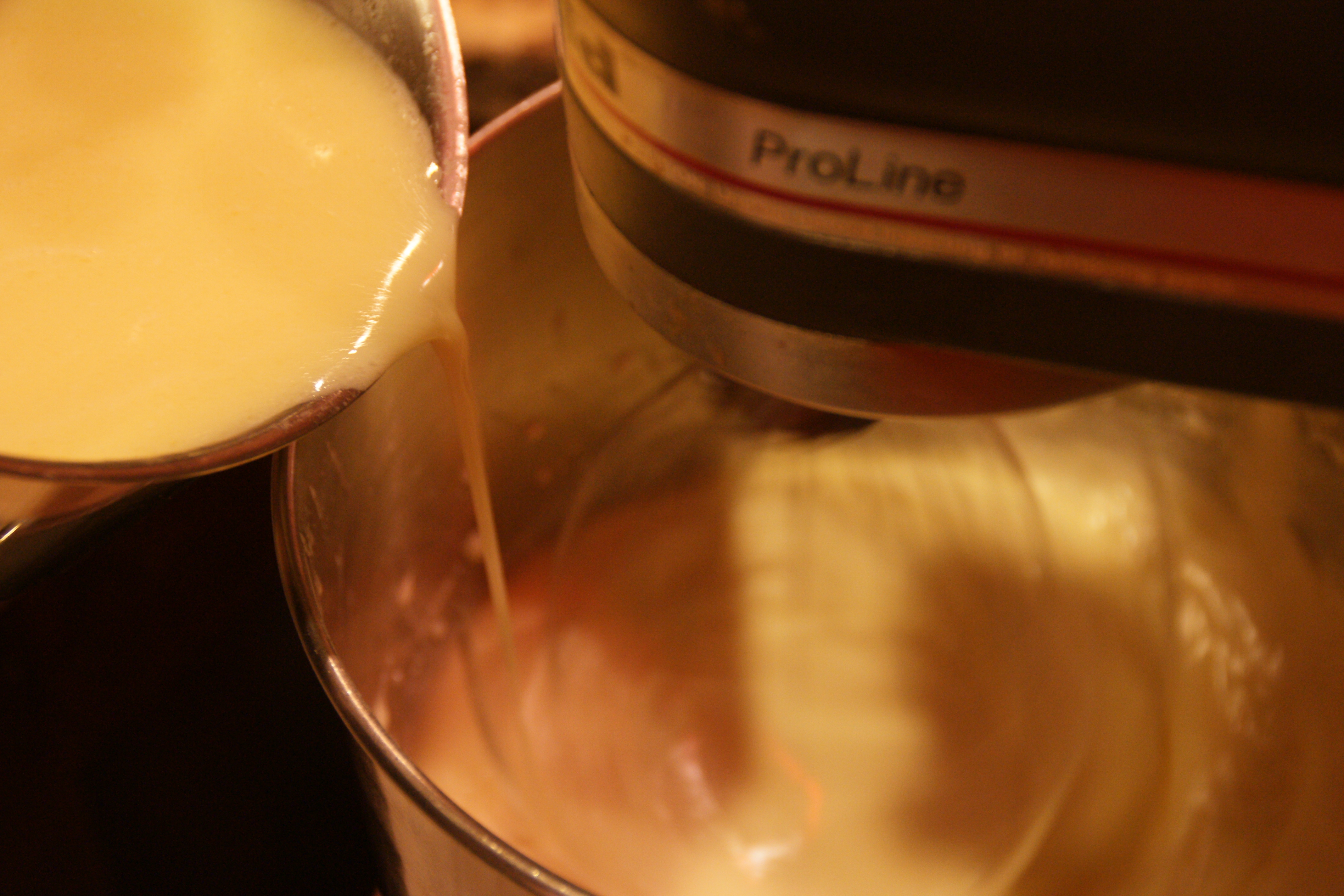 While the mixture is beating, heat the milk and butter in a small pan over low heat until butter has melted the mixture is hot. Remove the mixture from heat and stir in the vanilla. When eggs are ready, reduce the mixer to slow and add the milk/butter mixture.