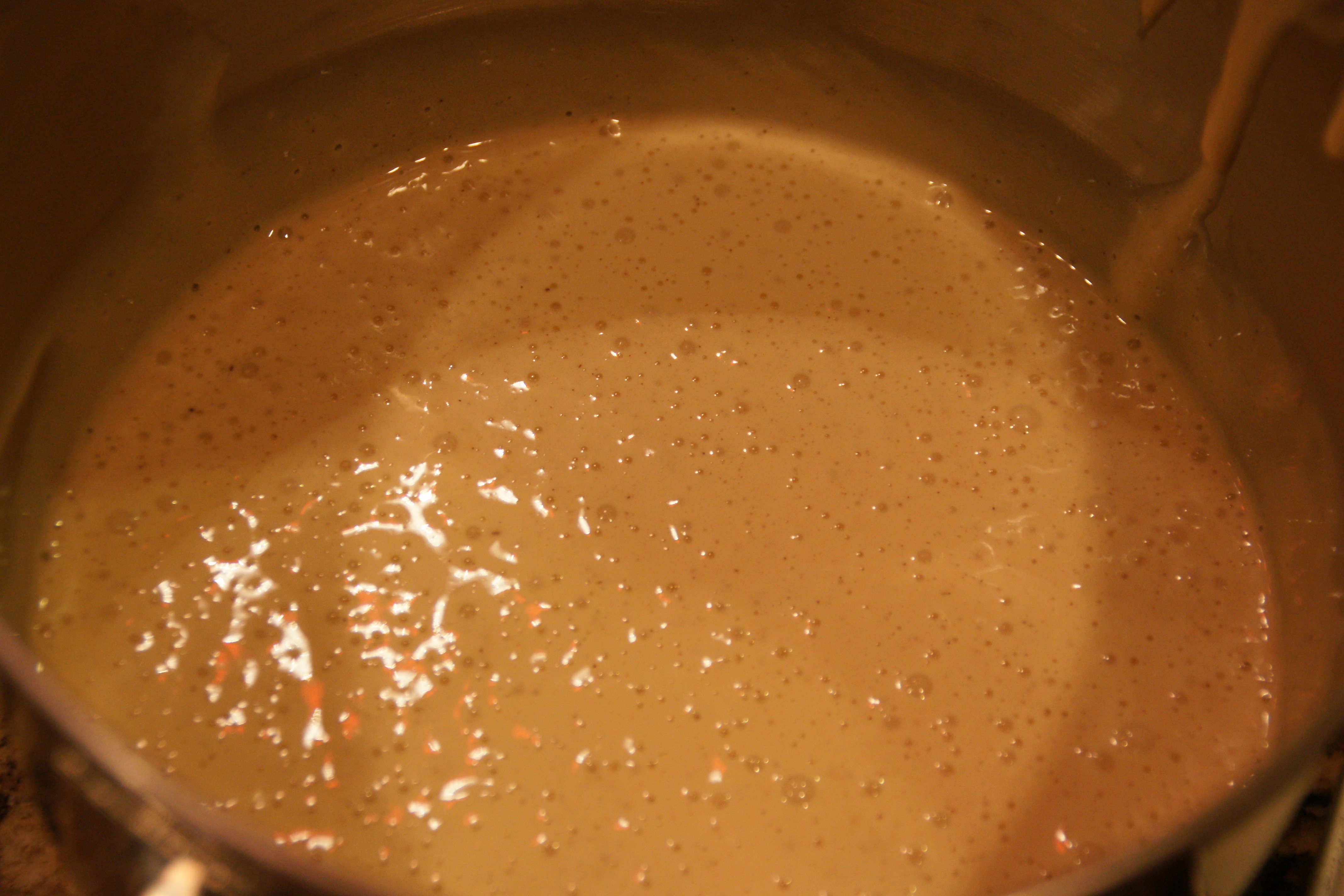 Slowly whisk in the cream, vanilla and evaporated milk; set aside to cool to room temperature while you make the cake.