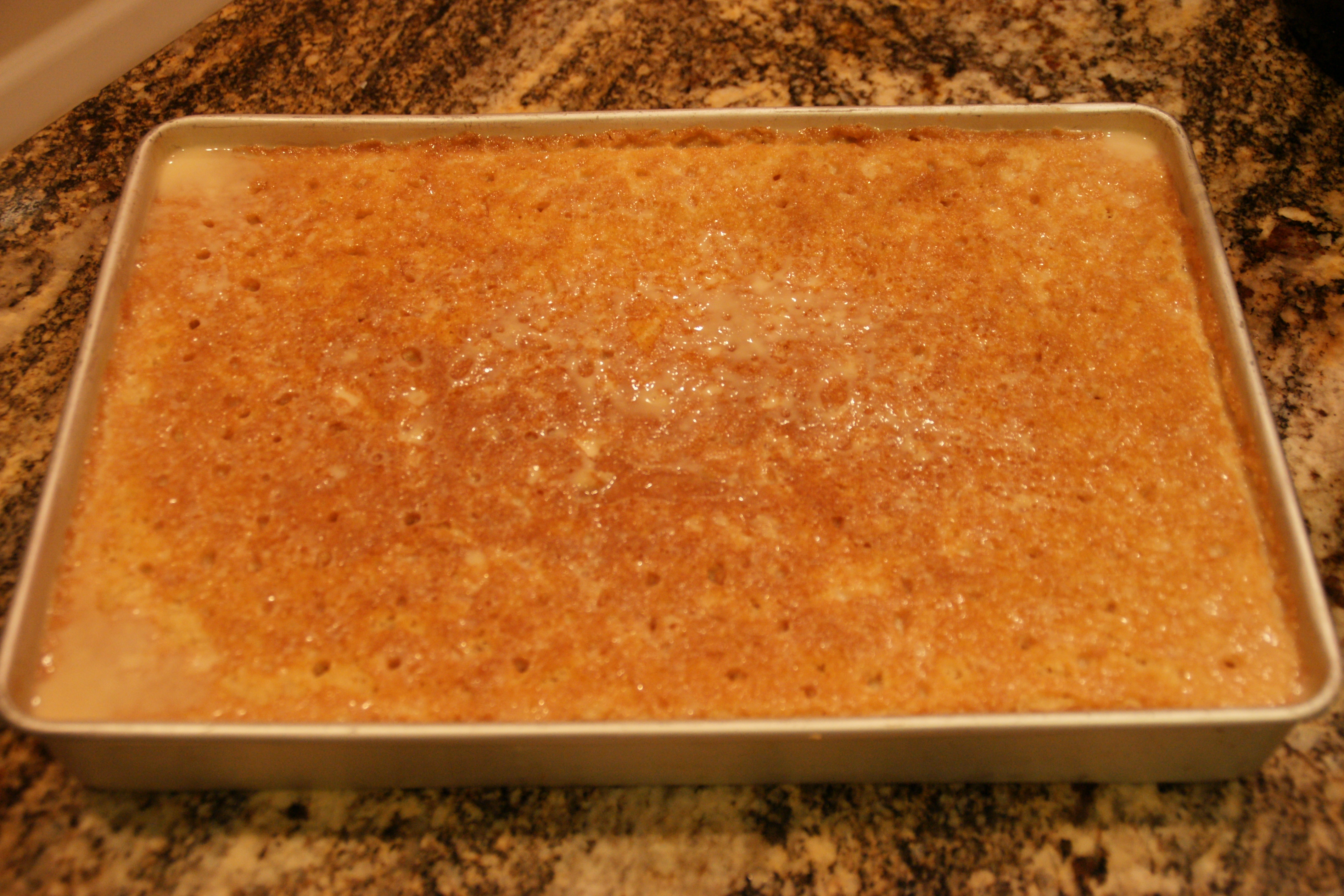 Pour the tres leches liquid over the cake and let sit at room temperature for 15 minutes.