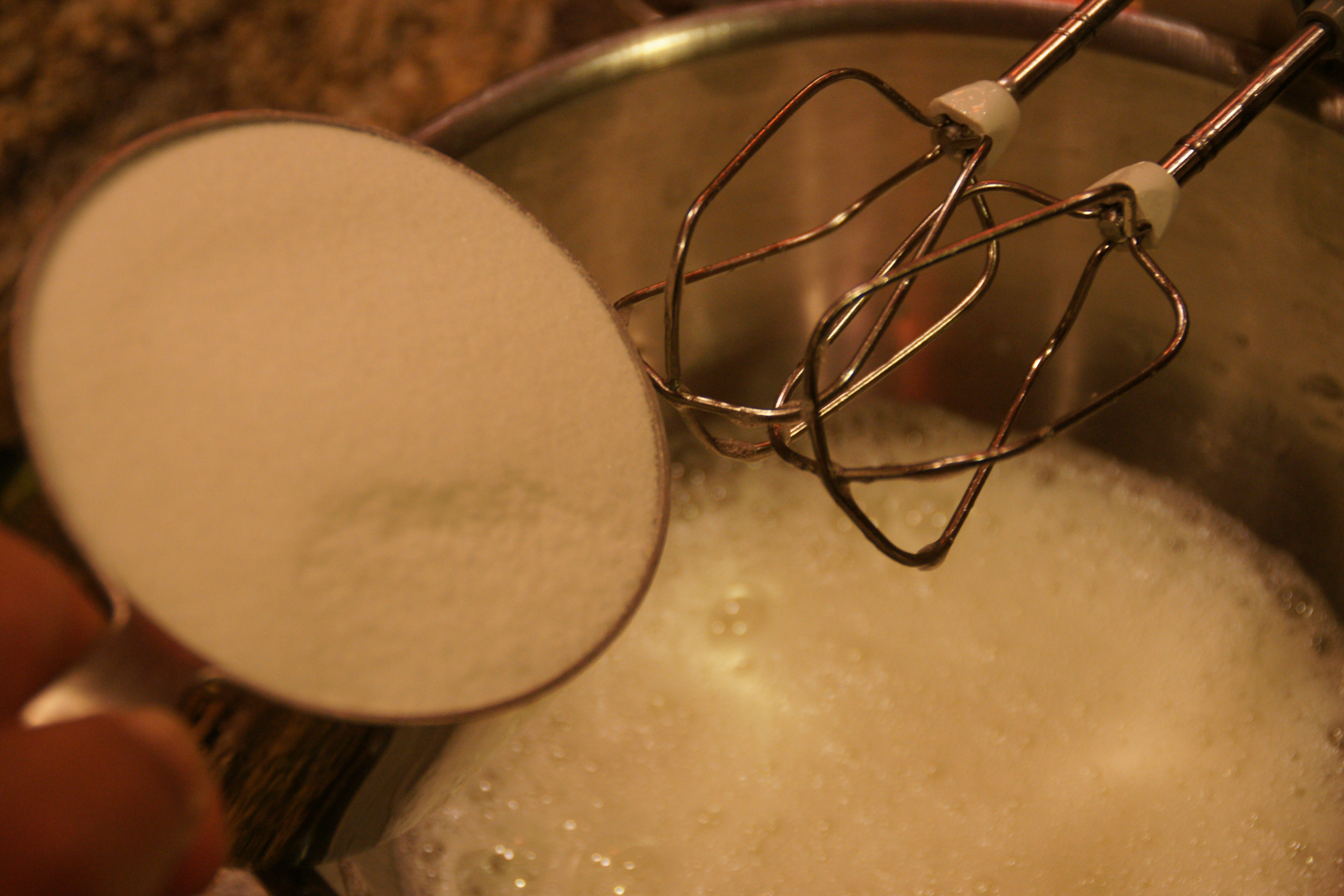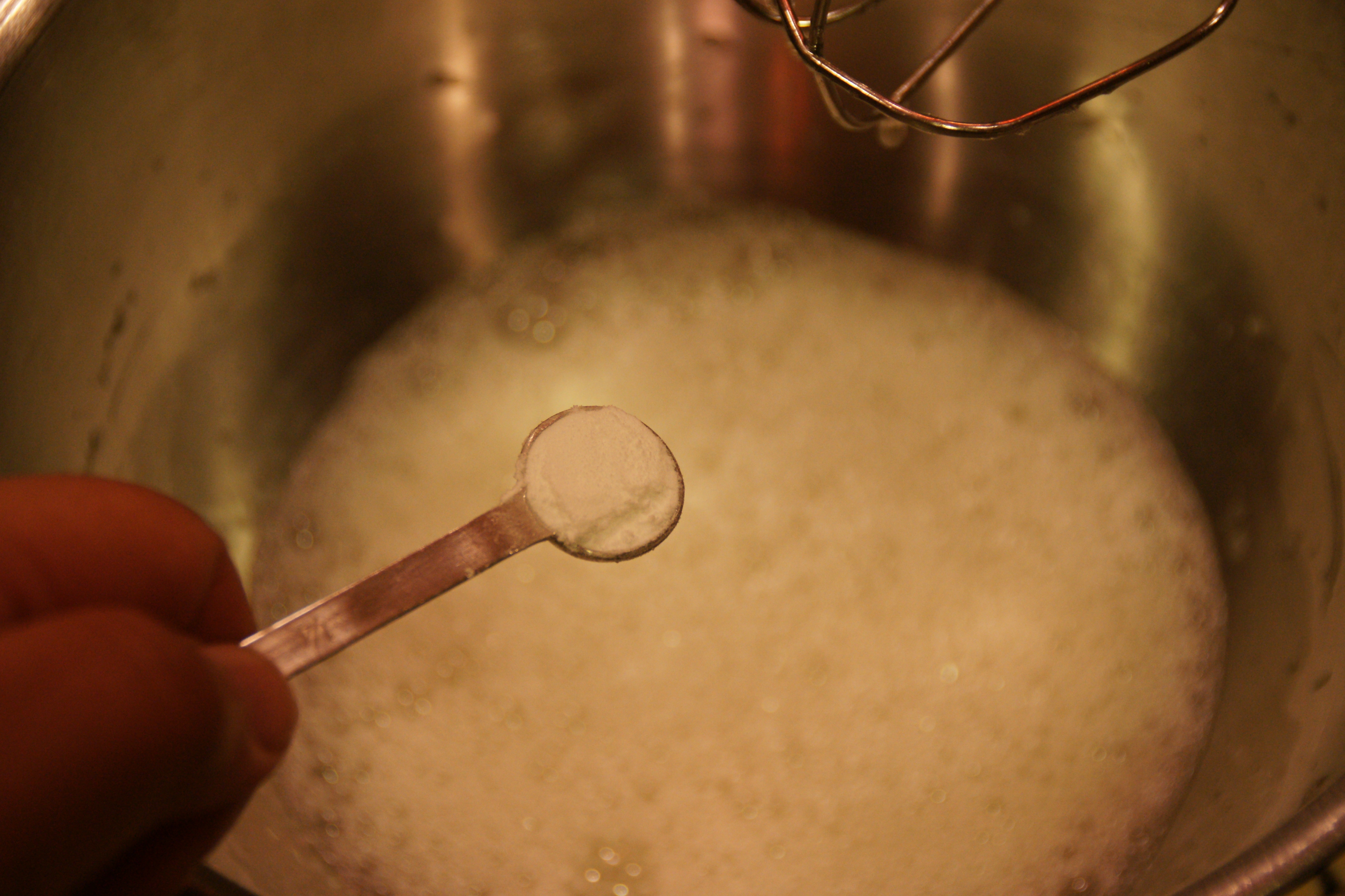 Preheat the oven to 200 degrees (175 degrees if your oven can go that low). Line baking sheets with parchment paper or silicone pads. In a large bowl, beat the egg whites until frothy, then add the cream of tartar and salt. The addition of cream of tartar (an acid) helps prevent the beaten whites from collapsing. (If you need more, find a science geek to explain how the acid slows down the collapsing by slowing down the clumping of protein chains).