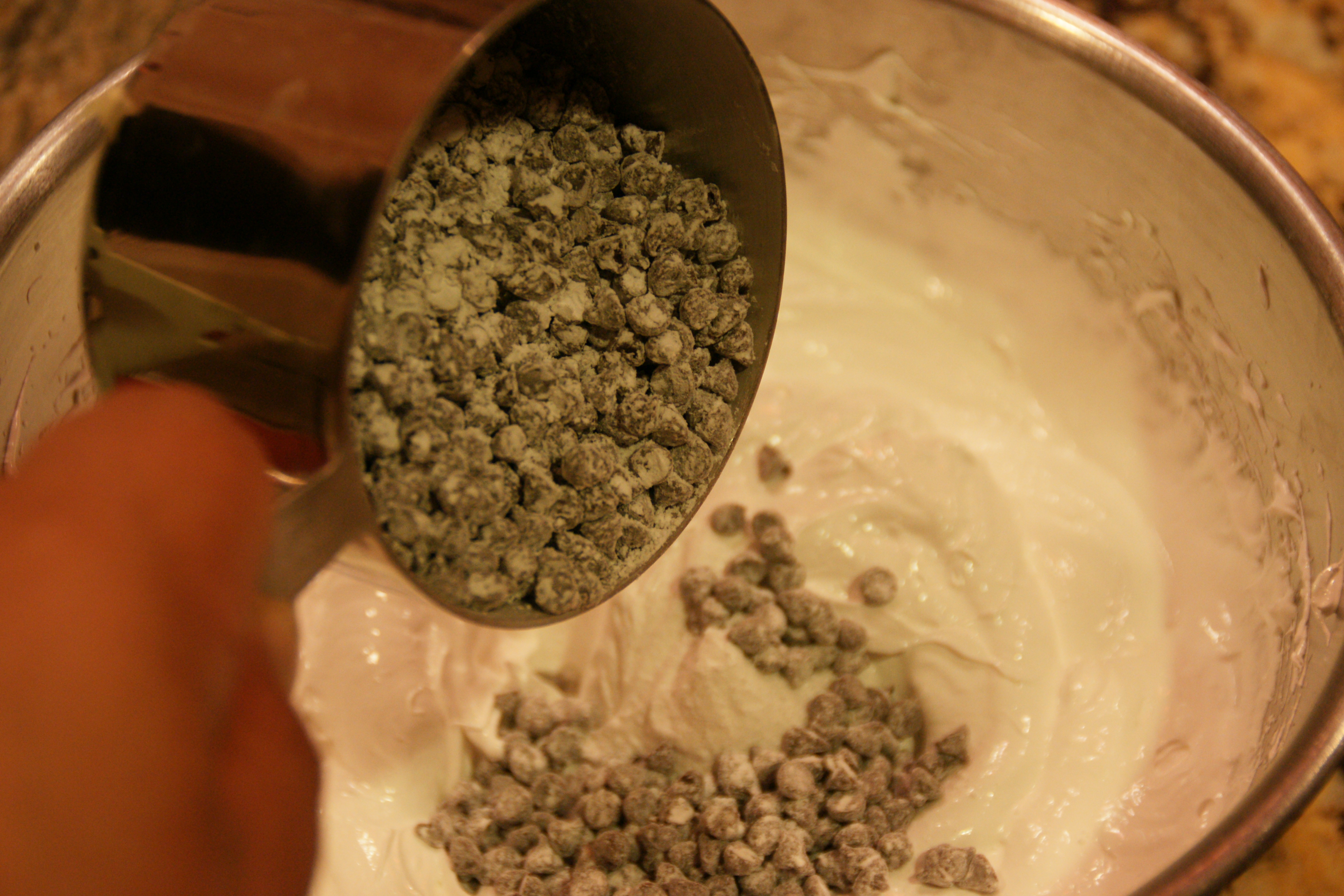 - 1 1/2 c mini chocolate chips, tossed with 1 TB powdered sugar