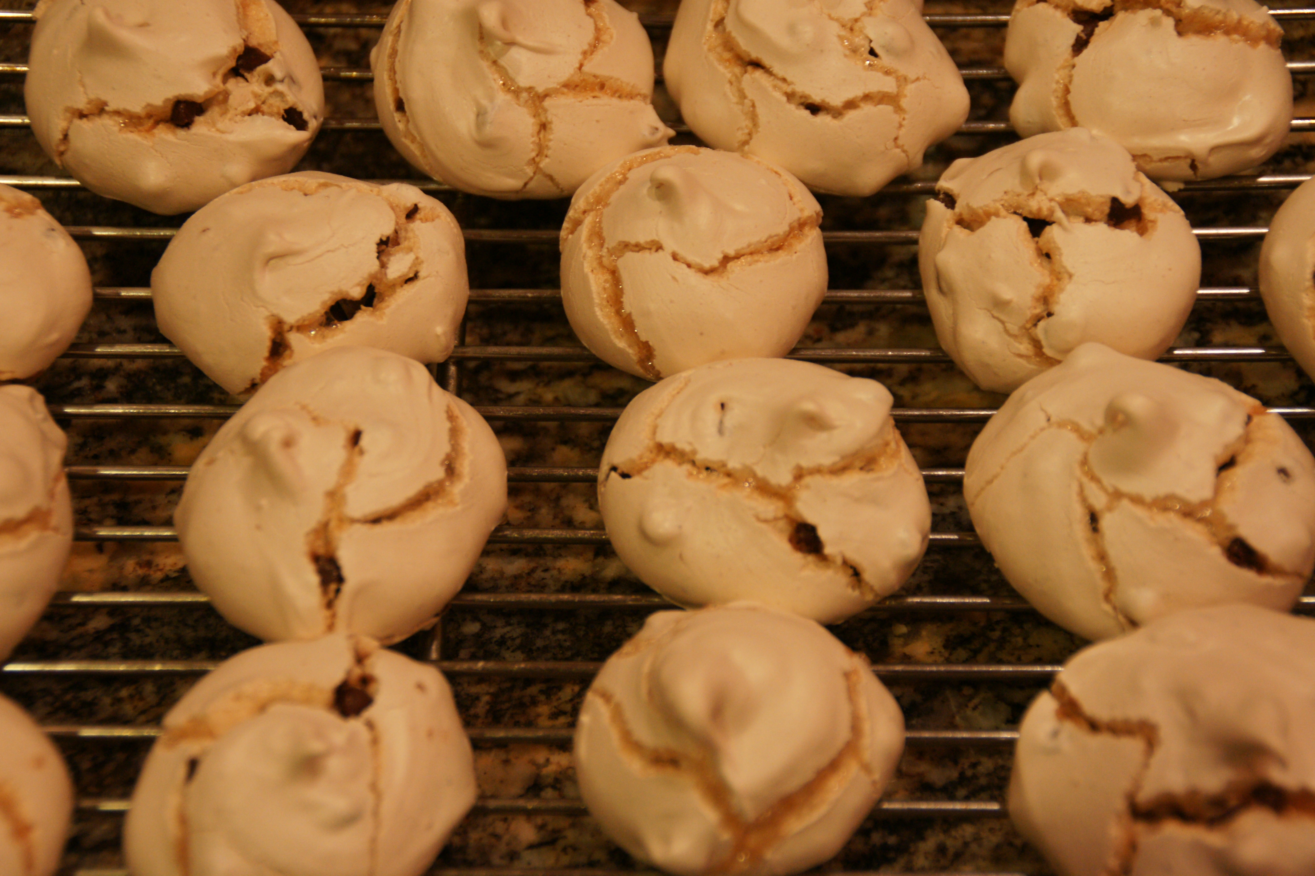 Bake for 2 1/2 to 3 hours; cookies should be a very light brown; watch so they don’t burn! If you’re not sure the meringues are dry, take one out and break it open; there should be little, if any egg white in the center. Remove meringues to a rack to dry. Store in an airtight container.