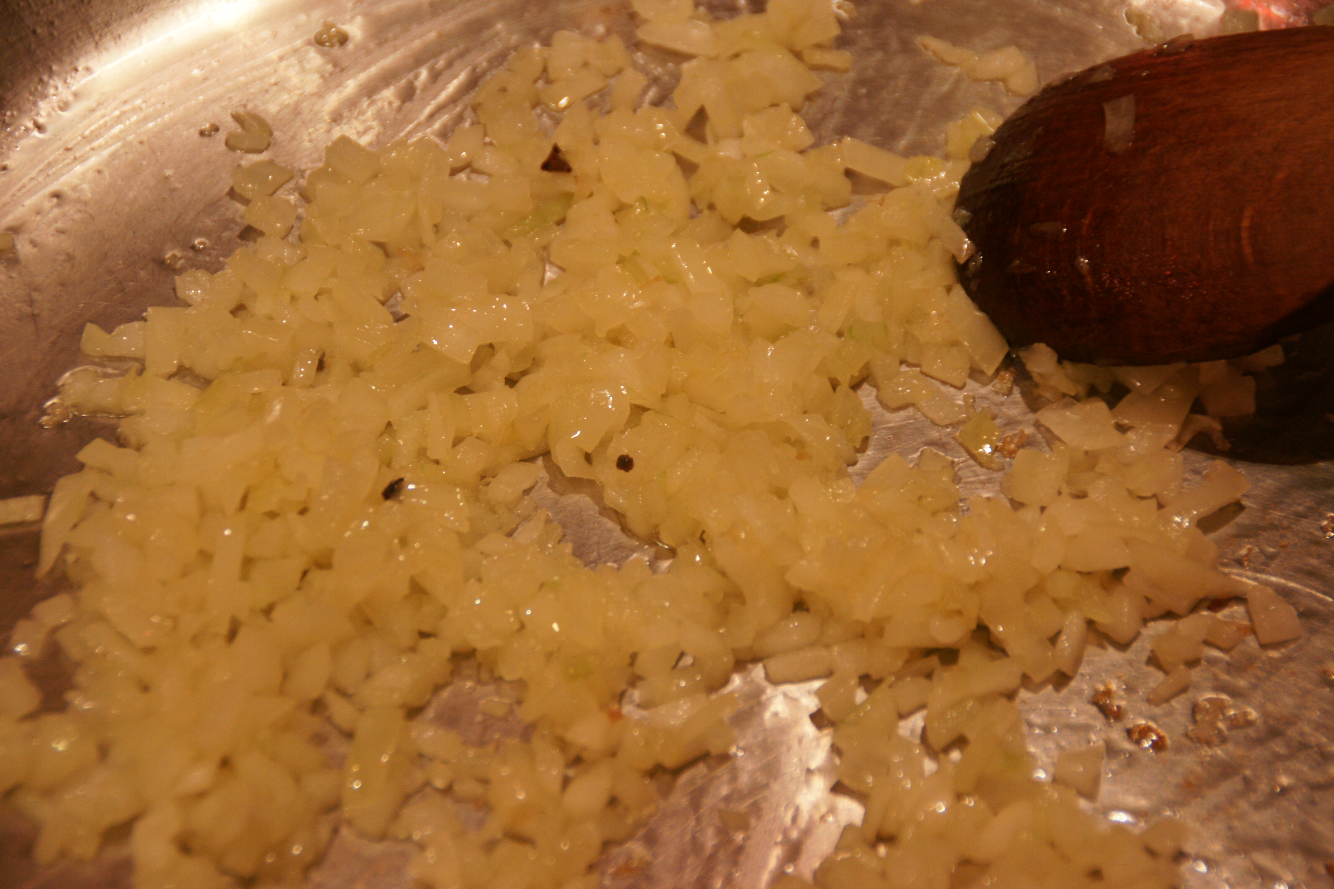 In the meantime, prepare the sauce by heating some oil in a large saute pan over medium heat. Add the chopped onion and saute until softened.