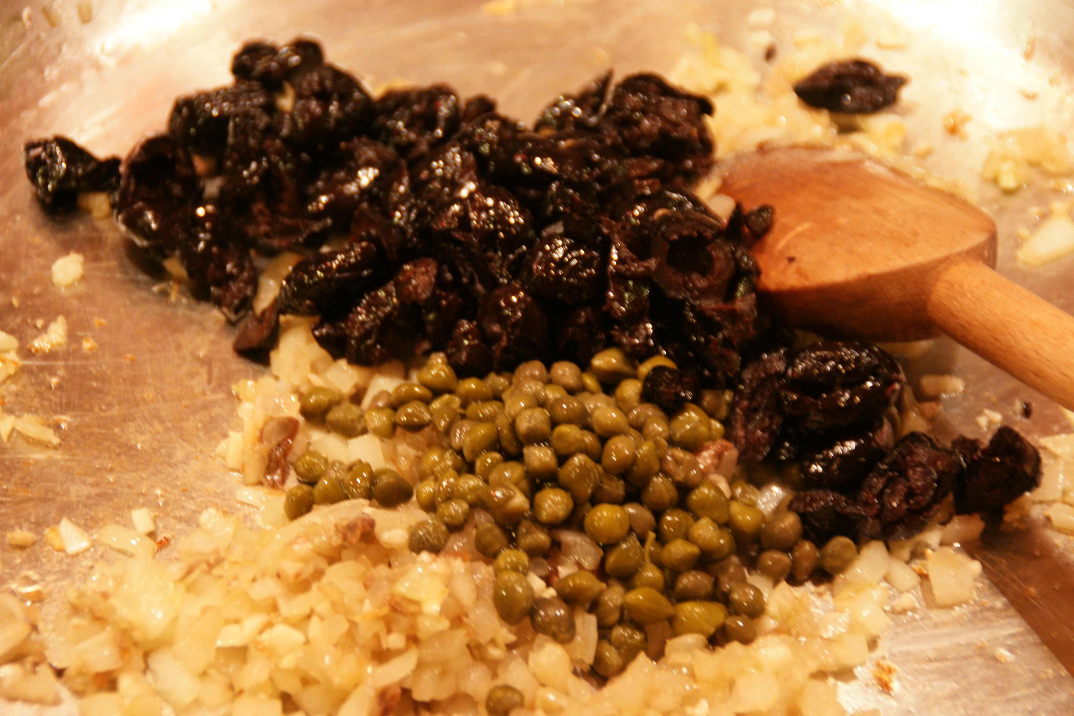 Since it’s really a “throw it all together” sauce, I read several versions of the sauce and then came up with my own– like adding onions to the sauce for another layer of flavor. Feel free to experiment, but keep in mind the basic ingredients of garlic, anchovies, oil-cured olives, red pepper flakes and capers.