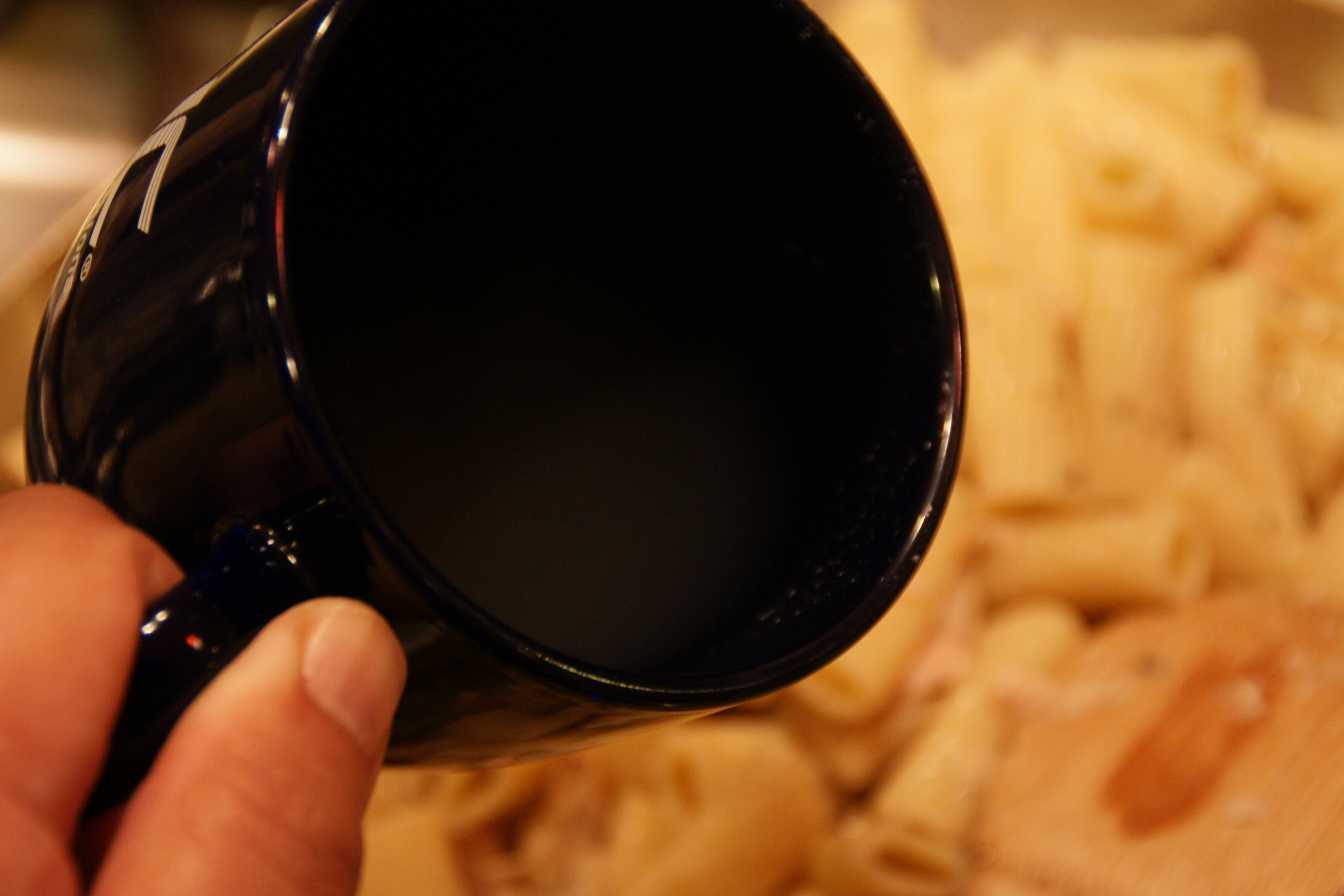 Bring a pot of water to boil. Salt the water generously, add pasta and cook until al dente. Reserve 1-2 cups cooking liquid for the sauce. I think Ken was surprised when he asked how to save the pasta water and I handed him a large coffee mug and said “Dip it in, but try not to get any rigatoni in the water.” I was going to drain the pasta since it was a big pot of boiling water, but he assured me “Mom, I’ve done this before with Dad.” (I guess he’s not a little kid any more).