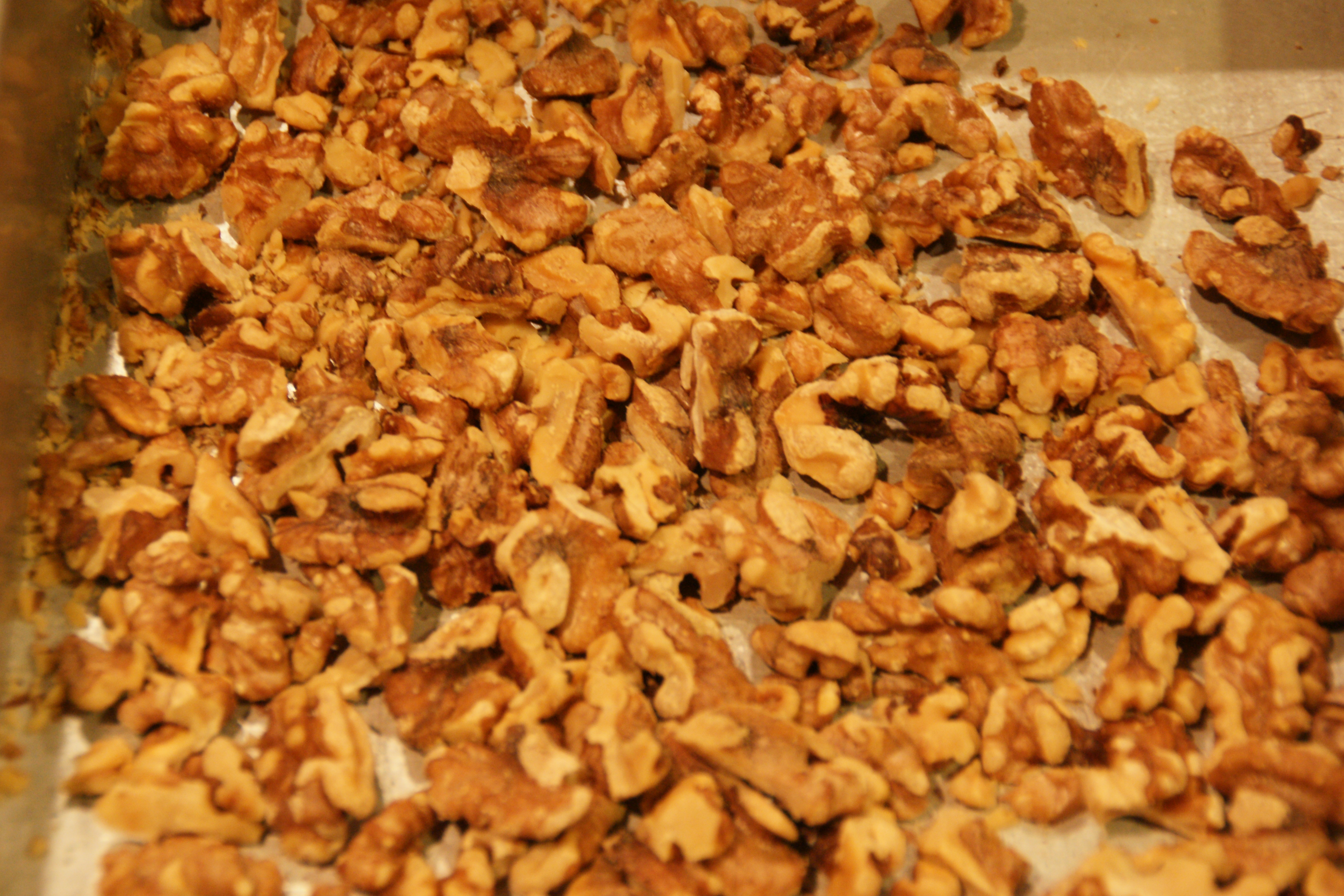 Toast the chopped walnuts in a preheated 375 degree oven until light brown. The nuts are usually done when you can smell them roasting (but keep an eye on them anyway). Line a rimmed baking sheet with parchment paper.