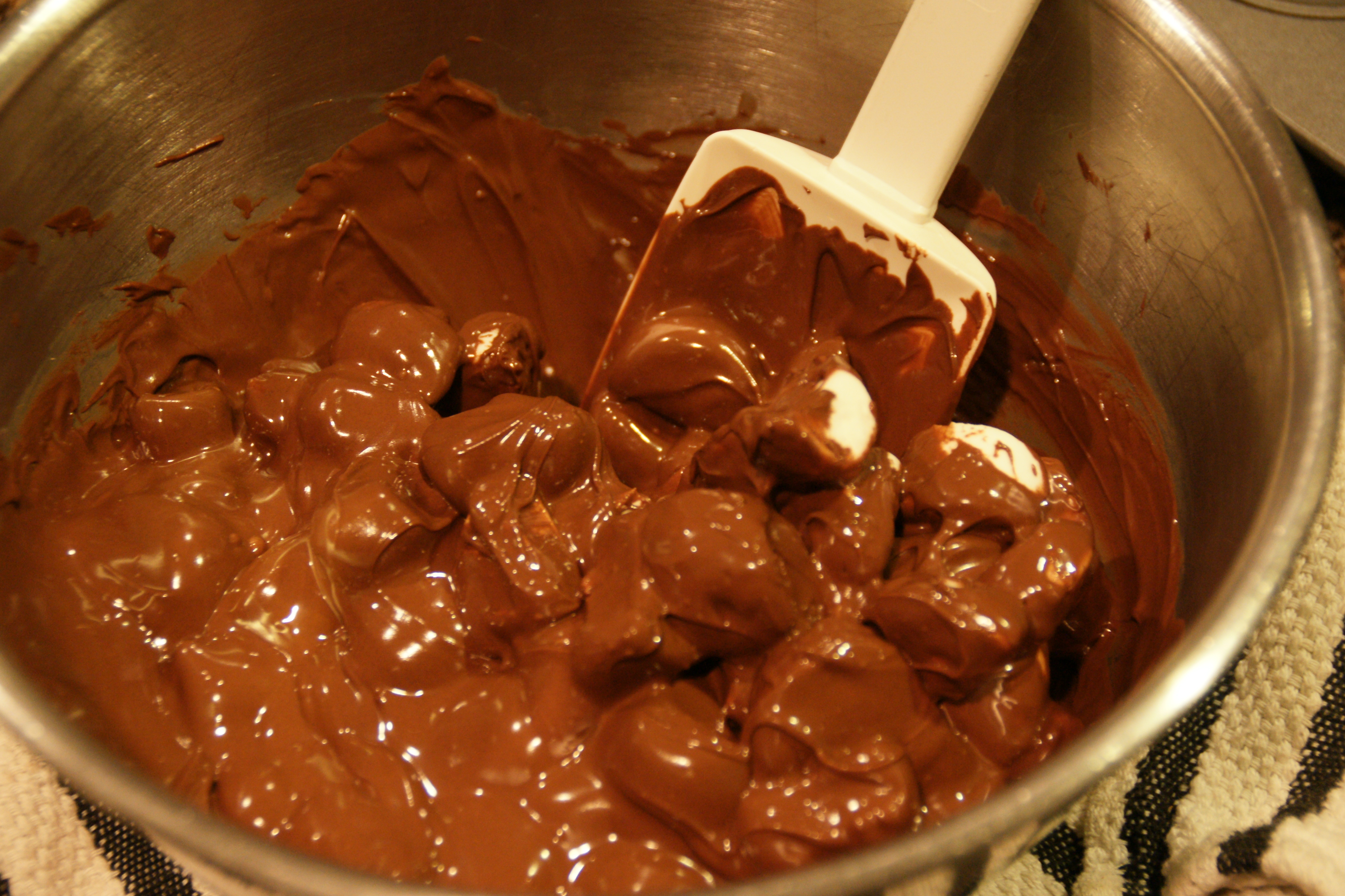 Place the chocolate in a large heat proof bowl (I used stainless steel) over barely simmering water. Stir occasionally until the chocolate is almost fully melted– there will be bits of chocolate floating around. Remove from heat (I place the bowl on a towel so it doesn’t slide around) and stir until the chocolate is completely melted and thickens slightly.