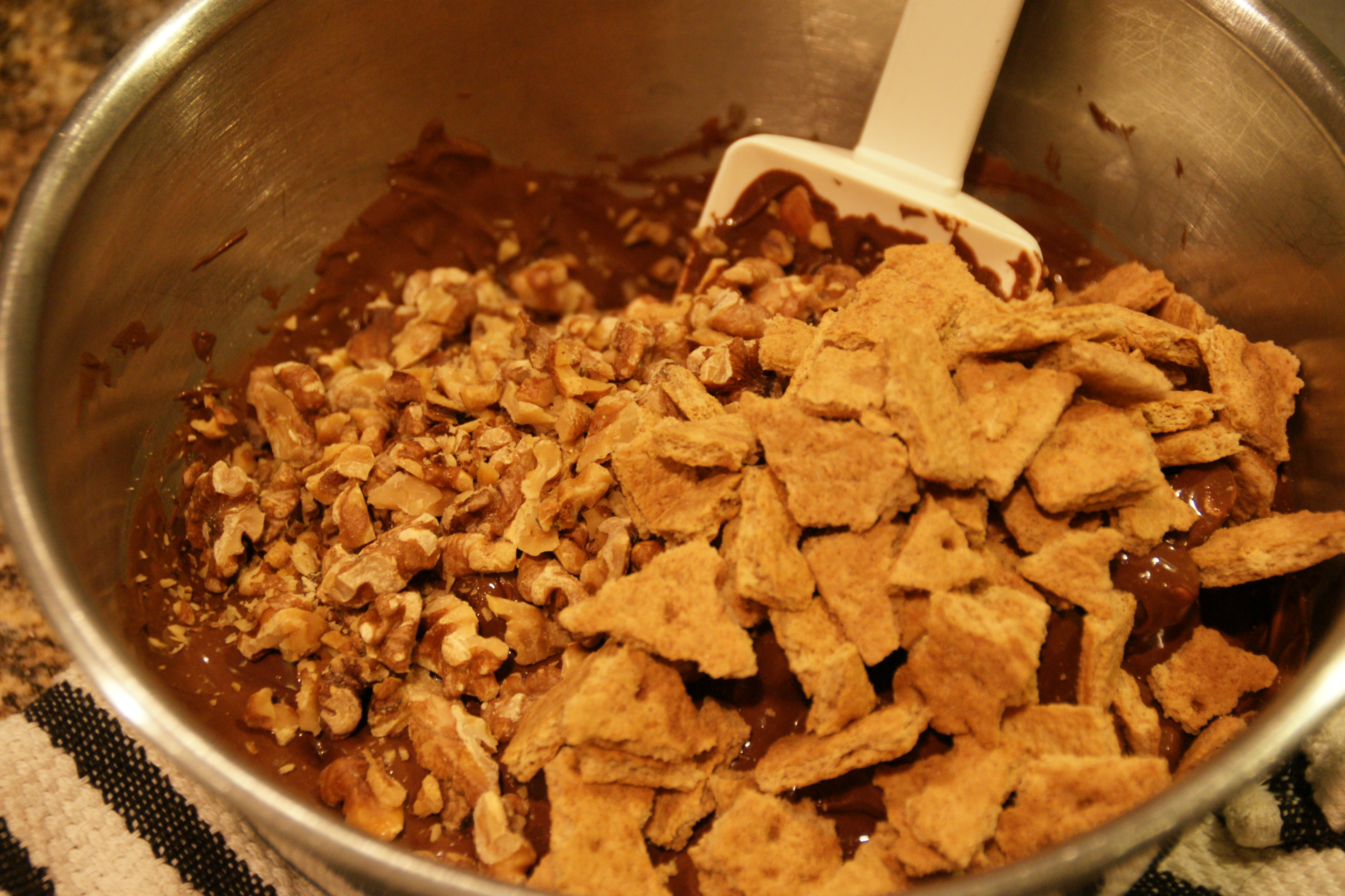 Then add the walnuts and cracker pieces. Mix well to combine and coat everything with that yummy milk chocolate!