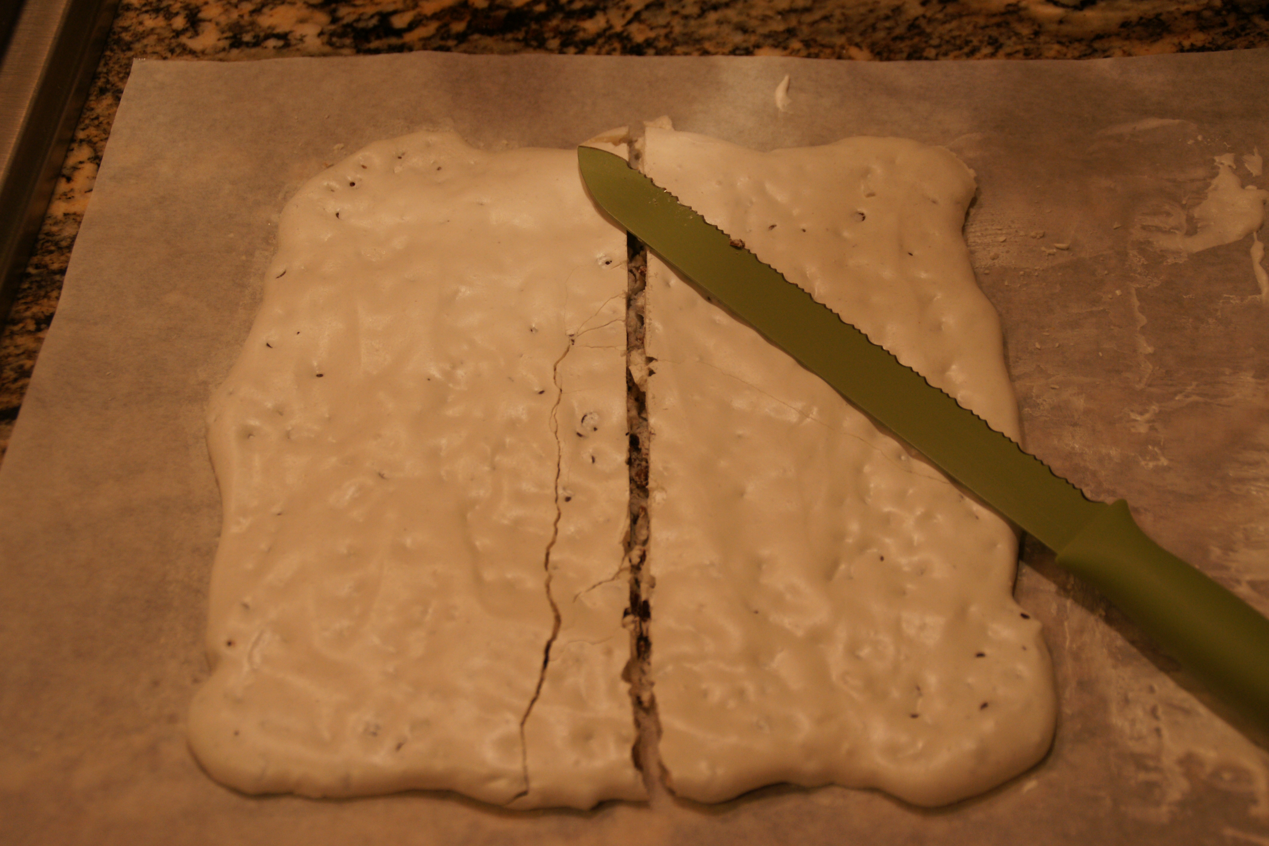 Let the ice cream soften a bit on the counter until it is pliable. If you’re adventurous, you could even try a second flavor. Spread one meringue with the ice cream, creating as thick or thin a layer as you want (I go for about 1 inch per ice cream).