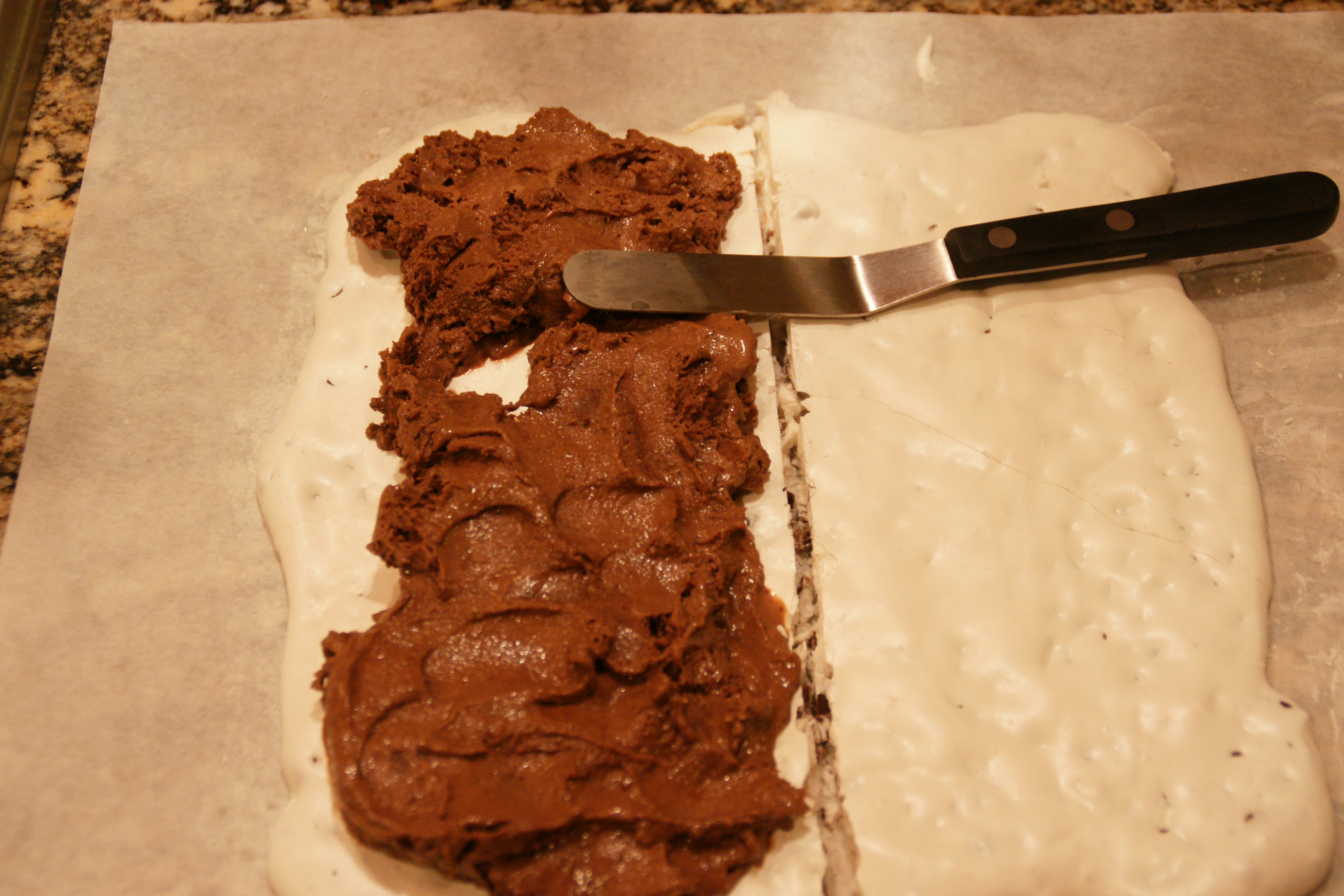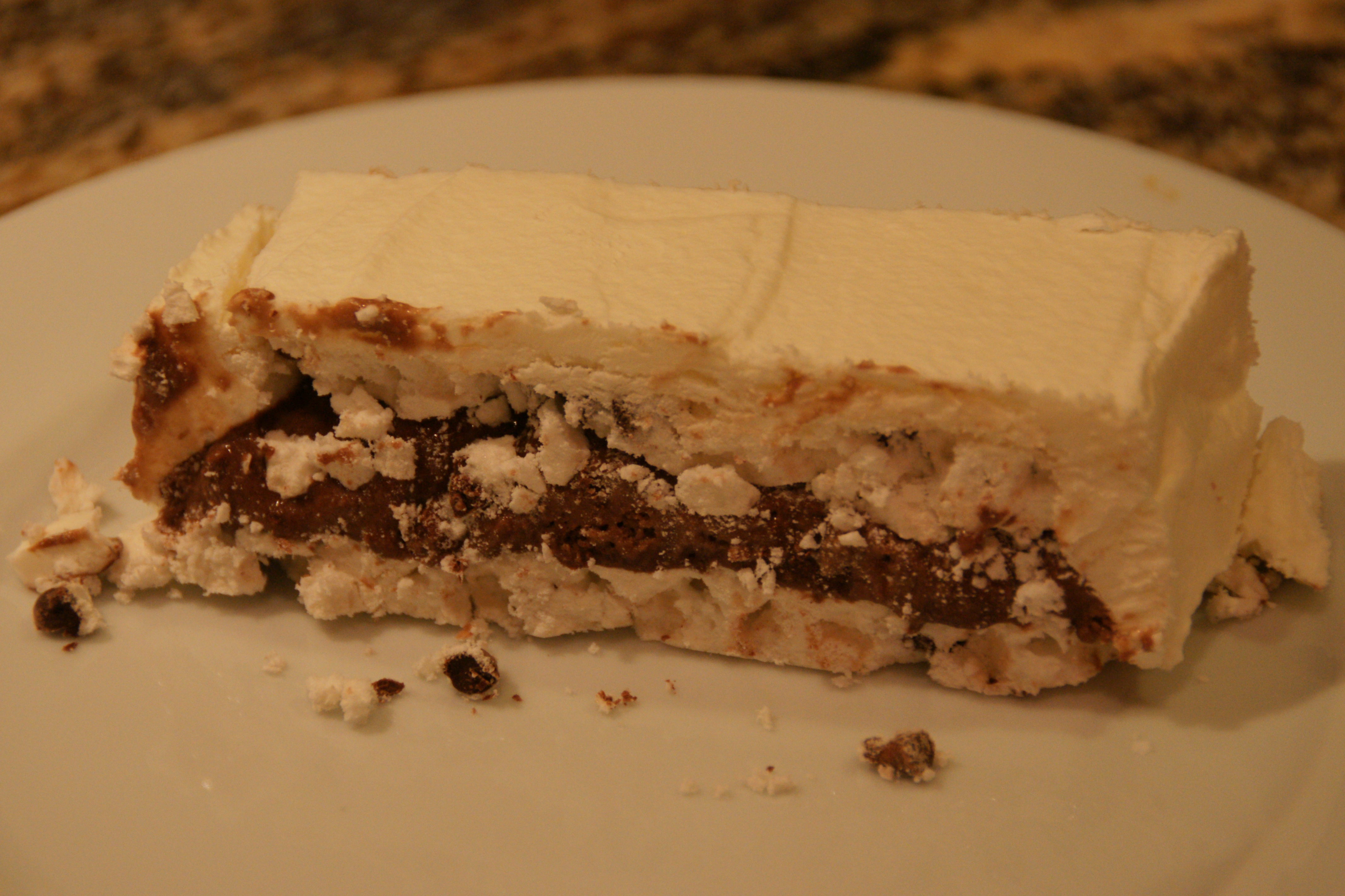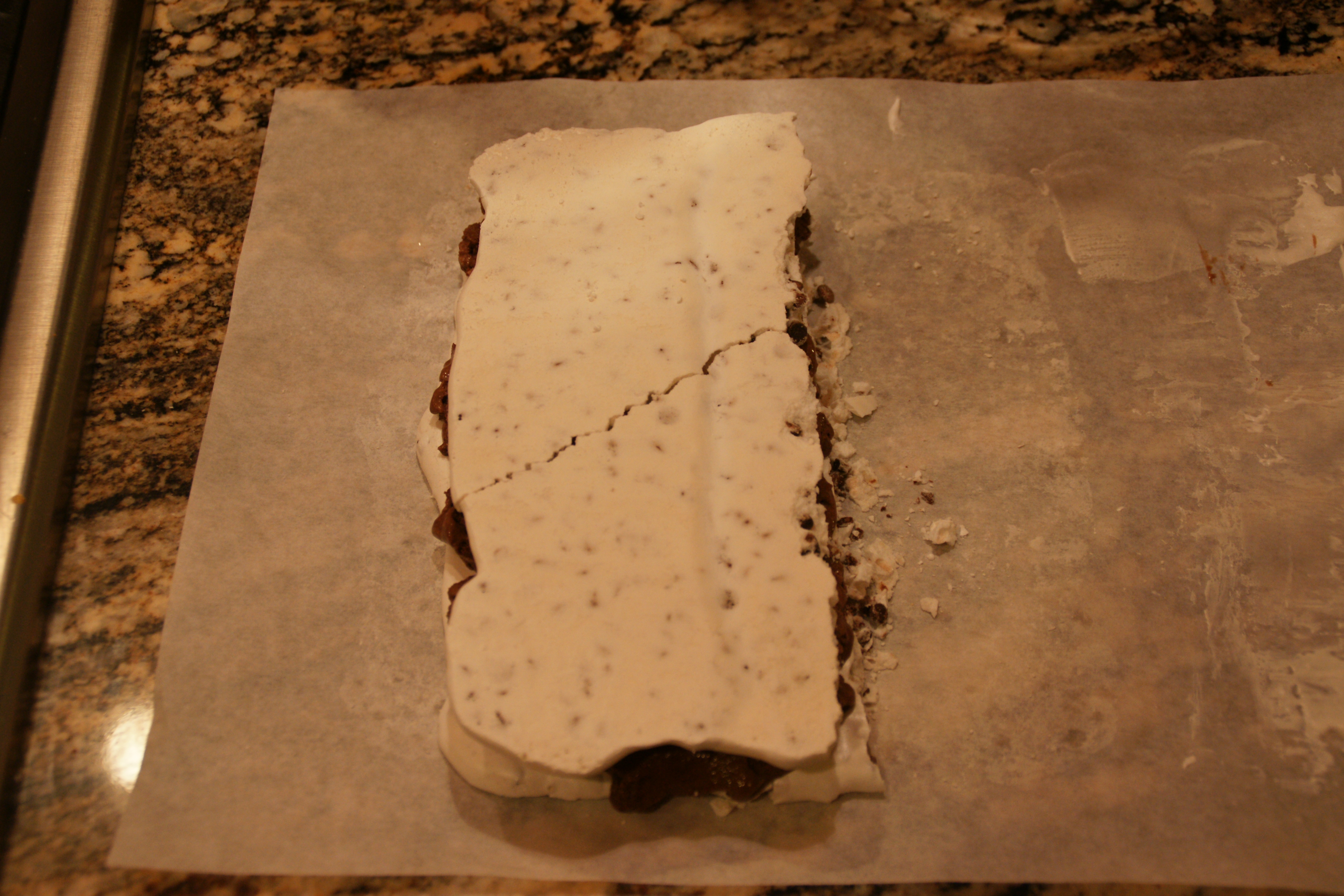 This evening, I made a different, mini-version. Remember those chocolate chip meringues? I got lazy and simply spread the last of the meringue onto the parchment paper, forming a square (probably 9×9, but it was free form). I checked to see what ice cream we had in the freezer and returned with some kind of chocolate fudge nut brownie concoction (clearly for Ken and Kurt); with the chocolate chip meringue, this would be over-the-top chocolate. I figured the whipped cream would dilute some of that sweetness…