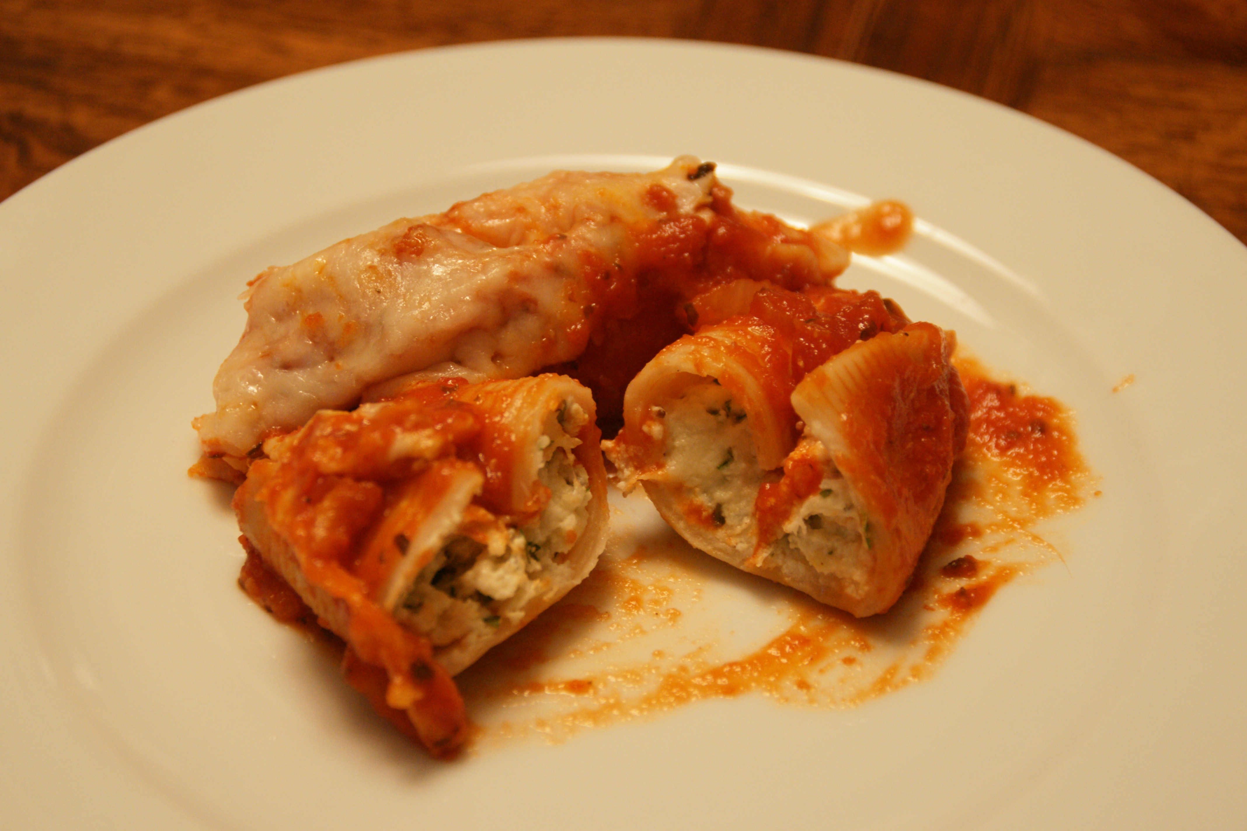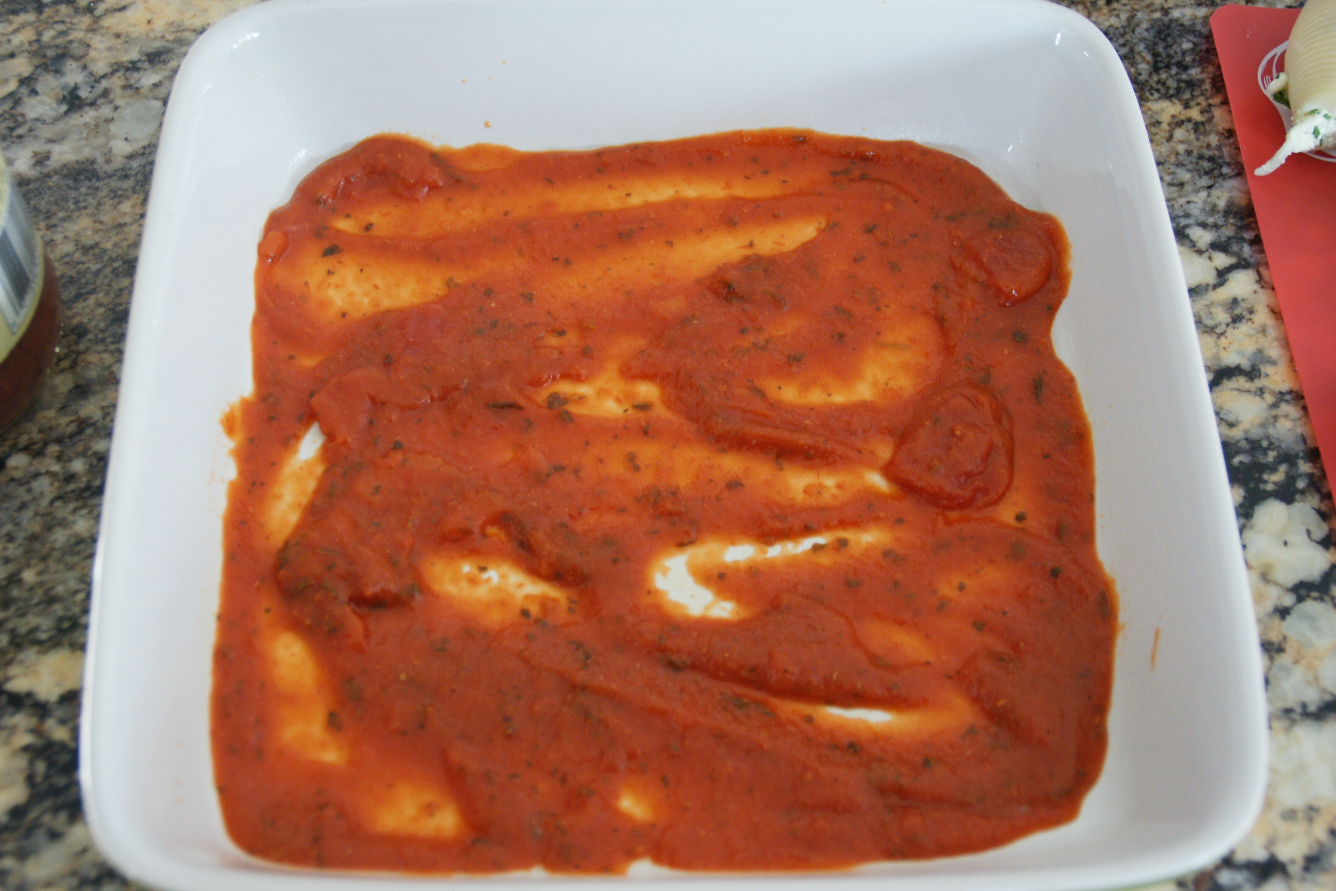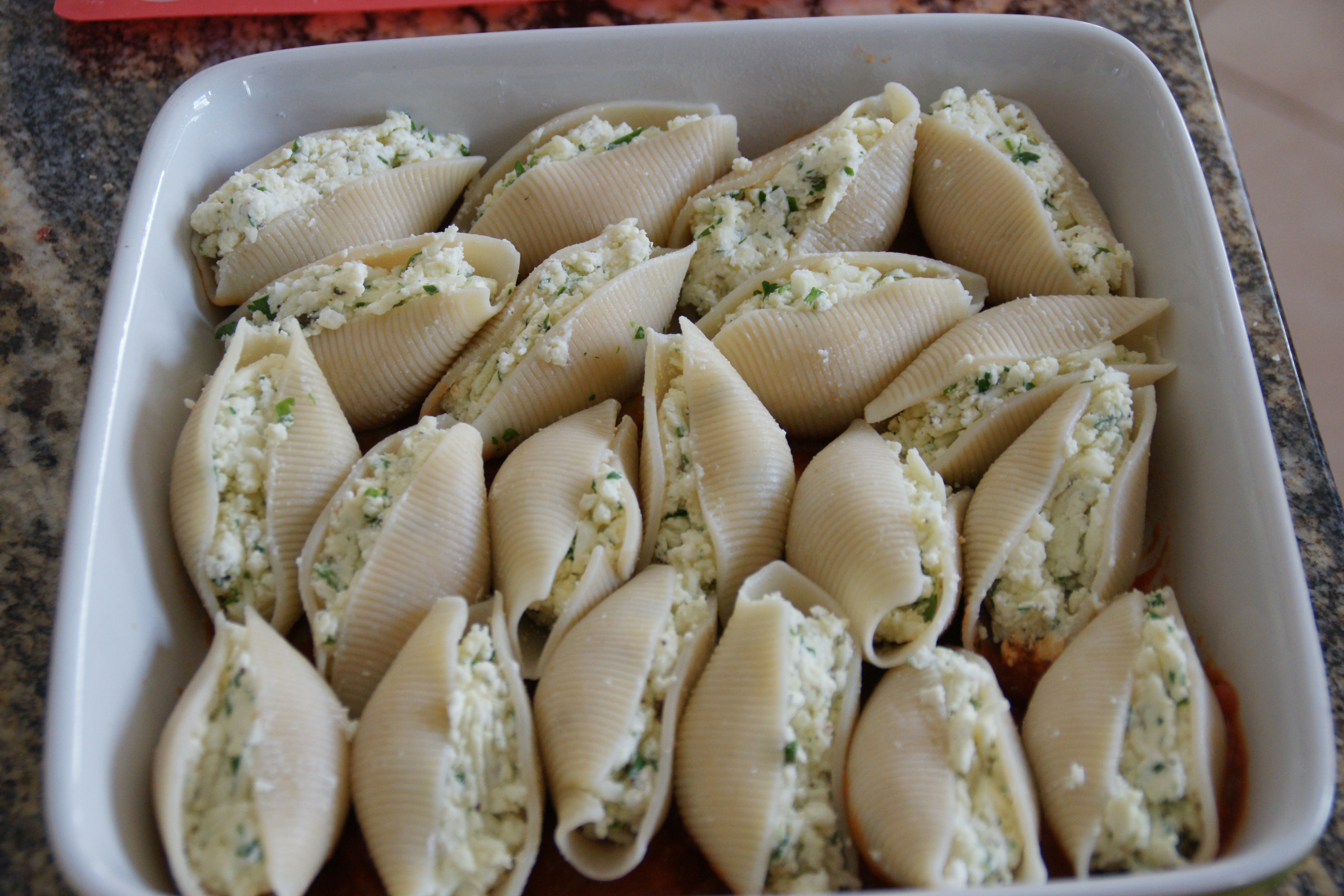 When all shells are stuffed, lightly coat the bottom of the oiled casserole with some of the sauce.