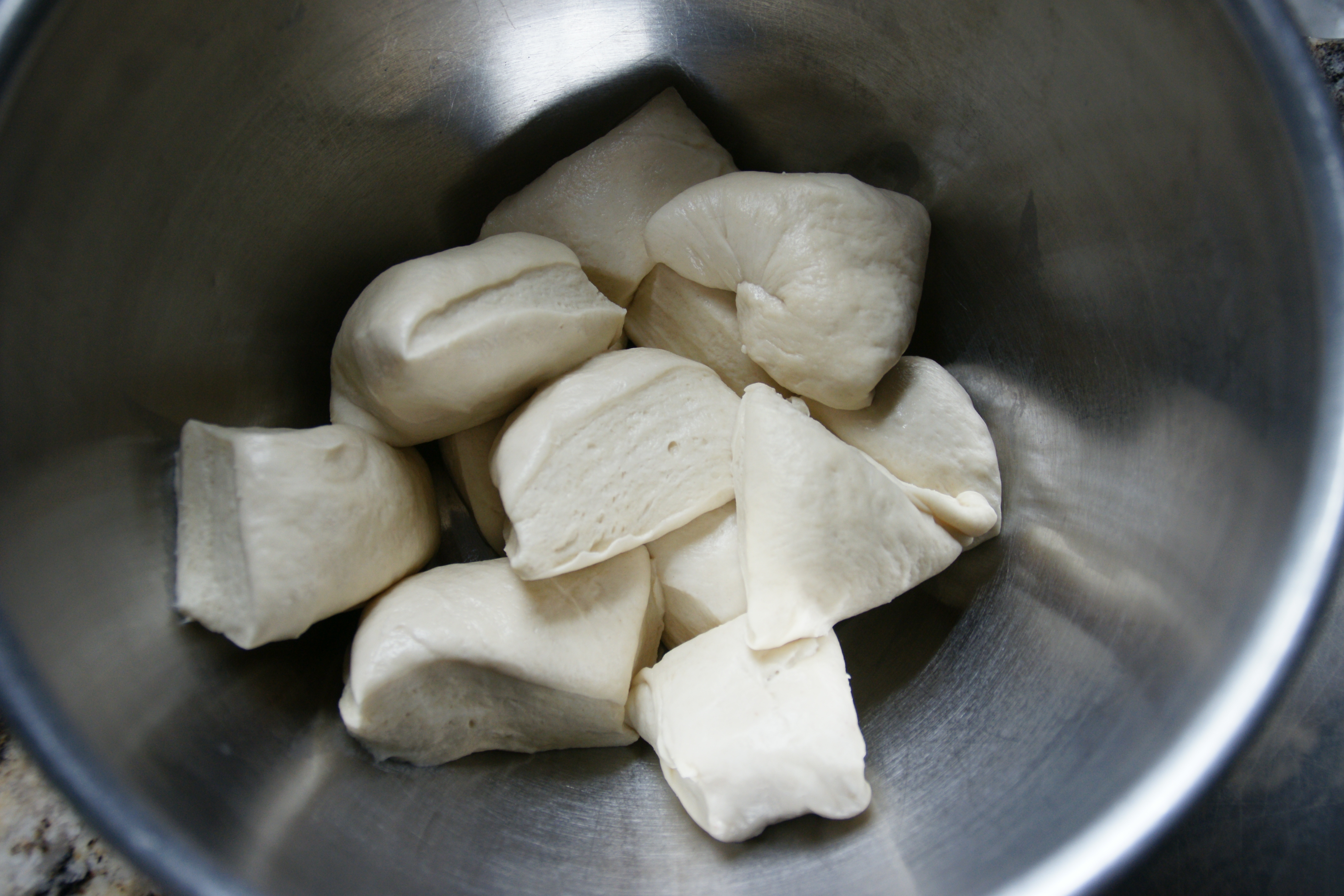Toss the pieces into a mixing bowl. Cover with a towel and let the dough warm up for an hour.