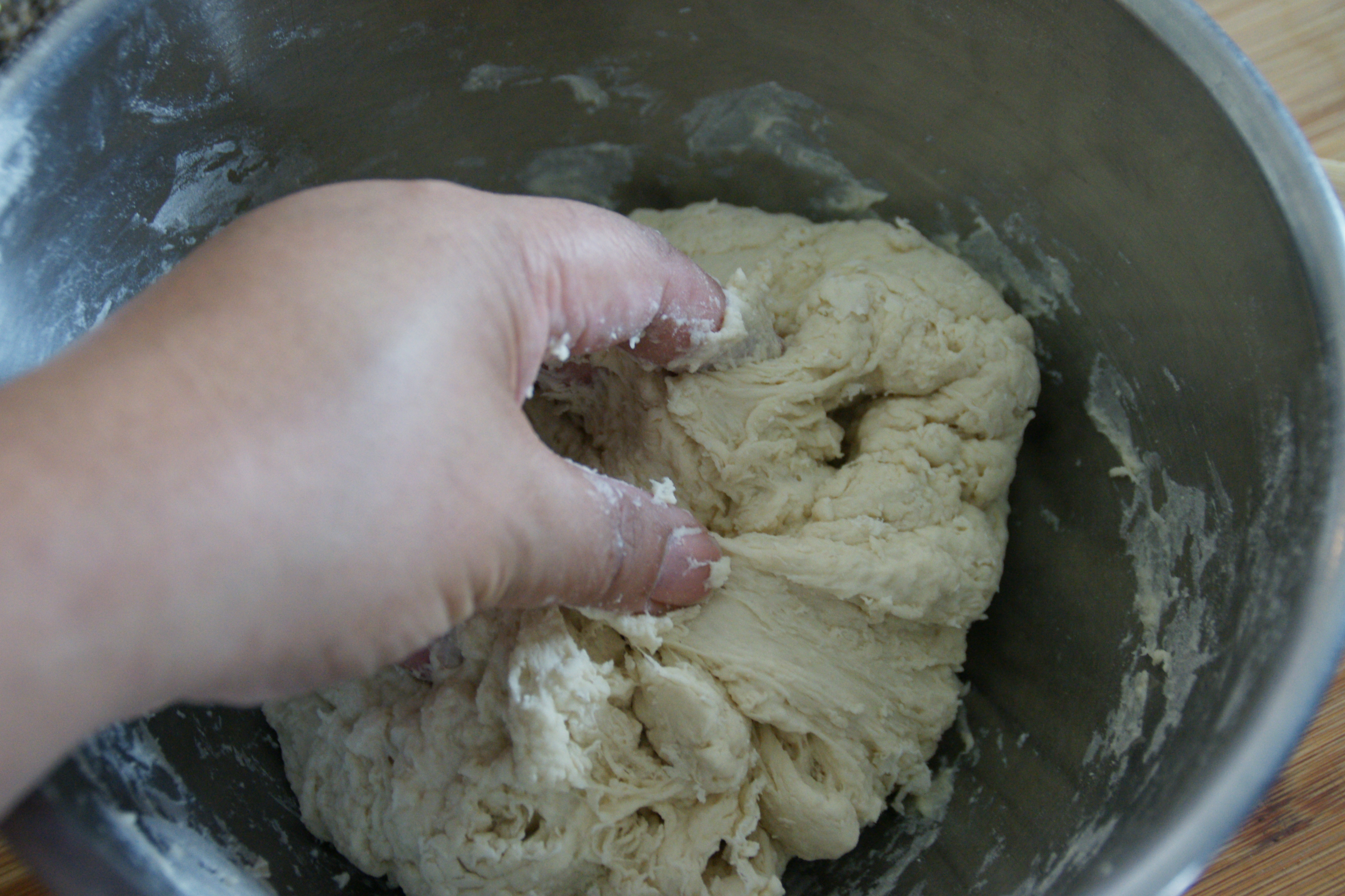When the dough comes together, scrape onto a floured board and begin the kneading process– again, just as before. After 1 1/2 minutes: