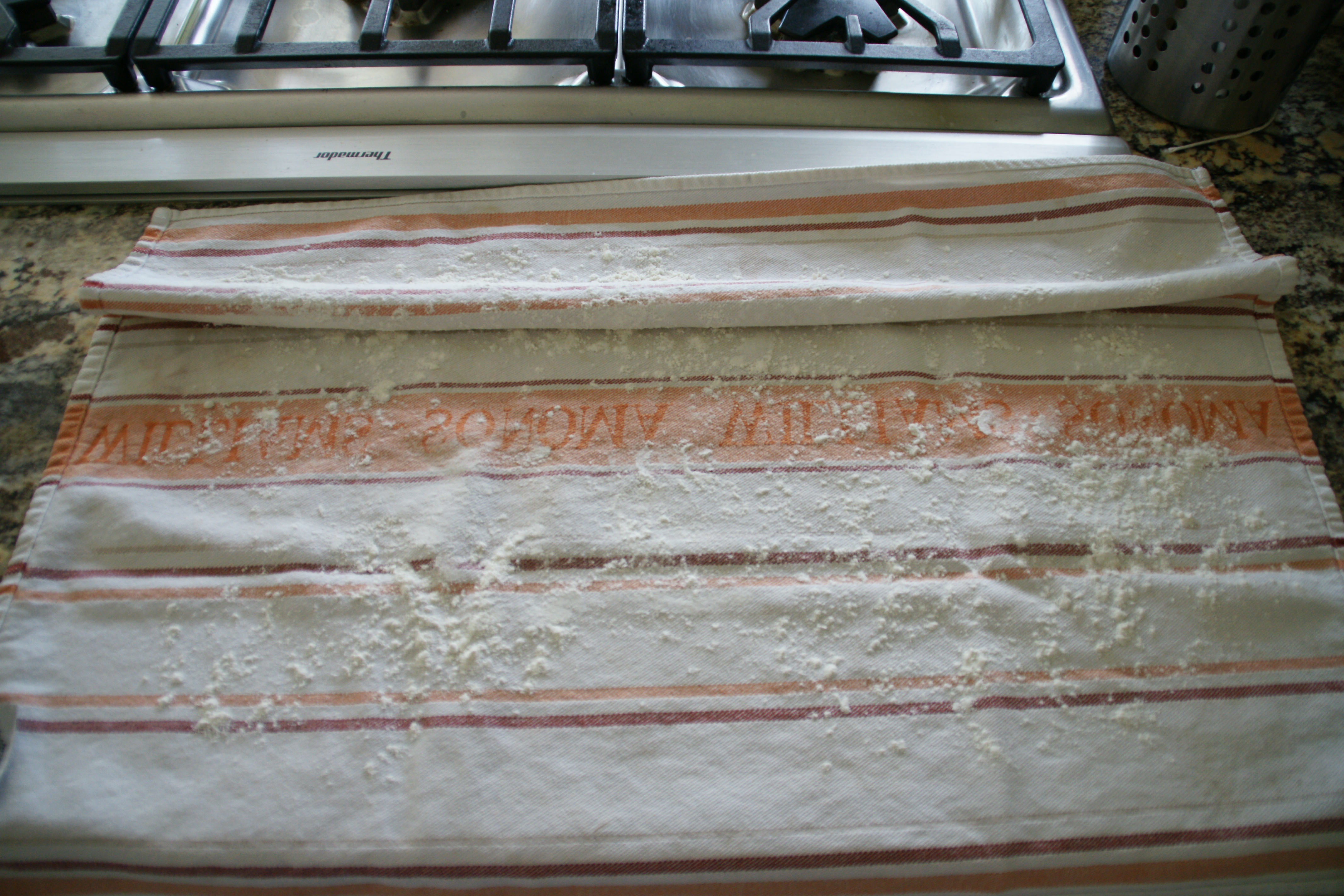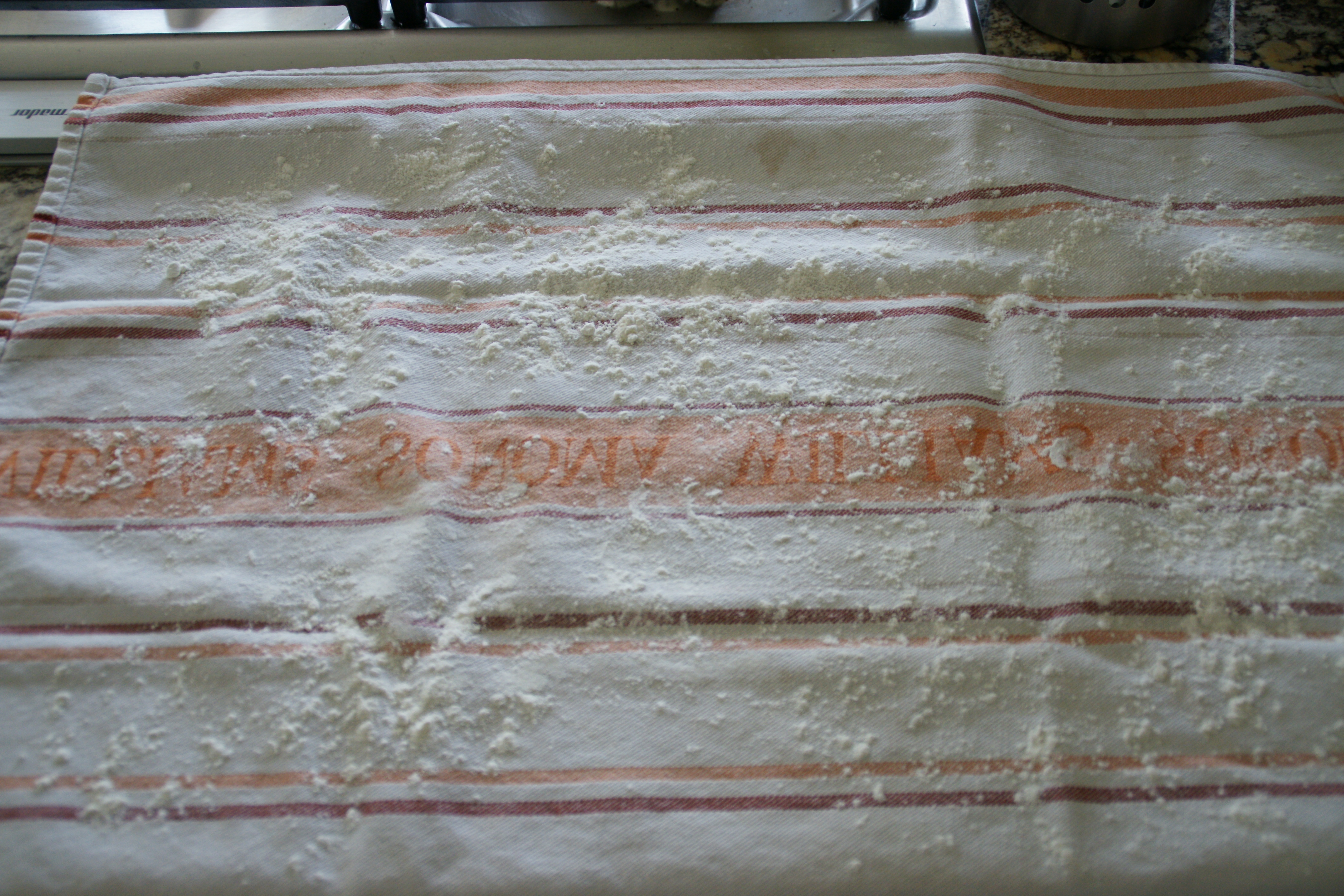 While the dough is rising, make a “couche” in which your loaves will have their final rise. To do this, spread out a clean kitchen towel and sprinkle flour all across the surface.