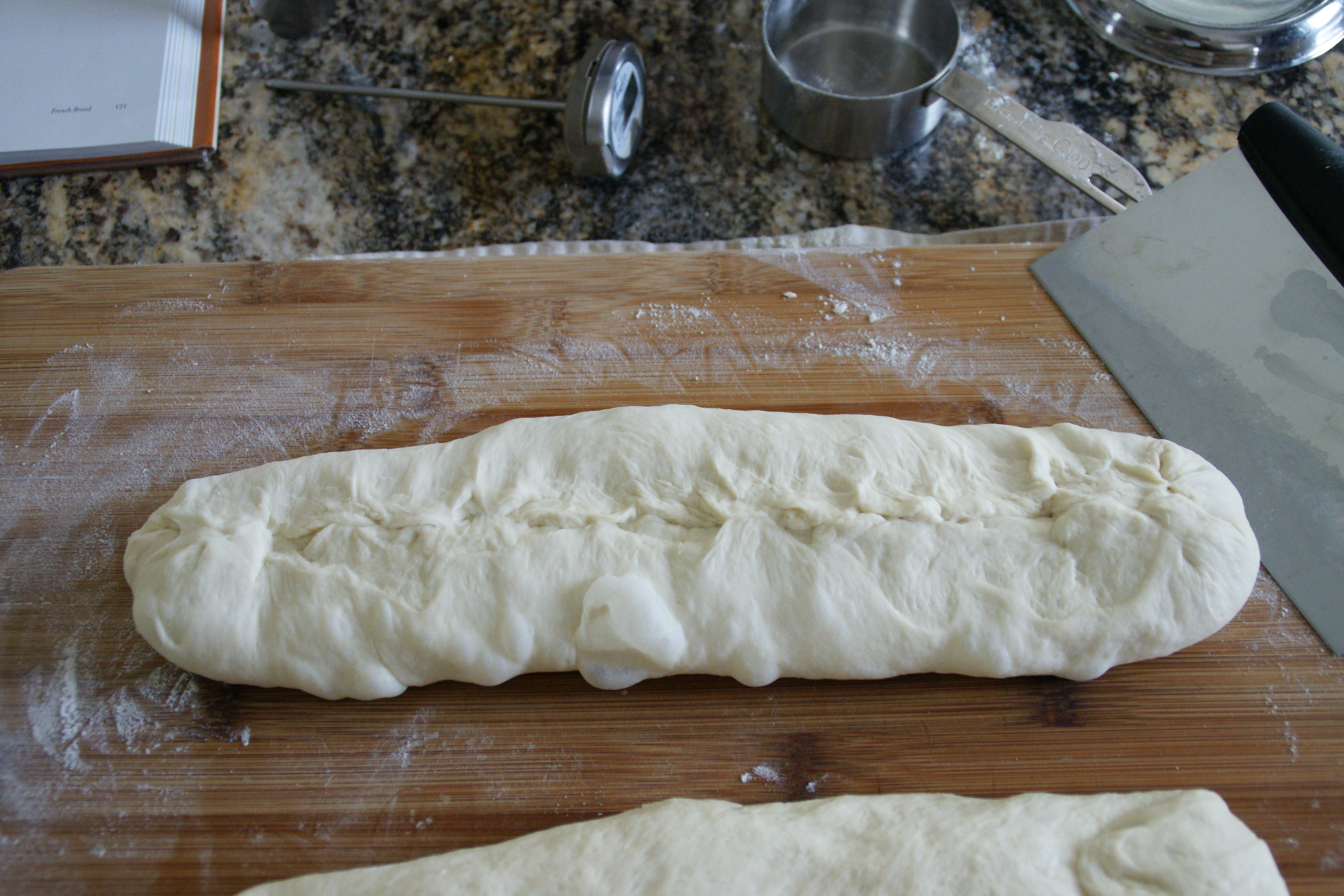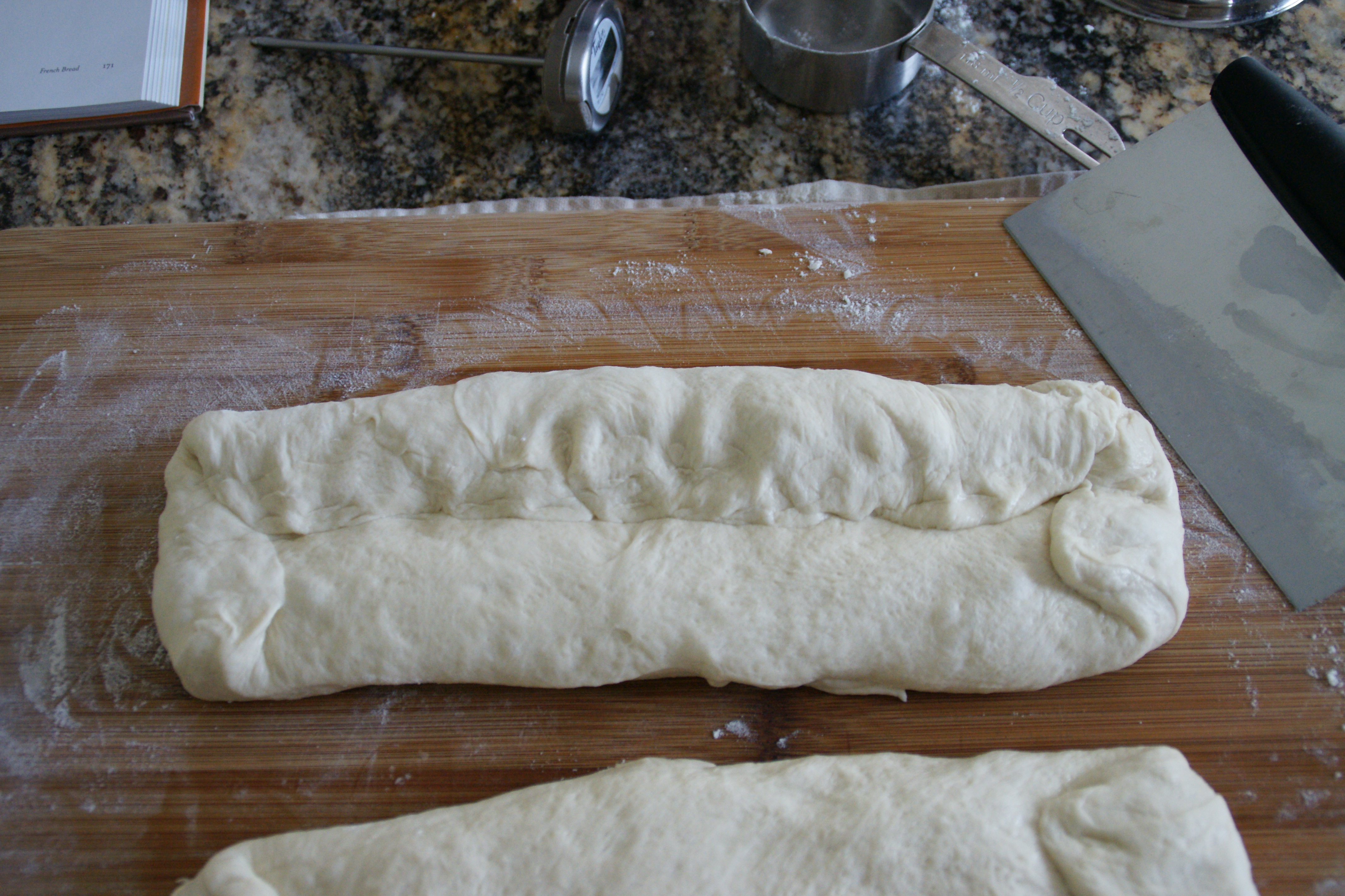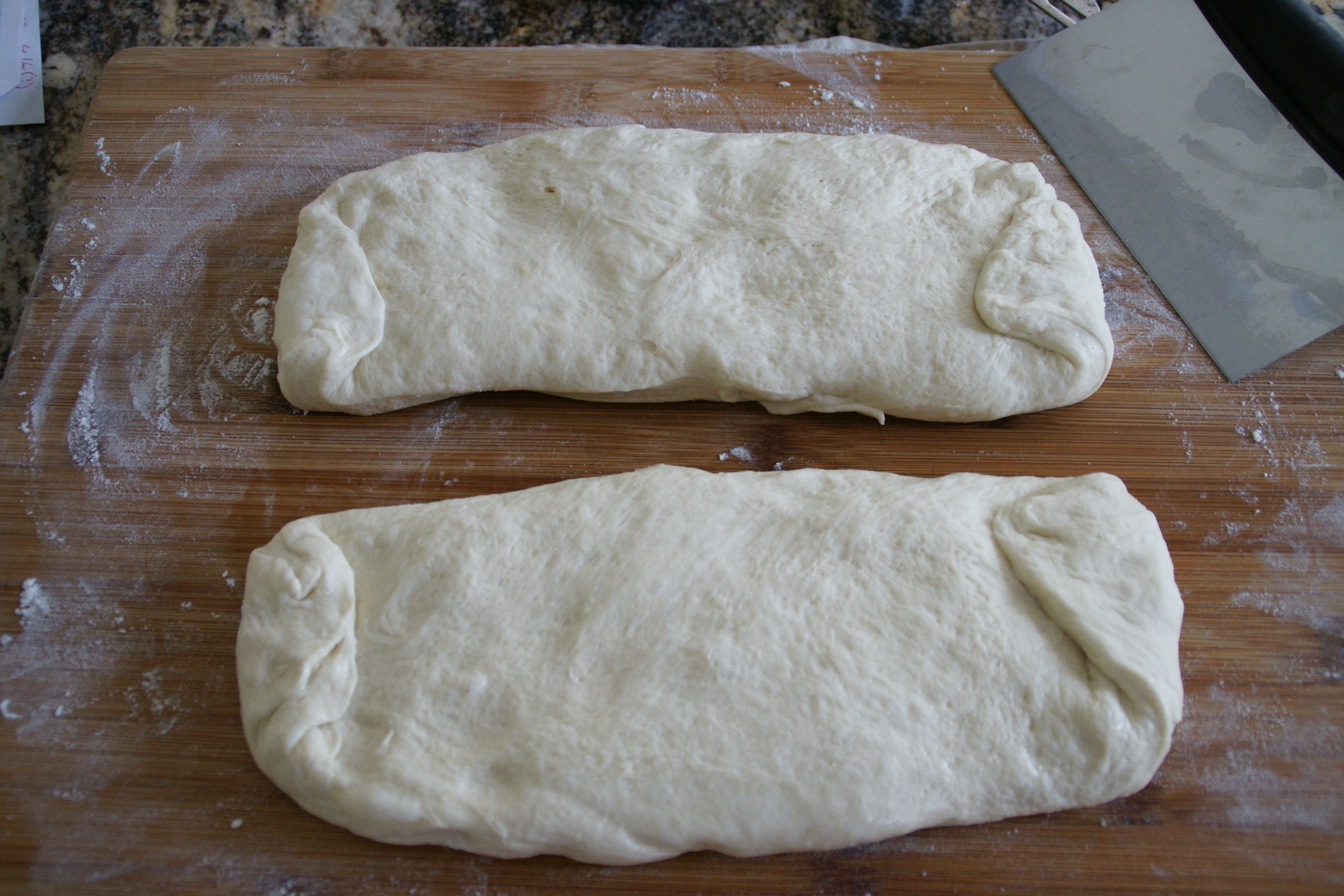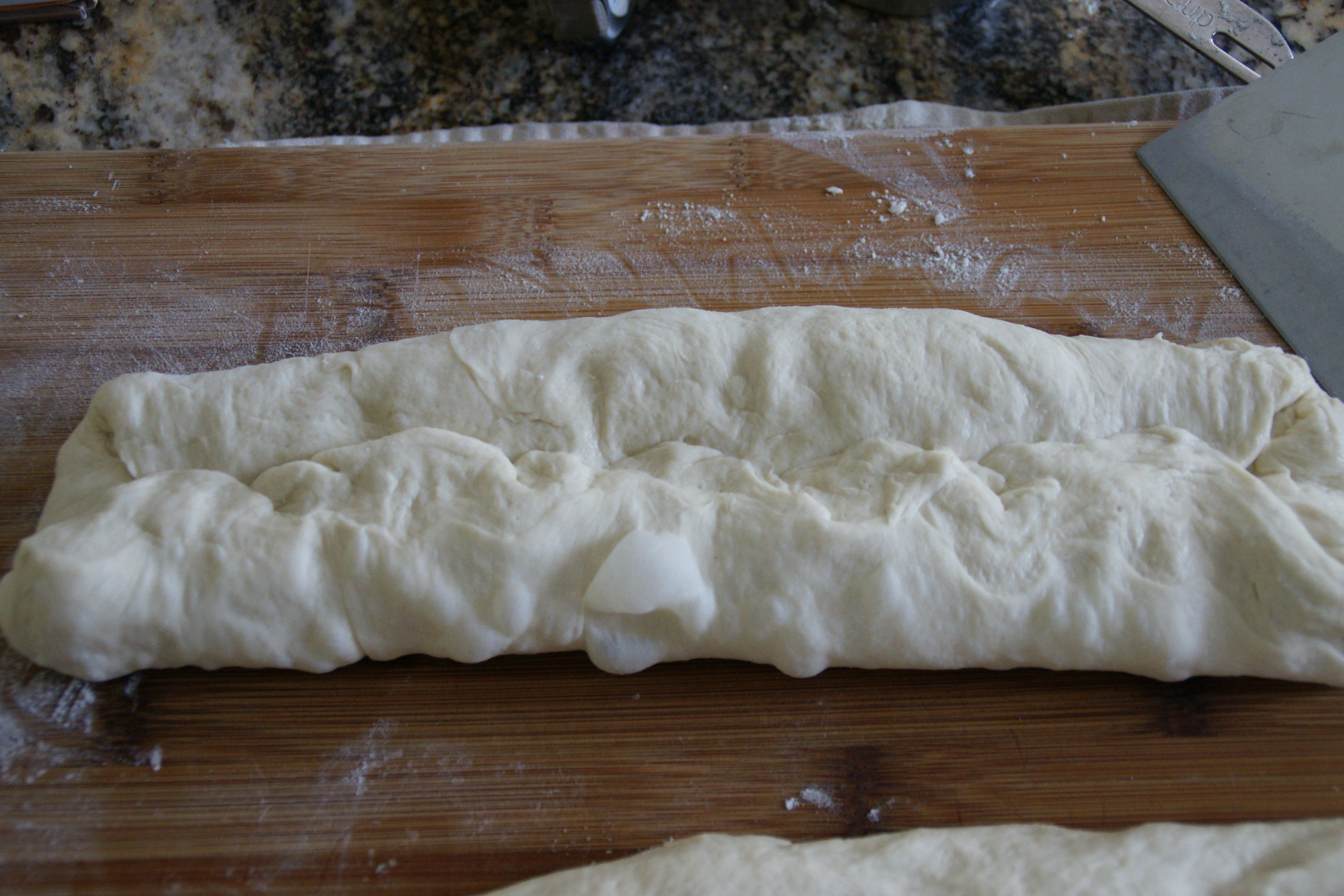 Using your scraper, cut the dough rectangle in half, lengthwise. You’re know ready to shape the loaves; do one at a time! (I clearly didn’t cut this evenly)!