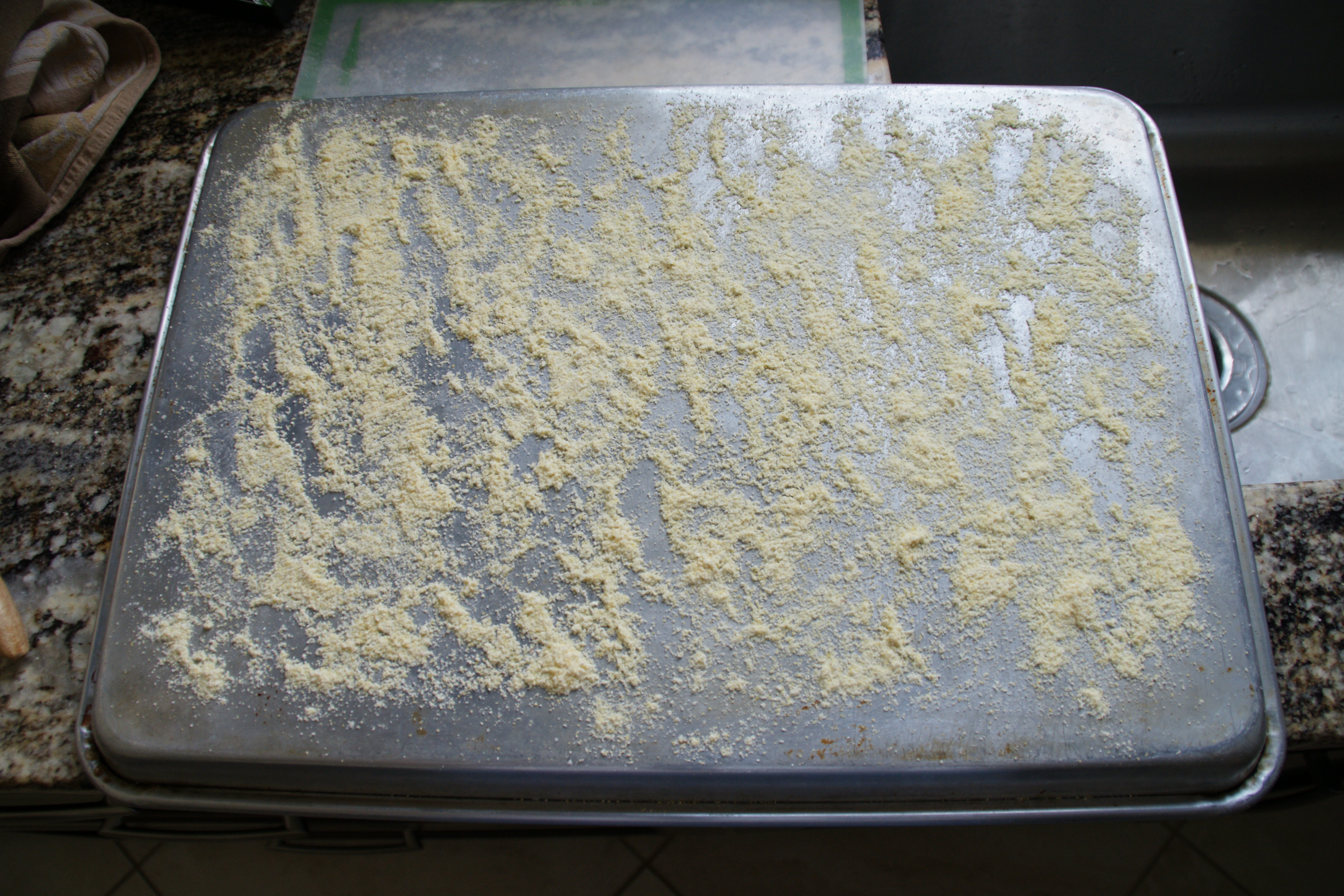 When the loaves and oven are ready, take a rimmed cookie sheet and turn it over. Generously sprinkle the surface with cornmeal.