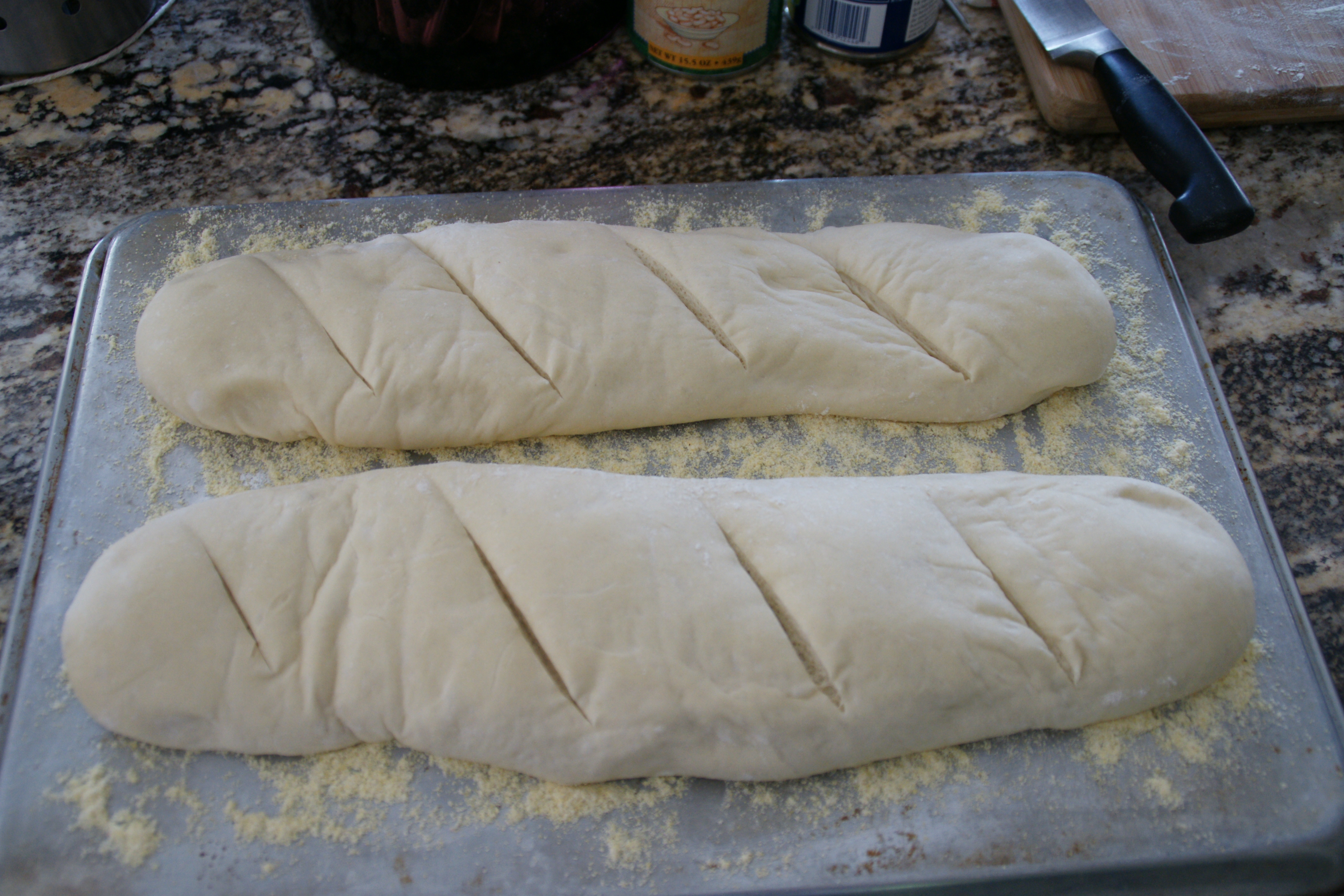 Working as quickly as you can, open the oven door and shake the loaves onto the baking stone. By shake, I really mean jerk; you want to get those loaves onto the pan in one smooth motion like the guys do with pizzas in those giant brick ovens. This is where the “generous coating” of cornmeal is critical; I’ve had some loaves stick on the cooking sheet and the result has been a J-shaped loaf!