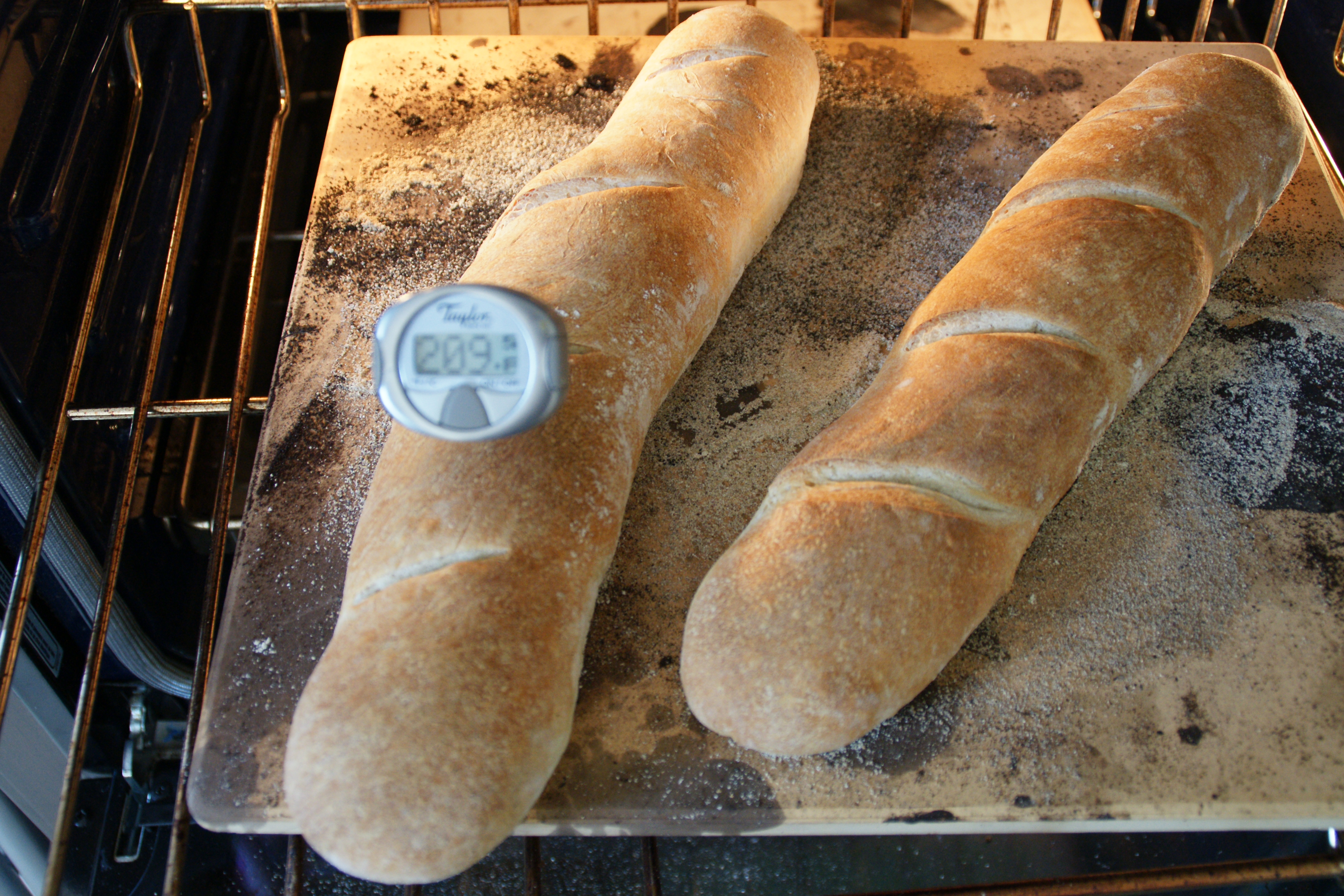 Once the loaves are on the stone, take the spray bottle and spray a few times on the walls and floor of the oven. Don’t spray the bread! Close the oven door and set the timer for 30 seconds. Open the door and spray again. Wait another 30 seconds, spray, then close the door and turn the oven down to 450 degrees. Bake for 10-20 minutes or until the internal temperature of the loaves is between 205 and 209.