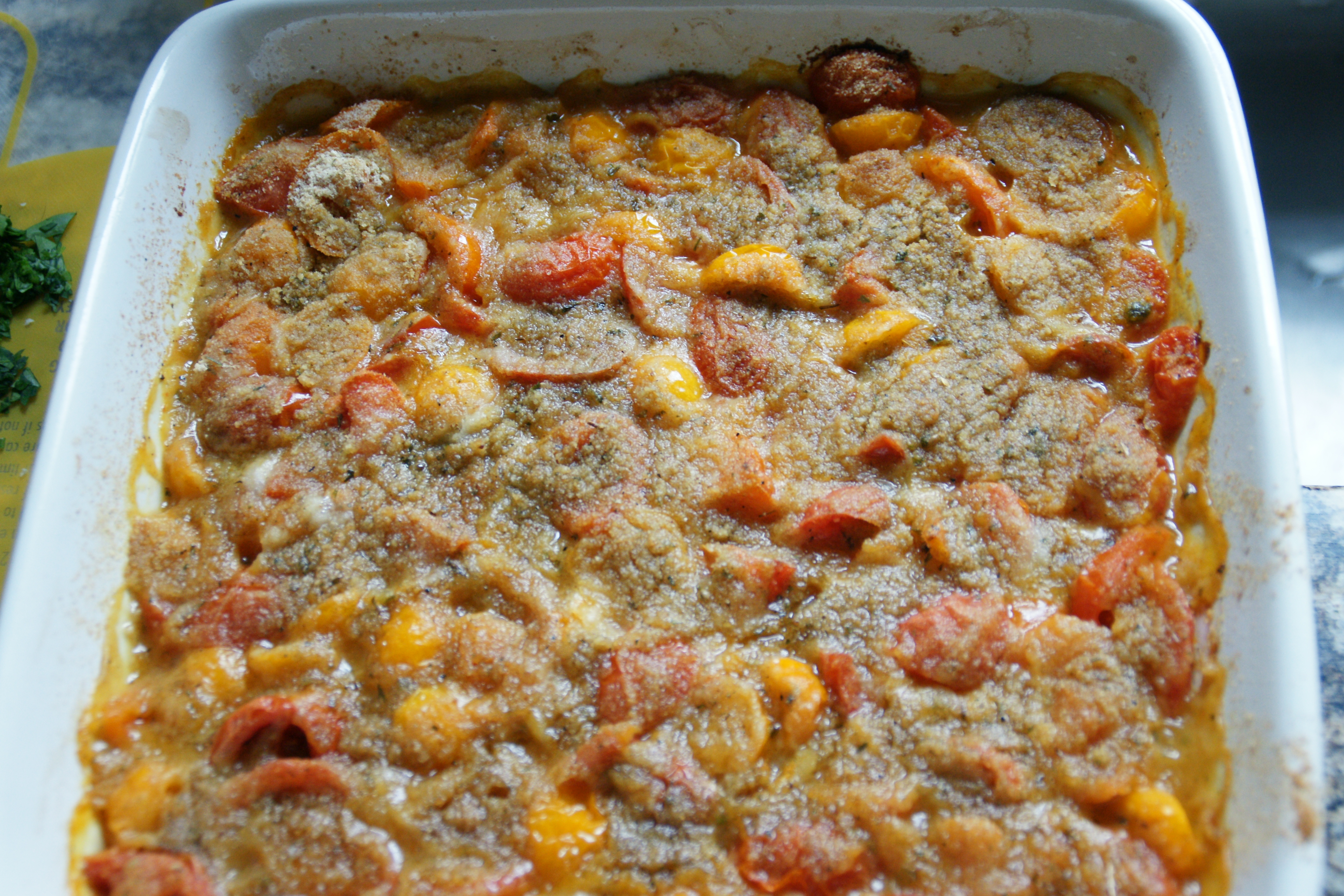 I first had this dish at my sister Tina’s house. I remember she was nervous about how it would come out; it’s a pasta dish with a sauce made from baked tomatoes and bread crumbs, plus a little pasta water as needed. No need for her worry– it was fantastic! The juices from the cherry tomatoes and the bread crumb topping came together as a flavorful binder for the pasta. Grated parmigiano and chopped flat leaf parsley round out the flavors. I loved how fresh and light this dish tasted, and unlike a baked pasta it’s not loaded with tomato sauce, cheese and meat!
