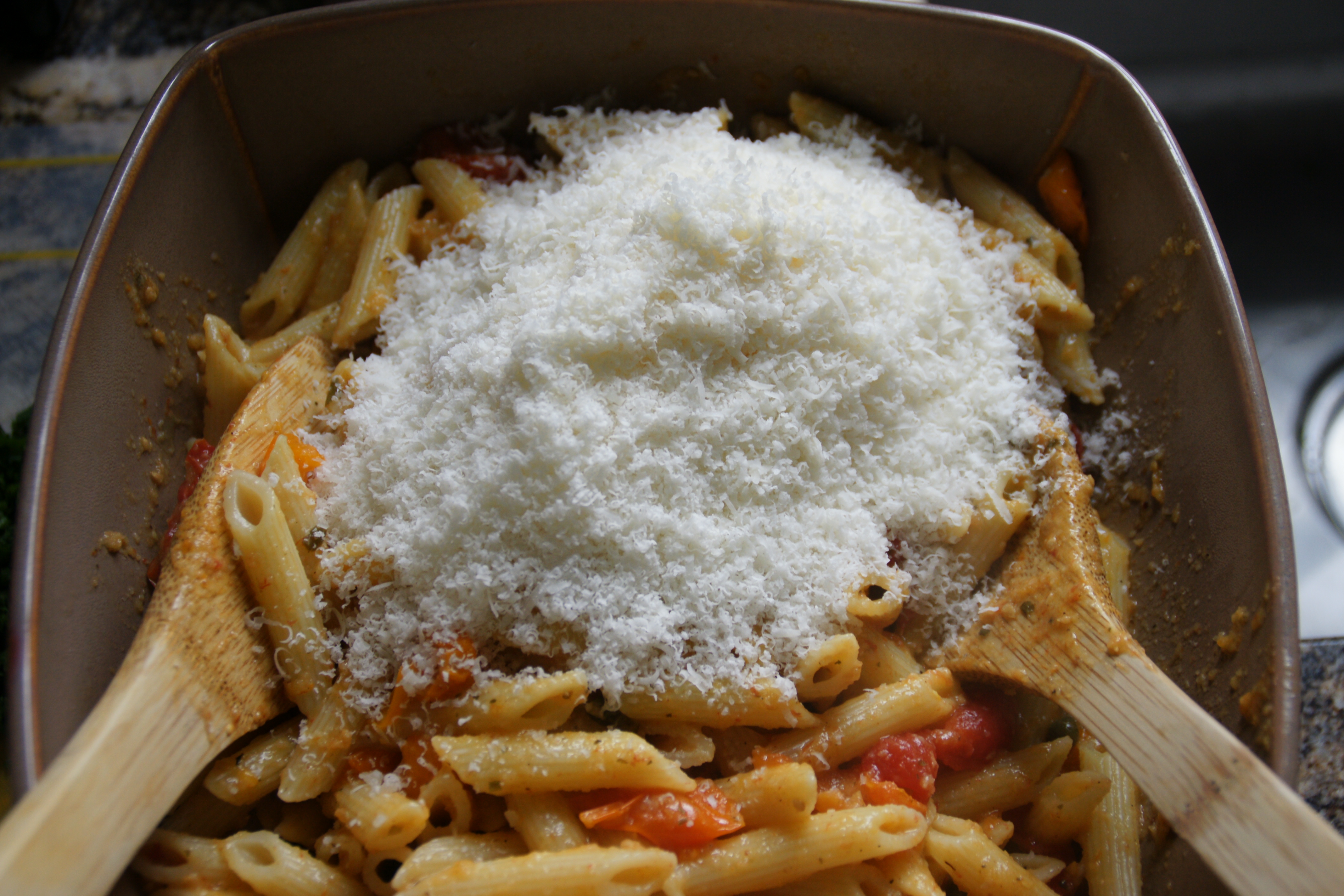 I think it’s a perfect summer meal; the original recipe from Giada is here. Although it’s still early in the season for tomatoes, store-bought cherry tomatoes are usually pretty good year-round. Most groceries now sell a combination pack of red, yellow and orange cherry tomatoes that are wonderful in this dish, but any combination (even just reds on their own) will work. The remaining ingredients are items most families have in their pantry: pasta, Italian bread crumbs, etc. Since I personally do not care for the sheep milk taste of Pecorino-Romano, I substitute Parmigiano.