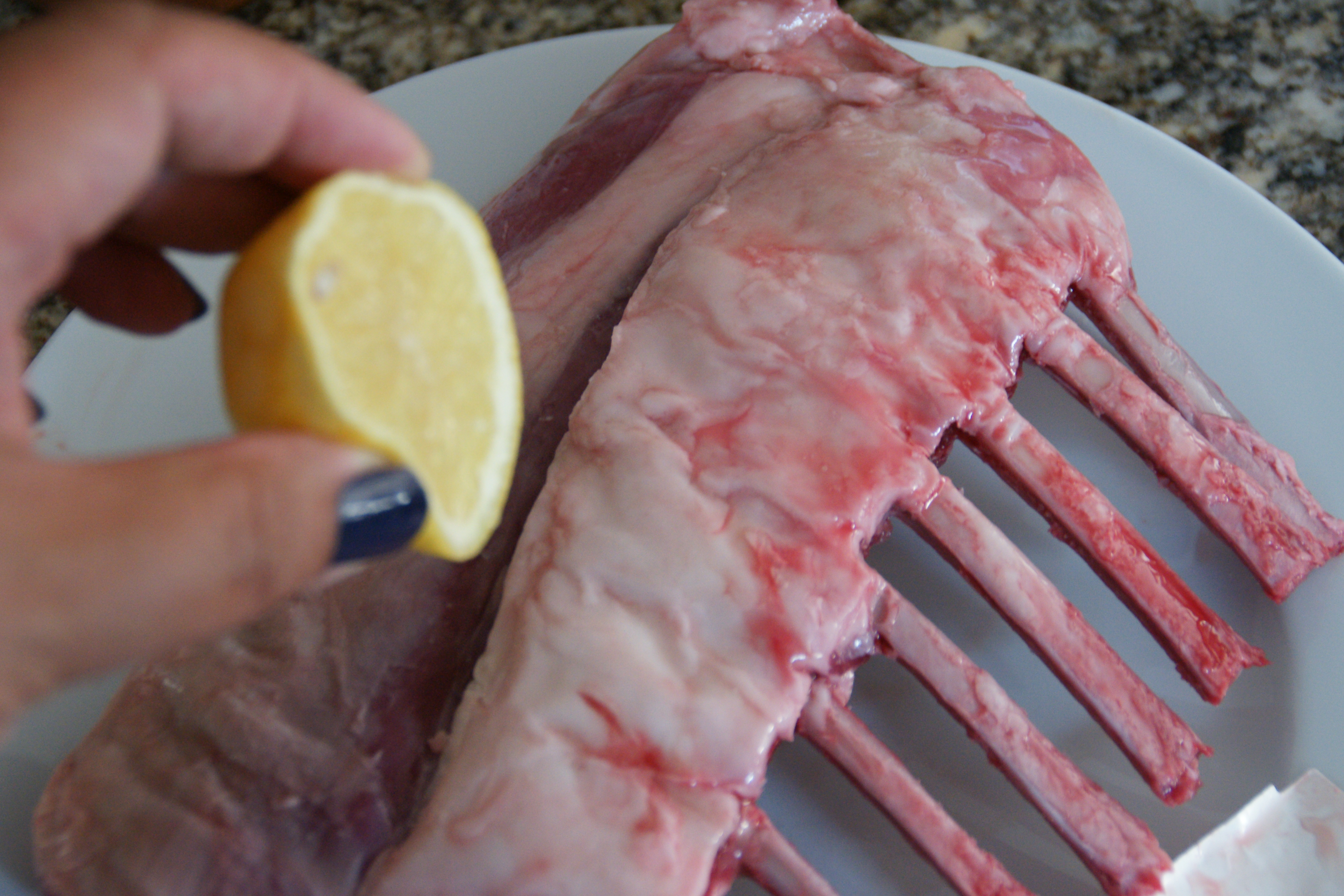 Remove lamb rack from refrigerator and rub all over with lemon juice.