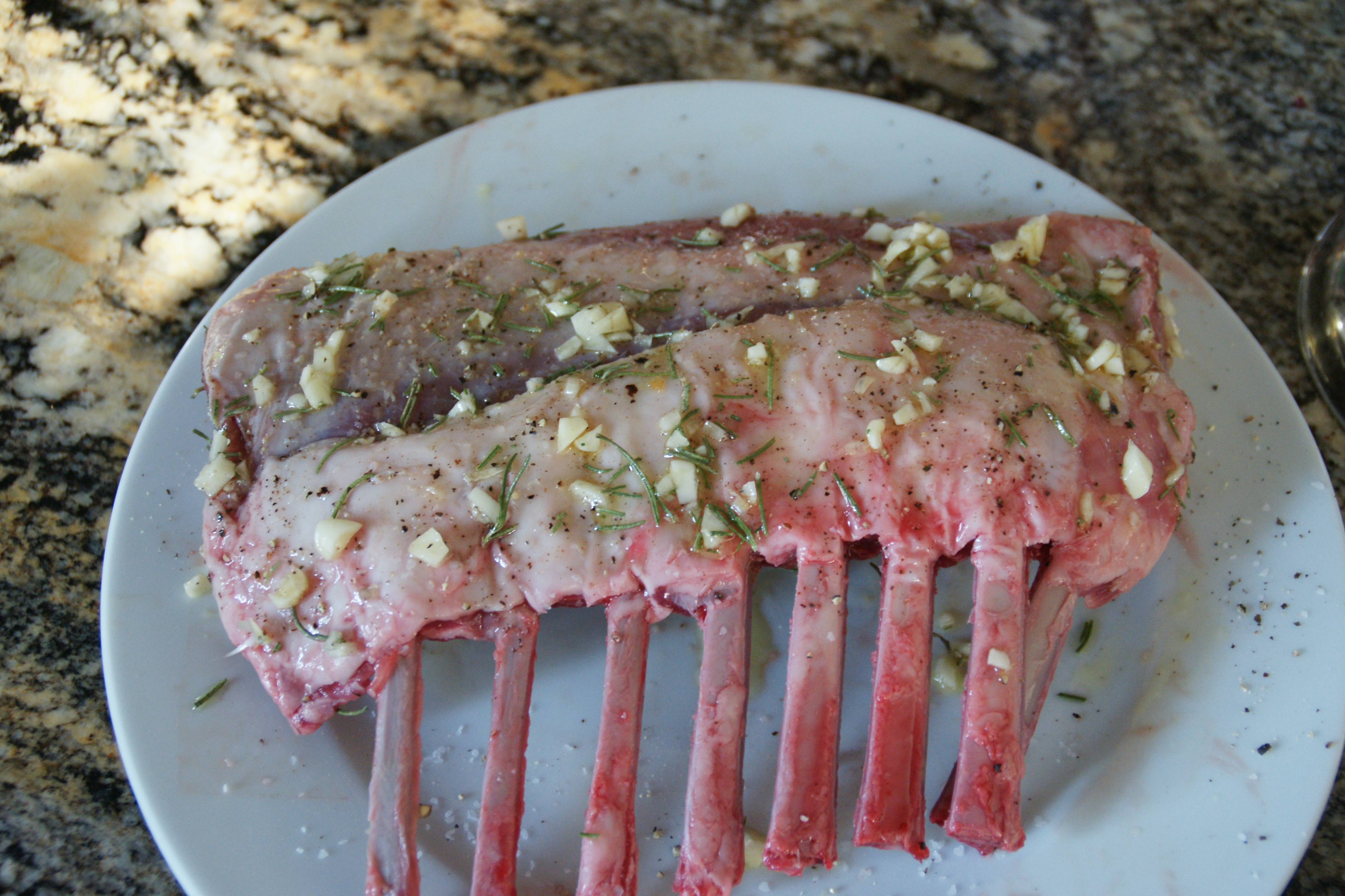 Pour the garlic/rosemary mixture over the rack and rub all over, particularly across the fatty side of the rack.