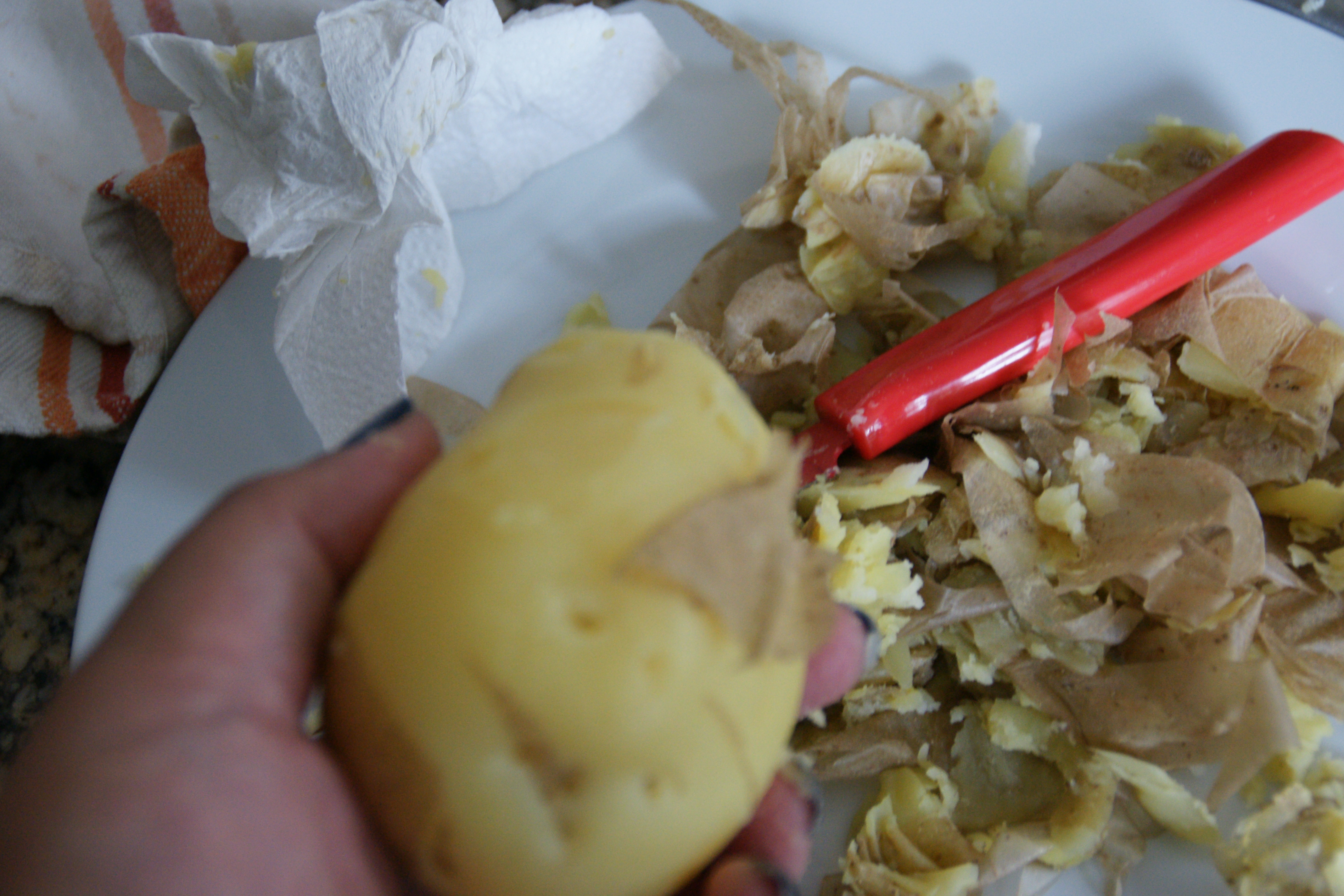 When you cook potatoes in their skins, you preserve not only their flavor, but their nutrients.  However, once you drain them, it takes a while for them to cool enough to be handled and peeled.  (During this time, I boil the eggs.  Click here for my post on how to boil eggs.  There are TONS of eggs in this recipe).