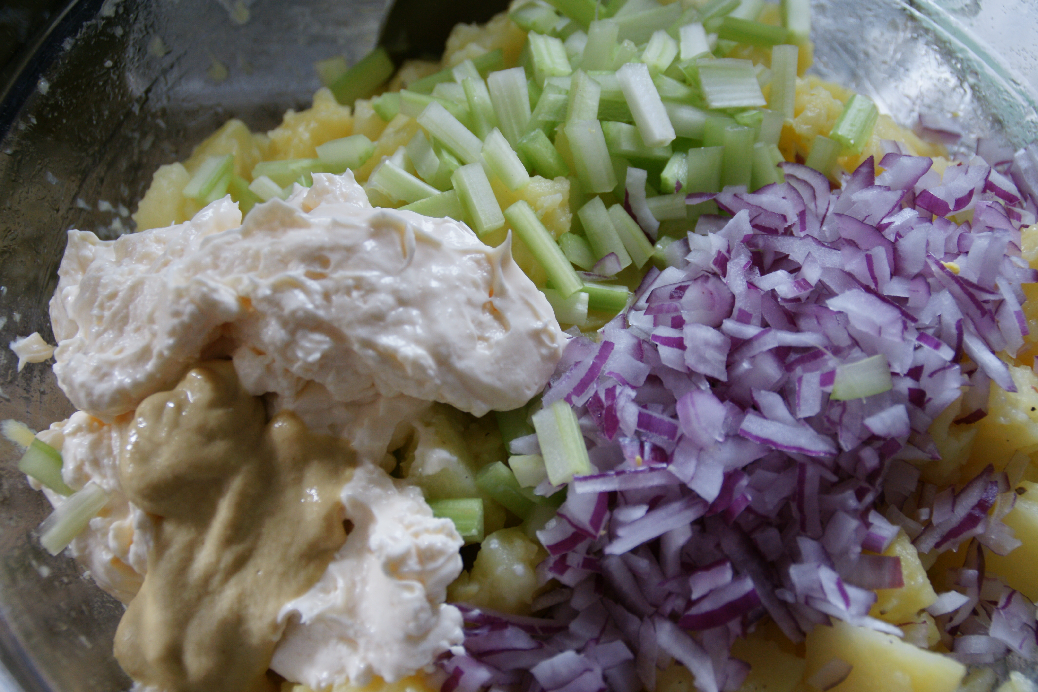 Warm potatoes. I cut mine into fairly big chunks since they break apart a bit when mixed with the other goodies