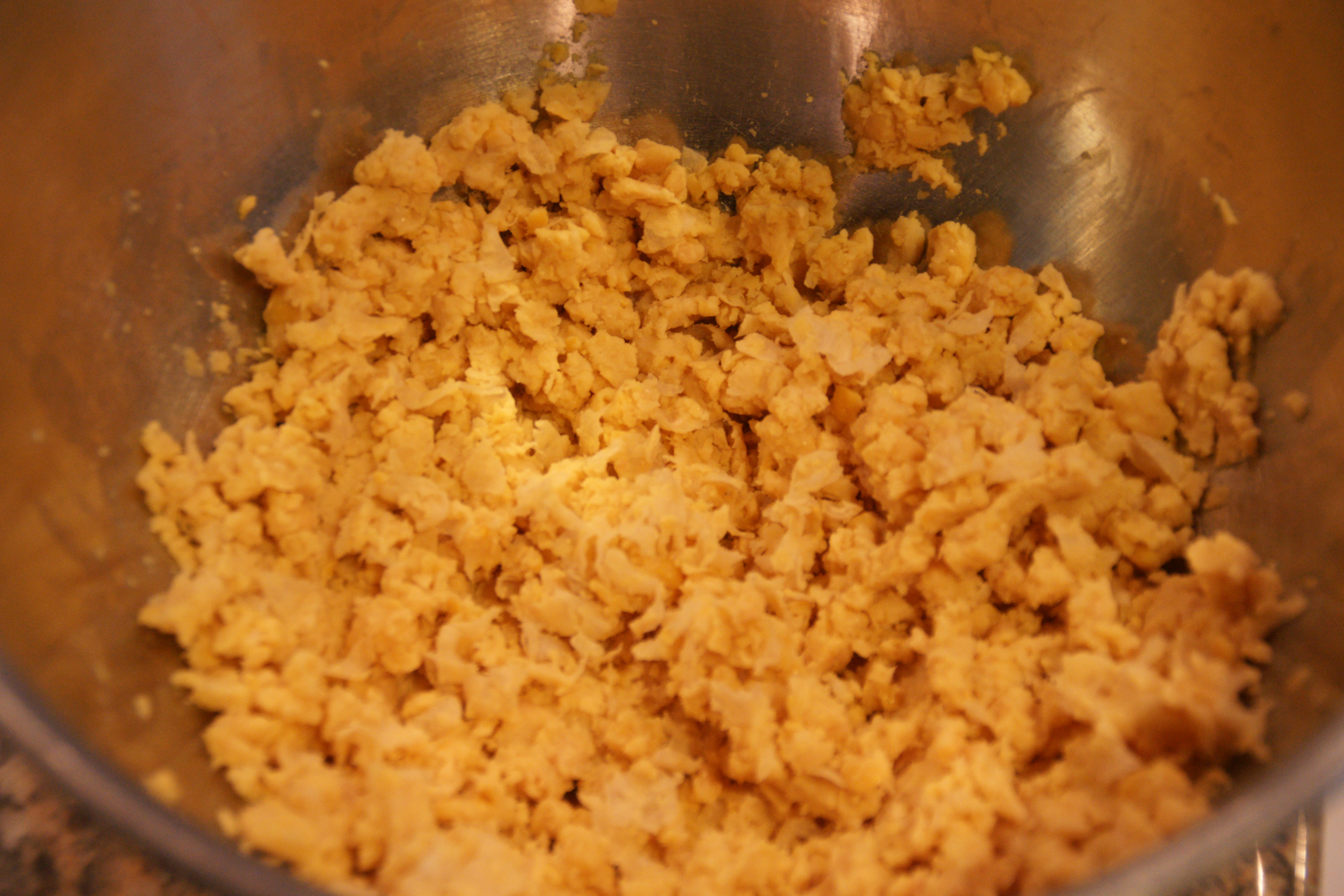 Stir in the egg/oil mixture, mixing well to incorporate the liquid into the mash. The mixture will be very sticky at this p0int. Slowly add the bread crumbs, using more or less than 1 cup until the mixture holds together when you make a small patty. The surface of the patty should be tacky, but not sticky.