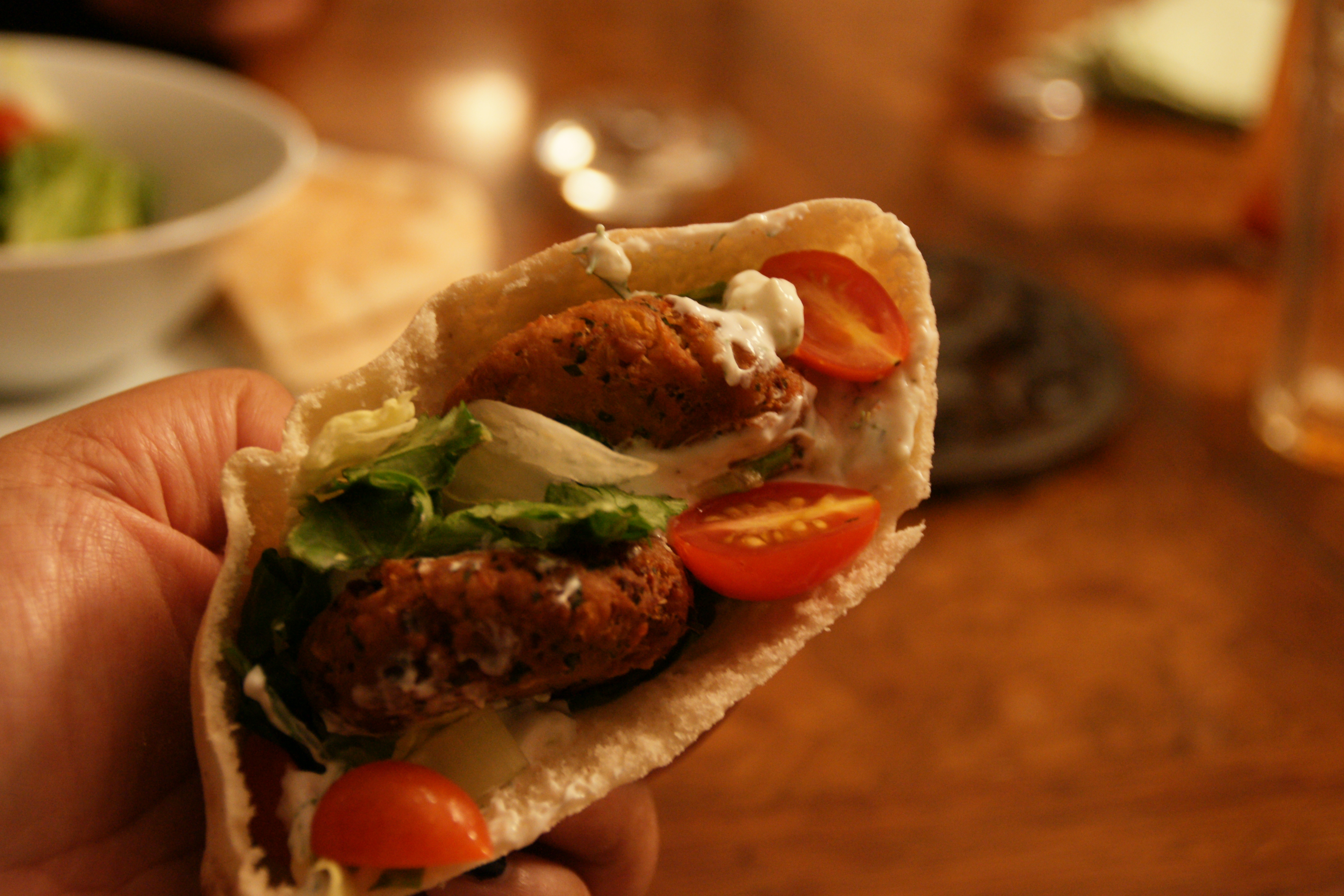 I was immediately addicted to what was wrapped in the shiny foil package: soft pita stuffed with crunchy patties of mashed chickpeas redolent of warm Middle Eastern spices, the heat tempered by a cool cucumber yogurt sauce that I later learned was called tzatziki.