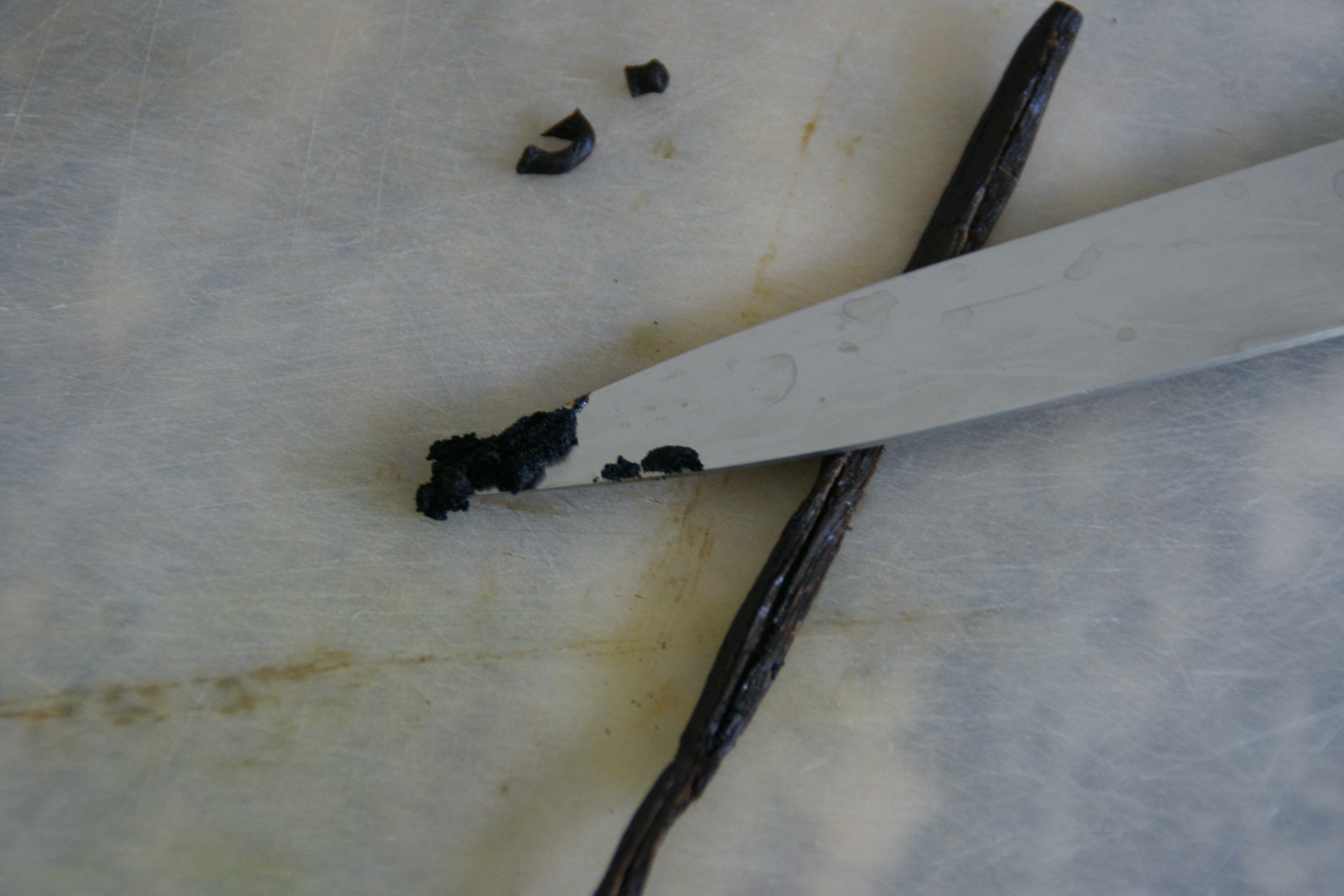 Trim the ends off the vanilla bean and slit open the bean lengthwise, taking care not to cut the bean all the way through.  Using the tip of the knife, open up one end and scrape the vanilla bean seeds from the pod.  Set aside.