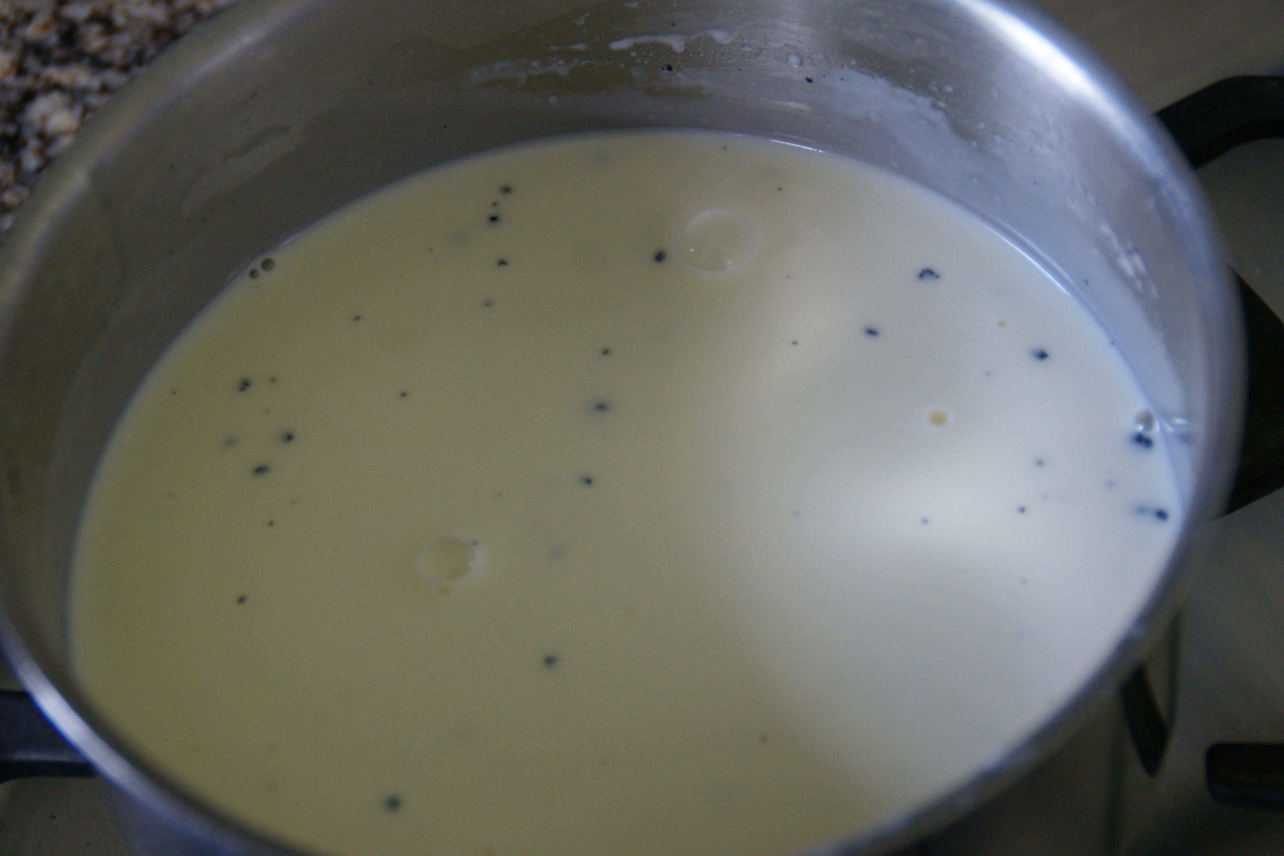 Pour the cream mixture into a sauce pan and add the scraped vanilla seeds (and pod, if you remember).  Set the pan over medium-low heat.  Hold onto the measuring cup for later.  Heat milk to a scald, e.g., bubbles just forming around the edge of the pan.  Remove pan from the heat.