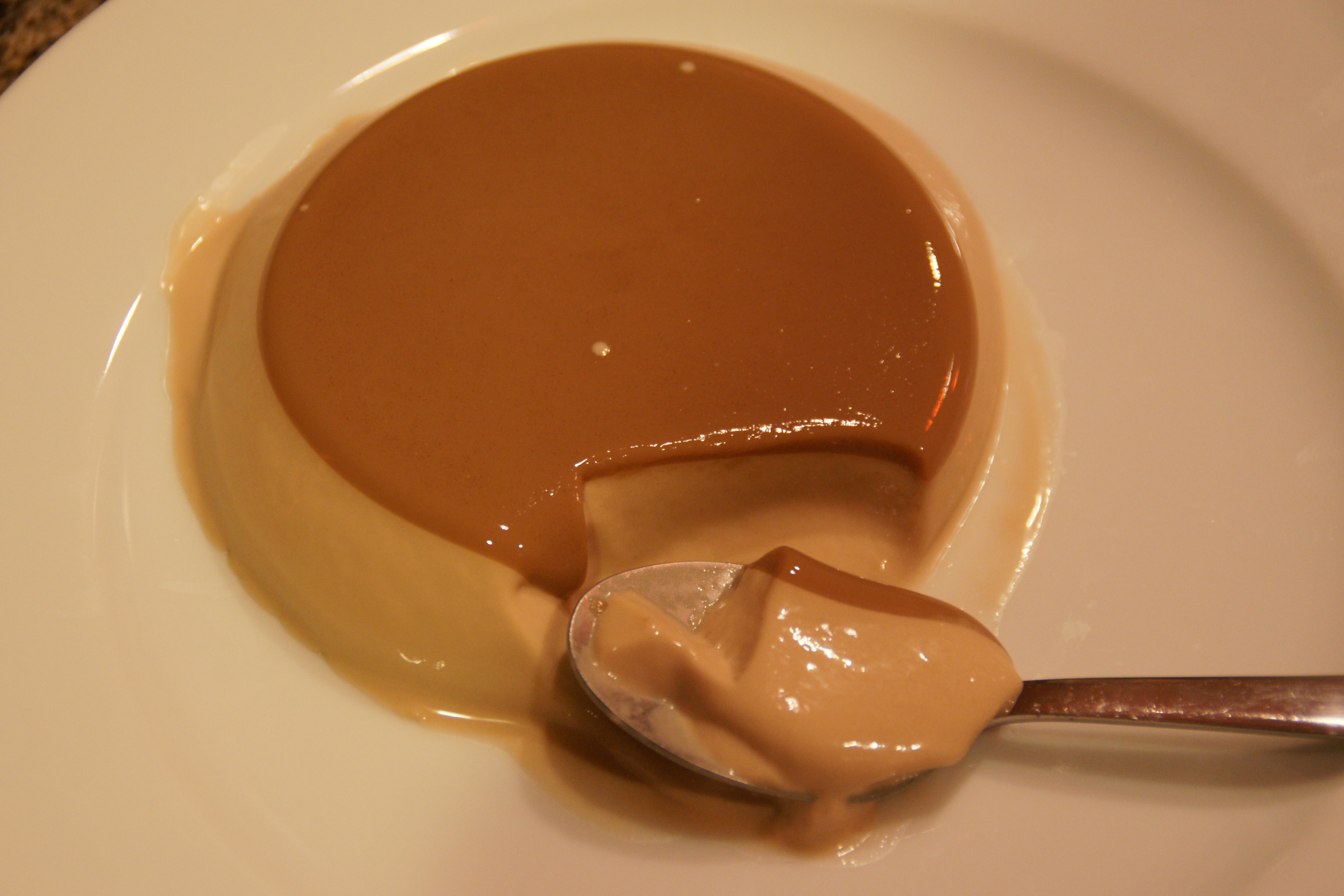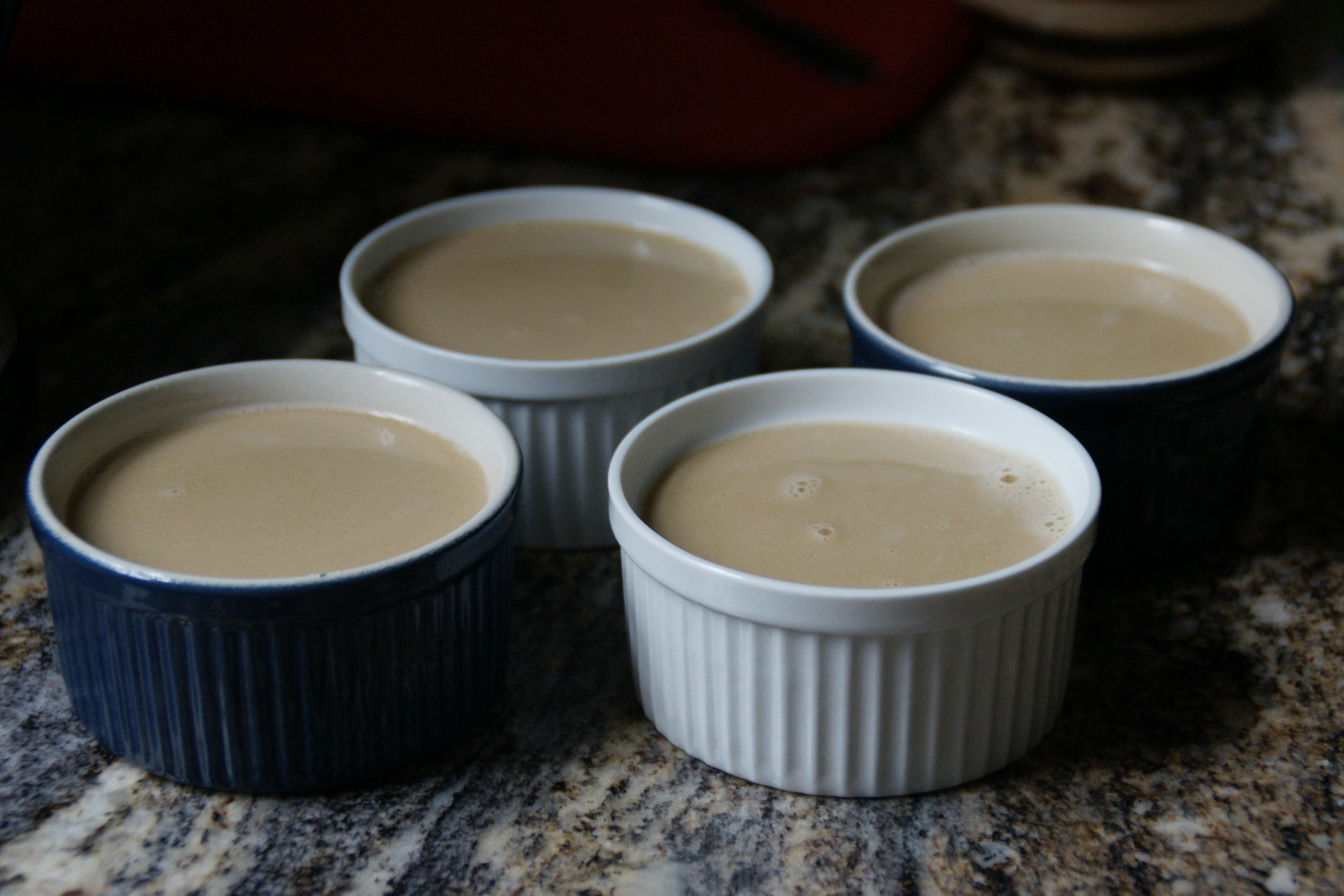 When I made this for the first time, both Kurt and I thought the flavor was excellent– not intense, rather more like cafe au lait, but the texture was off-putting– what I deemed “just this side of slime.”  It was way too soft for our liking.  I even let one of the ramekins set overnight, with no added firmness.  I’ve never had a problem with the vanilla recipe, but I switched out the milk for buttermilk.