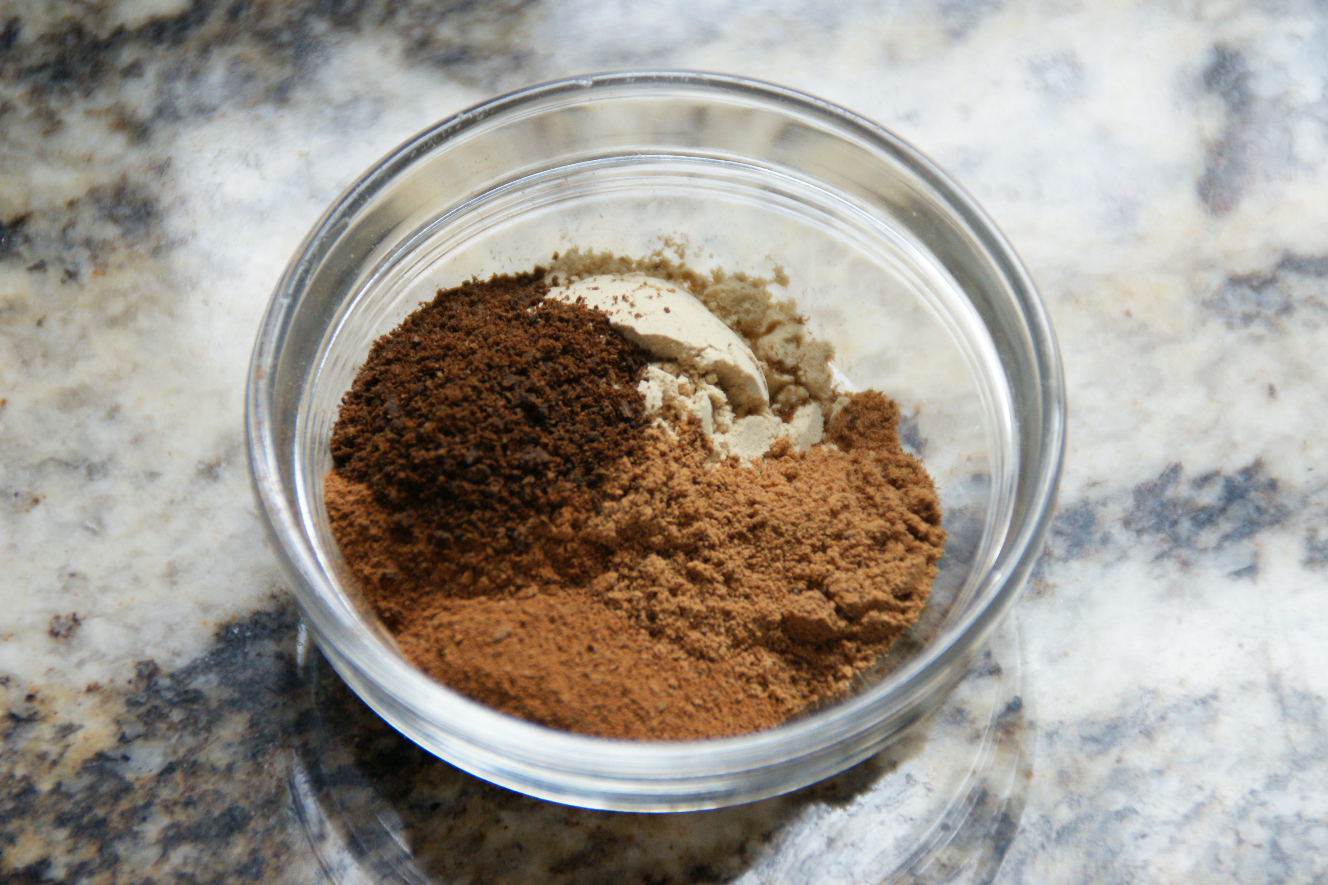 Measure the spices into a small bowl.  (I use a teeny bowl from an old set of W-S glass mixing bowls that Grace gave me decades ago– glad I kept them because the new versions are much thinner and smaller volume).