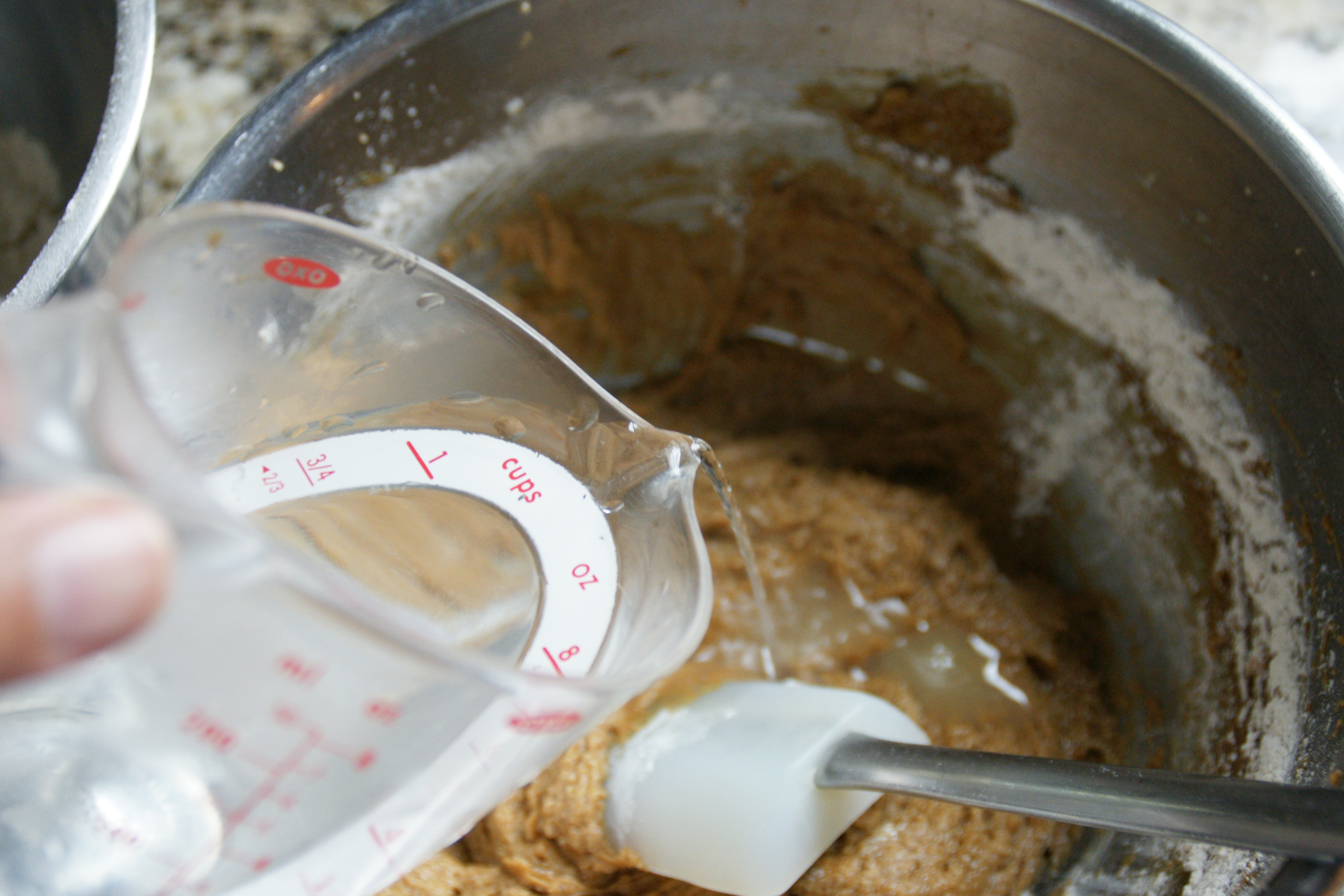 Heat the water (e.g., in the microwave) til boiling.  Add about half the flour into the butter/sugar mixture and blend well.